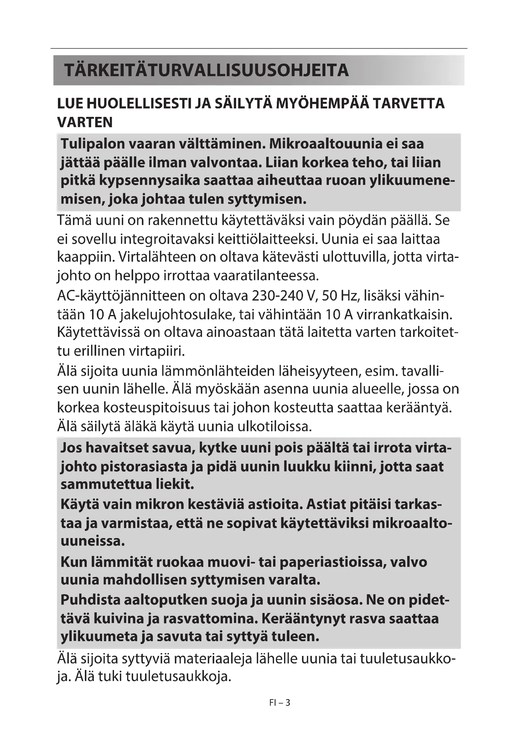 LUE HUOLELLISESTI JA SÄILYTÄ MYÖHEMPÄÄ TARVETTA VARTEN Tulipalon vaaran välttäminen. Mikroaaltouunia ei saa jättää päälle ilman valvontaa. Liian korkea teho, tai liian pitkä kypsennysaika saattaa aiheuttaa ruoan ylikuumene- misen, joka johtaa tulen syttymisen. Tämä uuni on rakennettu käytettäväksi vain pöydän päällä. Se ei sovellu integroitavaksi keittiölaitteeksi. Uunia ei saa laittaa kaappiin. Virtalähteen on oltava kätevästi ulottuvilla, jotta virta- johto on helppo irrottaa vaaratilanteessa. AC-käyttöjännitteen on oltava 230-240 V, 50 Hz, lisäksi vähin- tään 10 A jakelujohtosulake, tai vähintään 10 A virrankatkaisin. Käytettävissä on oltava ainoastaan tätä laitetta varten tarkoitet- tu erillinen virtapiiri. Älä sijoita uunia lämmönlähteiden läheisyyteen, esim. tavalli- sen uunin lähelle. Älä myöskään asenna uunia alueelle, jossa on korkea kosteuspitoisuus tai johon kosteutta saattaa kerääntyä. Älä säilytä äläkä käytä uunia ulkotiloissa. Jos havaitset savua, kytke uuni pois päältä tai irrota virta- johto pistorasiasta ja pidä uunin luukku kiinni, jotta saat sammutettua liekit. Käytä vain mikron kestäviä astioita. Astiat pitäisi tarkas- taa ja varmistaa, että ne sopivat käytettäviksi mikroaalto- uuneissa. Kun lämmität ruokaa muovi- tai paperiastioissa, valvo uunia mahdollisen syttymisen varalta. Puhdista aaltoputken suoja ja uunin sisäosa. Ne on pidet- tävä kuivina ja rasvattomina. Kerääntynyt rasva saattaa ylikuumeta ja savuta tai syttyä tuleen. Älä sijoita syttyviä materiaaleja lähelle uunia tai tuuletusaukko- ja. Älä tuki tuuletusaukkoja. FI – 4FI FI – 3 FI – 4FI – 4 Poista ruoasta ja pakkauksista kaikki metalliset tiivisteet, me- talliset sulkimet tms., metallipintojen kipinöinti voi aiheuttaa tulipalon. Älä käytä mikroaaltouunia uppopaistoöljyn kuumentamiseen. Lämpötilaa ei voi säätää ja öljy saattaa syttyä tuleen. Käytä popcornin valmistamiseen vain erityisiä mikropopcorn- pakkauksia. Älä säilytä uunissa ruokaa tai muita tavaroita. Tarkista säädöt uunin käynnistämisen jälkeen varmistaaksesi, että uuni toimii halutulla tavalla. Älä jätä uunia vahtimatta, kun se on toiminnassa. Älä jätä uunia vahtimatta, kun se on toiminnassa. Ole erityisen varovainen valmistaessasi tai lämmittäessäsi ruokia, joissa on paljon rasvaa tai sokeria (esim. makkarat, piirakat, jouluvanu- kas, jne.). Katso vastaavat vihjeet käyttöoppaasta. Tapaturmariskin välttäminen. VAROITUS: Älä käytä vahingoittunutta tai viallisesti toimivaa uunia. Tarkis- ta seuraavat seikat ennen käyttöä: a) Varmista, että luukku sulkeutuu kunnolla ja että se on ehjä ja suorassa. b) Varmista, etteivät saranat ja turvasalvat ole rikki tai irti. c) Varmista, etteivät luukun tiivisteet ja tiivistepinnat ole vaurioituneita. d) Varmista, ettei uunin sisätilassa ja luukussa ole lovia tai kuhmuja. e) Varmista, että virtajohto ja pistotulppa ovat ehjiä. Jos luukku tai luukun tiivisteet ovat viallisia, laitetta ei saa käyt- tää, ennen kuin pätevä korjaaja on korjannut sen. Älä koskaan säädä, korjaa tai muokkaa uunia itse. Muiden kuin ammattilaisten on vaarallista suorittaa sellaisia huol- to- tai korjaustoimenpiteitä, joiden yhteydessä mikroaal- toenergialta suojaava suojus irrotetaan. Älä käytä uunia luukku auki tai muuta luukun turvasalpojaFI – 5FI – 5 millään tavalla. Älä käytä uunia, jos luukun tiivisteiden ja tiivis- tyspintojen välillä on esine. Älä anna rasvan tai lian kerääntyä luukun tiivisteisiin ja lä- heisiin osiin. Puhdista uuni säännöllisin väliajoin ja poista kaikki ruuantähteet. Noudata ohjeita ''Hoito ja puhdistus”. Pidä uuni puhtaana, sillä muuten uuni saattaa aiheuttaa pintojen vioittumisen. Tämä saattaa lyhentää laitteen käyttöikää ja saada mah- dollisesti aikaan vaarallisia tilanteita. Henkilöiden joilla on TAHDISTIN pitäisi keskustella lääkärin tai tahdistimen valmistajan kanssa mikroaaltouuneja koskevista varotoimenpiteistä. Sähköiskun vaaran välttäminen.