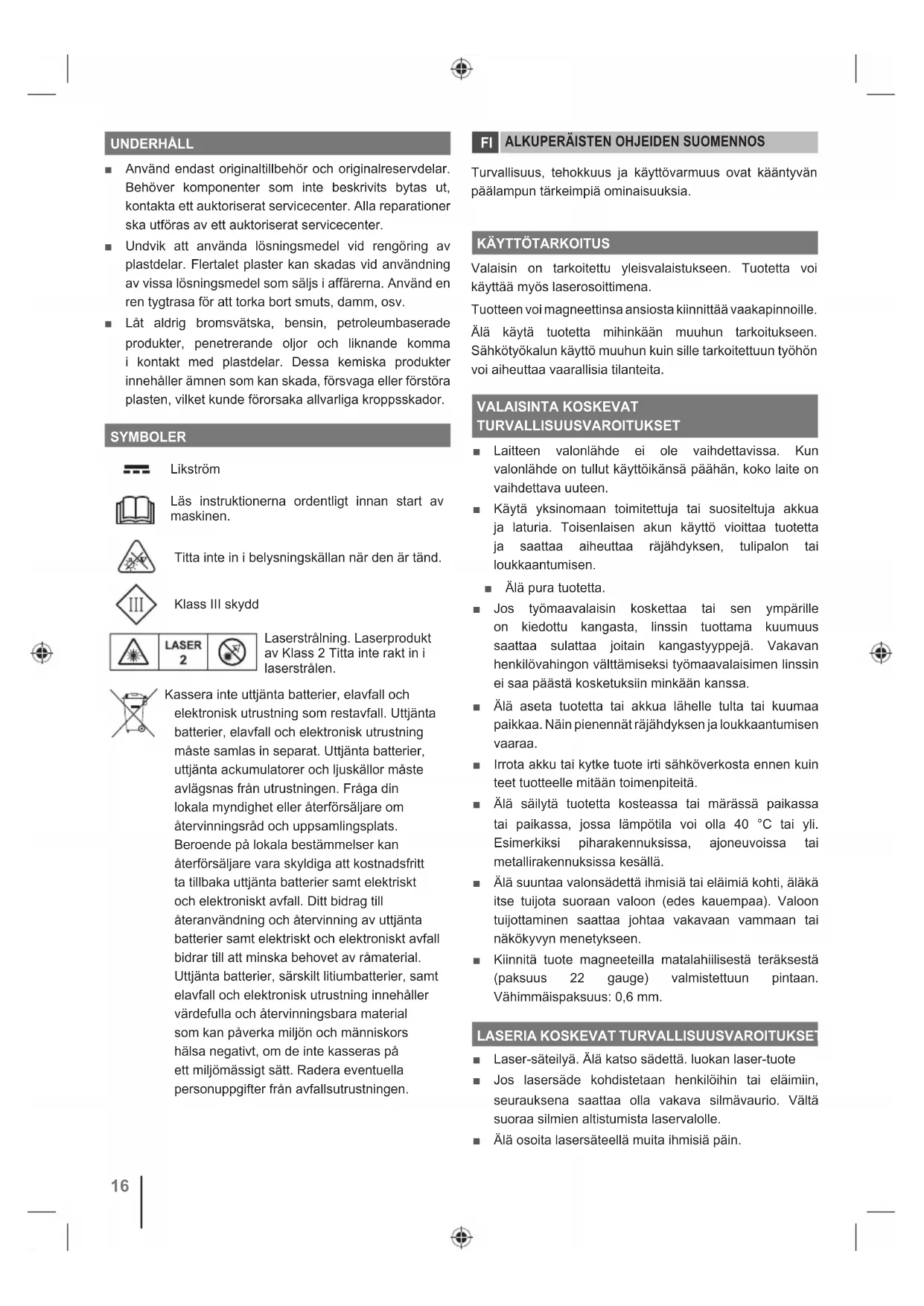 Valaisin on tarkoitettu yleisvalaistukseen. Tuotetta voi käyttää myös laserosoittimena. Tuotteen voi magneettinsa ansiosta kiinnittää vaakapinnoille. Älä käytä tuotetta mihinkään muuhun tarkoitukseen. Sähkötyökalun käyttö muuhun kuin sille tarkoitettuun työhön voi aiheuttaa vaarallisia tilanteita. VALAISINTA KOSKEVAT TURVALLISUUSVAROITUKSET Ŷ Laitteen valonlähde ei ole vaihdettavissa. Kun valonlähde on tullut käyttöikänsä päähän, koko laite on vaihdettava uuteen. Ŷ Käytä yksinomaan toimitettuja tai suositeltuja akkua ja laturia. Toisenlaisen akun käyttö vioittaa tuotetta ja saattaa aiheuttaa räjähdyksen, tulipalon tai loukkaantumisen. Ŷ Älä pura tuotetta. Ŷ Jos työmaavalaisin koskettaa tai sen ympärille on kiedottu kangasta, linssin tuottama kuumuus saattaa sulattaa joitain kangastyyppejä. Vakavan henkilövahingon välttämiseksi työmaavalaisimen linssin ei saa päästä kosketuksiin minkään kanssa. Ŷ Älä aseta tuotetta tai akkua lähelle tulta tai kuumaa paikkaa. Näin pienennät räjähdyksen ja loukkaantumisen vaaraa. Ŷ Irrota akku tai kytke tuote irti sähköverkosta ennen kuin teet tuotteelle mitään toimenpiteitä. Ŷ Älä säilytä tuotetta kosteassa tai märässä paikassa tai paikassa, jossa lämpötila voi olla 40 °C tai yli. Esimerkiksi piharakennuksissa, ajoneuvoissa tai metallirakennuksissa kesällä. Ŷ Älä suuntaa valonsädettä ihmisiä tai eläimiä kohti, äläkä itse tuijota suoraan valoon (edes kauempaa). Valoon tuijottaminen saattaa johtaa vakavaan vammaan tai näkökyvyn menetykseen. Ŷ Kiinnitä tuote magneeteilla matalahiilisestä teräksestä (paksuus 22 gauge) valmistettuun pintaan. Vähimmäispaksuus: 0,6 mm.