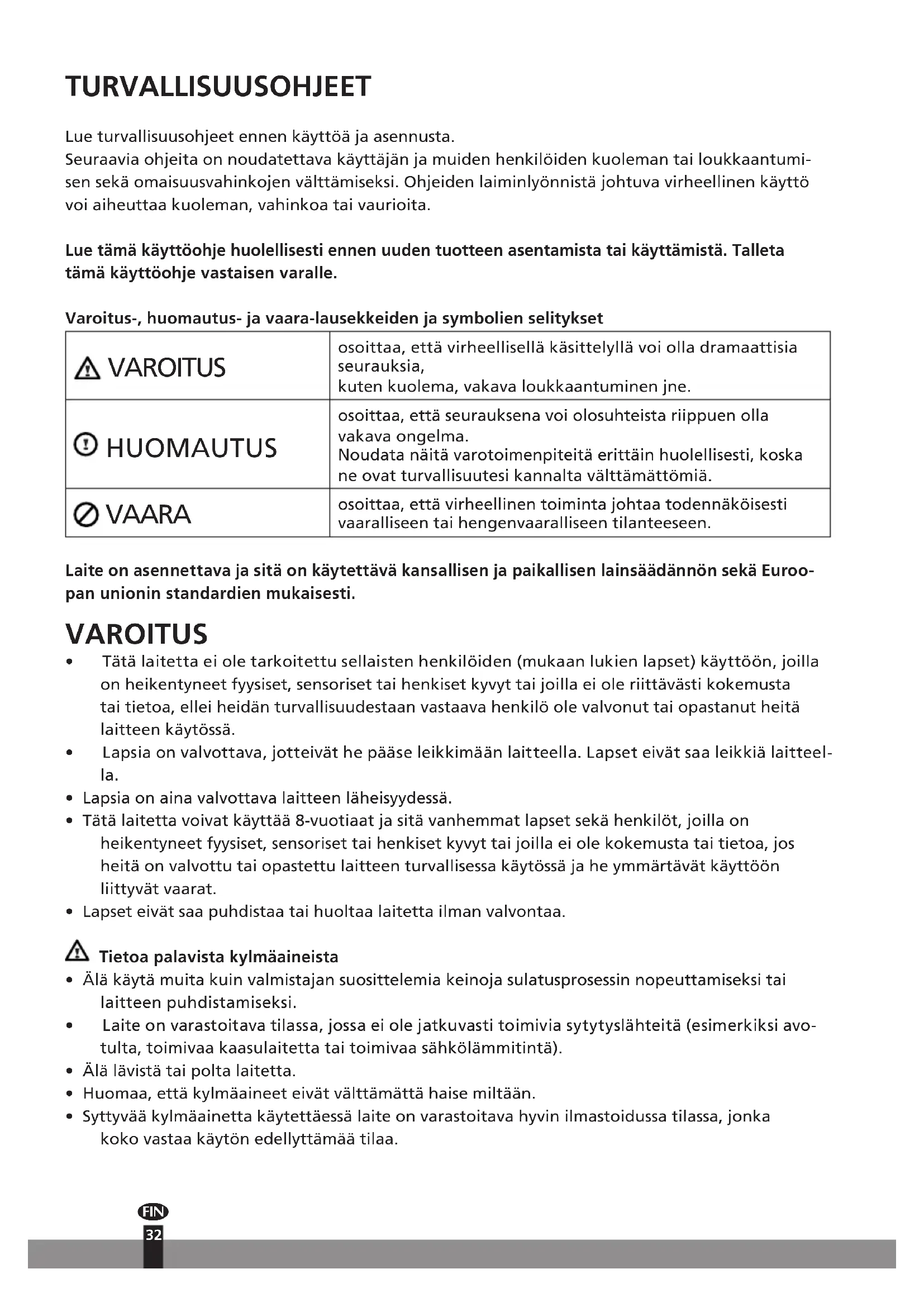 - Lapset eivät saa puhdistaa tai huoltaa laitetta ilman valvontaa. Tietoa palavista kylmäaineista