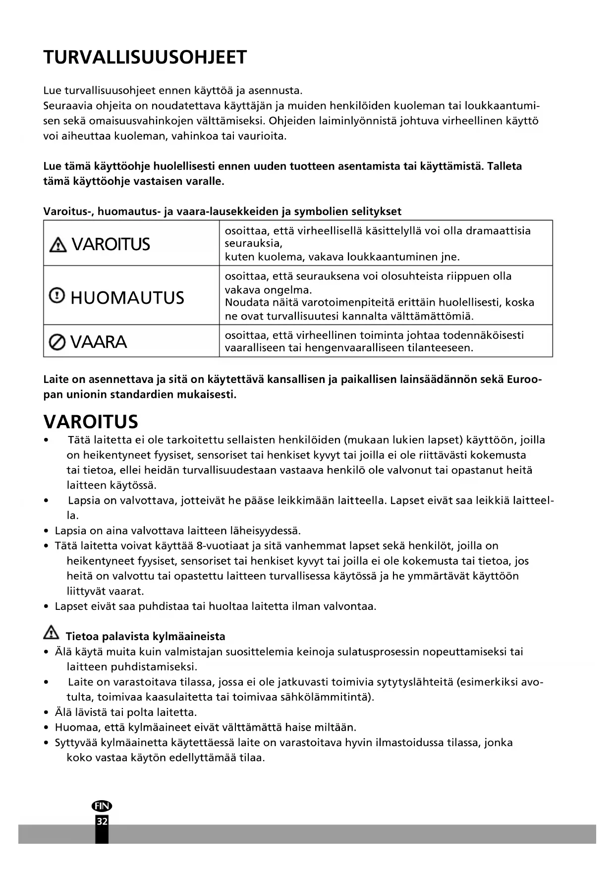 - Tätä laitetta voivat käyttää 8-vuotiaat ja sitä vanhemmat lapset sekä henkilöt, joilla on heikentyneet fyysiset, sensoriset tai henkiset kyvyt tai joilla ei ole kokemusta tai tietoa, jos heitä on valvottu tai opastettu laitteen turvallisessa käytössä ja he ymmärtävät käyttöön liittyvät vaarat.