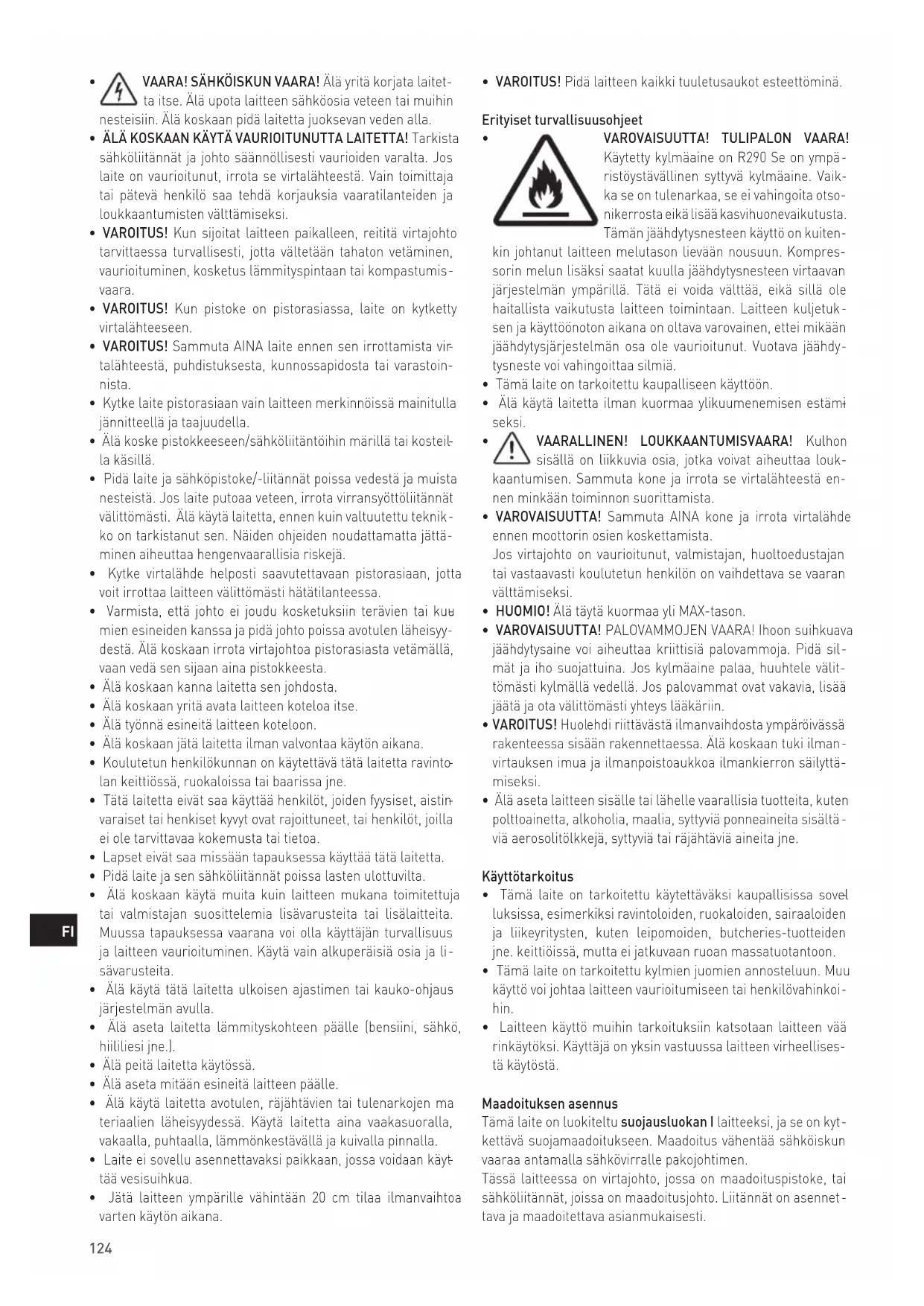 - VAROVAISUUTTA! PALOVAMMOJEN VAARA! Ihoon suihkuava jäähdytysaine voi aiheuttaa kriittisiä palovammoja. Pidä sil