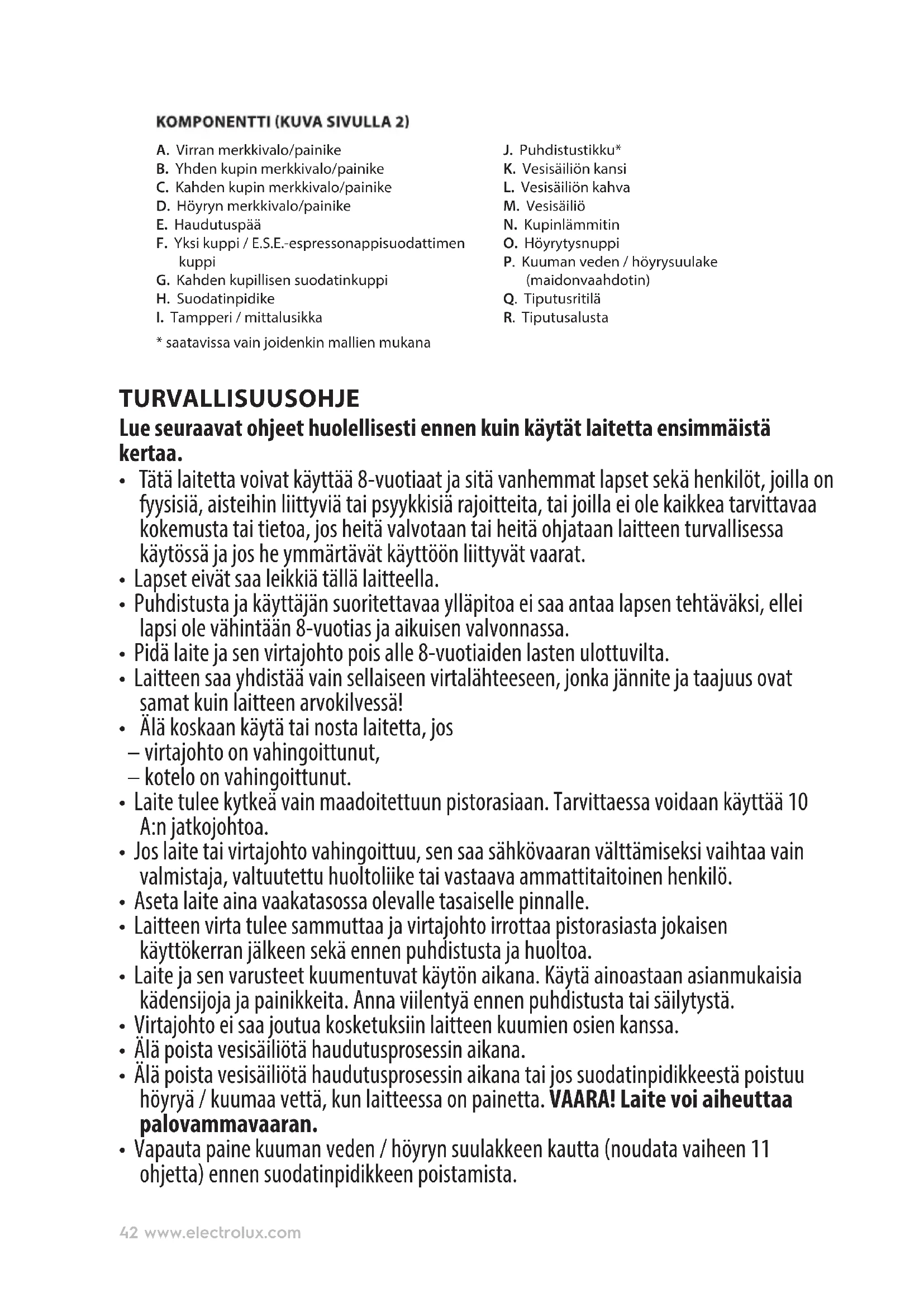 - Enimmäisaika, jonka laite tarvitsee siirtyäkseen automaattisesti sovellettavaan virransäästötilaan: 20 min. ohjauksen avulla. Tämä laite on tarkoitettu käytettäväksi kotitalousympäristössä ja vastaavissa käyttöympäristöissä, kuten – kauppojen, toimistojen ja muiden työpaikkojen henkilökuntakeittiöissä; – maatiloilla; – asiakkaiden toimesta hotelleissa, motelleissa ja muissa asuinympäristöissä; – majoituksen ja aamiaisen tarjoa vissa majoitusympäristöissä. ALOITTAMINEN (kuva sivuilla 3 ja 4) Käynnistä kone ensimmäisen kerran 1 Aseta laite aina vaakatasossa olevalle tasaiselle pinnalle. Käynnistä kone valmiustilassa kytkemällä se sähköverkkoon, kun painike käynnistyy puoliksi. Täytä vesisäiliö puhtaalla vedellä. Aseta suodatink- uppi suodatinkahvaan ja kiinnitä se sitten haudutuspäähän kääntämällä sitä vastapäivään asennosta ”INSERT” asentoon ”LOCK” ilman kahvijauhetta. Varmista, että nuppi on vaakasuuntaisessa asennossa (asento ”OFF”). 2 Käynnistä kone painamalla painiketta , jonka valo syttyy kokonaan, ja painikkeet alkavat vilkkua. 3 Kun painikkeet alkavat vilkkua, esikuumennus on suoritettu. Käynnistä haudutus painamalla painiketta . HUOMAUTUS: Veden pumppaaminen voi ensimmäisellä kerralla aiheuttaa hieman melua. Tämä on normaalia. Laitteen sisältä tulee ilmaa. Ääni lakkaa kuulumasta 20 sekunnin kuluttua. 4 Kun haudutus on valmis, poista suodatinkahva kääntämällä sitä myötäpäivään, puhdista suodatin ja tyhjennä tiputusastia. Nyt laite on käyttövalmis. HUOMAUTUS: Laitteen virta sammuu automaattisesti, kun laite on 20 minuuttia käyttämättä.44 www.electrolux.com Valmista espressokahvia 5 Aseta yhden kupillisen suodatin suodatinkahvaan. Lisää lusikallinen jauhettua kahvia, paina se tiiviisti tampperilla tai lisää E.S.E-espressonappi ja lisää se suodatinkuppiin. E.S.E (Easy Serving Espresso) -na- peilla voidaan helpottaa espresson valmistusta. Jokaisessa esipakatussa napissa on 7 grammaa kah- via, joka on mitattu ja painettu valmiiksi sekä suljettu kahdella ohuella suodatinpaperikerroksella. 6 Kiinnitä suodatin haudutuspäähän kääntämällä sitä vastapäivään asennosta ”INSERT” asentoon ”LOCK”. 7 Aseta lämmin kuppi tiputusastialle. Esikuumennus valmis -tilassa, kun painikkeissa ja ja palaa tasaisesti valo, käynnistä haudutus painamalla painiketta . 8 Odota hetki, niin koneesta alkaa valua huippuluokan kahvia. Kun kone on lopettanut, kahvi on valmista. 9 Käytä nyt kahden kupillisen suodatinkuppia. Paina painiketta . Valmista samanaikaisesti kaksi kupillis- ta espressoa. 10 HUOMAUTUS: Jos sekä painike että alkaa vilkkua nopeasti, voit lopettaa haudutuksen pain- amalla painiketta tai tai (vaihe 11) 11 (vaihe 10) jatkaa kahvinvalmistusta, kun höyrystin on jäähtynyt. Nuppi käännetään asentoon , jolloin höyrysuuttimesta tulee ulos kuumaa vettä. Pumppu sammuu automaattisesti, kun se on jäähtynyt. Käännä nuppi pois käytöstä ja jatka kahvinvalmistusta. Veden kuumentaminen 12 Esikuumennus valmis -tilassa, kun painikkeissa ja ja palaa tasaisesti valo, käännä nuppi asentoon on valmis. Vaahdota maito ja valmista cappuccino tai latte 13 Kaada kannuun 100 ml (cappuccinoa varten) tai 200 ml (lattea varten) maitoa. Huomautus: varmista, että kannun halkaisija on vähintään 70±5 mm ja siihen mahtuu lisätyn maidon määrä vähintään kaksinkertaisesti, koska maidon tilavuus kasvaa vaahdotettaessa. 14 Esikuumennus valmis -tilassa, kun kaikissa painikkeissa ja ja palaa tasaisesti valo, paina painiketta , kunnes se alkaa vilkkua. HUOMAUTUS: Käytä jääkaappikylmää täysmaitoa (EI KUUMAA MAITOA!). 15 Kun painikkeen vilkkuminen loppuu, höyrytys-/maidon vaahdotustoiminto on valmis. Ennen maidon vaahdotusta työnnä höyrysuulake tiputusastian suuntaan, käännä nuppi asentoon ja vapauta höyryä, kunnes vettä ei tule enää ulos, ja poista sitten höyrytoiminto käytöstä kääntämällä nuppi takaisin vaakasuuntaiseen ”OFF”-asentoon. 16 Upota höyrysuulake maitoon noin 2 cm maidonpinnan alapuolelle ja käännä nuppia. Varmista, että höy- rysuulake on käännetty sellaiseen asentoon, että maito kääntyy kannun sisällä yhteen suuntaan ylhäältä pohjalle.