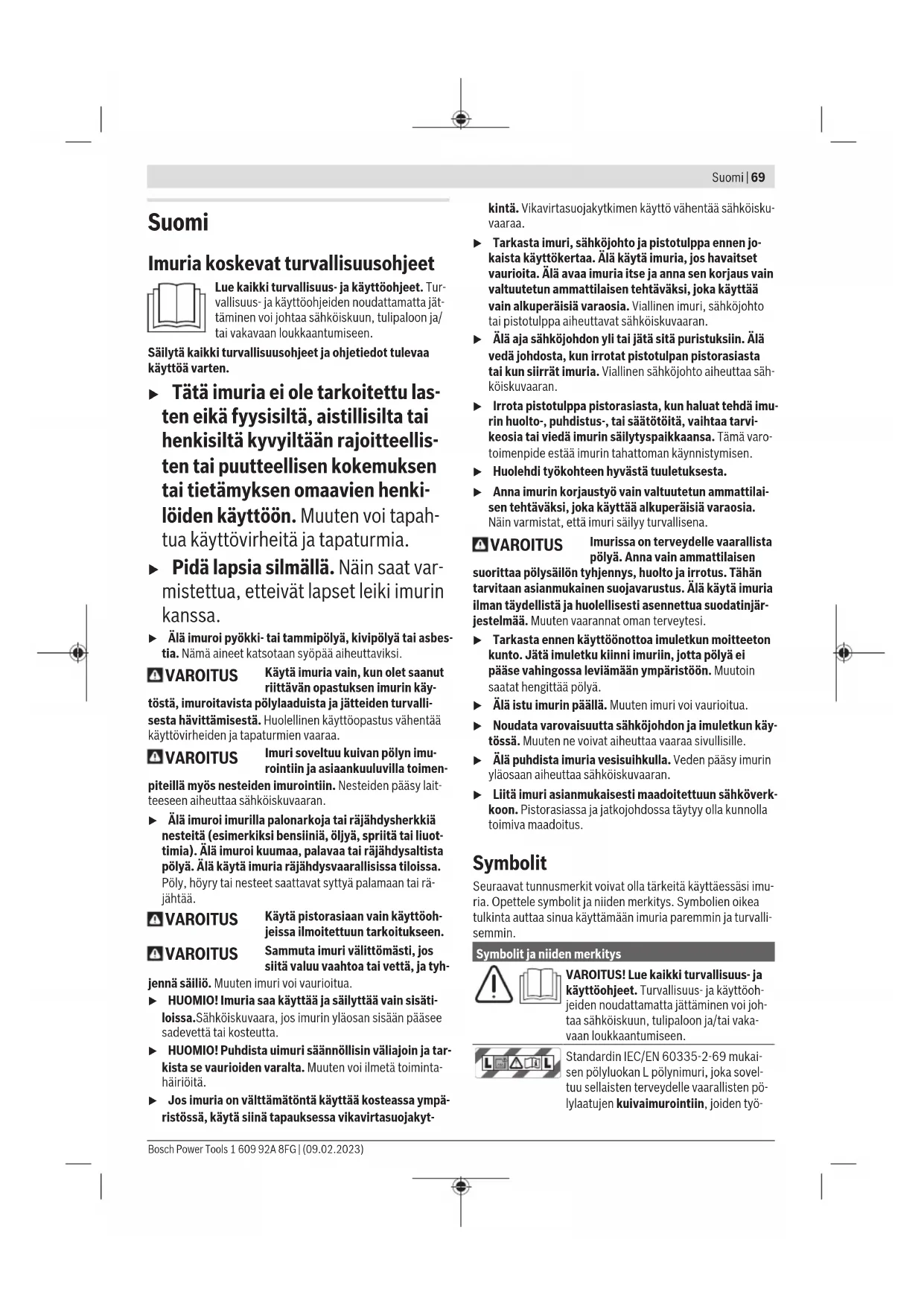 Imuria ei saa missään tapauksessa käyttää räjähdysvaaralli- sissa tiloissa. Imutehon optimoimiseksi imuletku (17) täytyy aina kelata kokonaan auki imurin yläosasta (6). Kuivaimurointi Kertyneen pölyn imurointi – Käynnistä imuri painamalla lyhyesti käynnistyspainiketta (4). – Sammuta imuri painamalla uudelleen käynnistyspaini- ketta (4). Suora imurointi sähkötyökalulta (katso kuva E) u Huoneessa on oltava riittävän tehokas ilmanvaihto (L), jos poistoilma johdetaan takaisin huoneeseen. Noudata vastaavia maakohtaisia määräyksiä. Imuri on varustettu turvapistorasialla(3). Siihen voit liittää ulkoisen sähkötyökalun. Muista huomioida imuriin kytketyn sähkötyökalun suurin sallittu liitäntäteho. – Asenna imuadapteri (18). – Kytke imuadapteri (18) sähkötyökalun pölynpoistoput- keen. Huomautus: imuadapterin (18) lisäilma-aukko (26) täytyy avata, jos käytettävät sähkötyökalut syöttävät heikosti ilmaa imuletkuun (esimerkiksi pistosahat, hiomakoneet, jne.). Vain siten puoliautomaattinen suodatinpuhdistus (SFC) voi toimia moitteettomasti. Käännä sitä varten lisäilma-aukon (26) päällä olevaa ren- gasta, kunnes aukko on mahdollisimman suuri. – Aktivoi imurin käynnistys-/pysäytysautomatiikka pai- namalla lyhyesti käynnistyspainiketta(4). – Käynnistä imuri kytkemällä pistorasiaan(3) liitetty säh- kötyökalu päälle. Imuri käynnistyy automaattisesti. – Imurointi loppuu, kun sammutat sähkötyökalun. Käynnistys-/pysäytysautomatiikan jälkikäynti toimii maks. 15sekunnin ajan, jotta imuri saa imettyä imuletkussa ole- van pölyn pois. – Kun haluat kytkeä imurin pois päältä, paina käynnistyspainiketta(4). Märkäimurointi u Älä imuroi imurilla palonarkoja tai räjähdysherkkiä nesteitä (esimerkiksi bensiiniä, öljyä, spriitä tai liuot- timia). Älä imuroi kuumaa, palavaa tai räjähdysaltista pölyä. Älä käytä imuria räjähdysvaarallisissa tiloissa. Pöly, höyry tai nesteet saattavat syttyä palamaan tai rä- jähtää. u Imuria ei saa käyttää vesipumppuna. Imuri on tarkoi- tettu ilma-vesiseoksen imurointiin. Työvaiheet ennen märkäimurointia – Avaa salvat (7) ja ota imurin yläosa (6) pois. – Poista tarvittaessa jätesäkki (20) tai pölypussi. – Tarvittaessa tyhjennä säiliö(1). – Asenna imurin yläosa (6) ja sulje salvat (7). Nesteiden imurointi – Kytke imuri päälle. Imuri on varustettu uimurilla. Kun suurin sallittu täyttöaste on saavutettu, imuri sammuu. – Kytke imuri pois päältä. – Tyhjennä säiliö(1). Tee seuraavat toimenpiteet märkäimuroinnin jälkeen homeh- tumisen ehkäisemiseksi: – Ota imurin yläosa (6) ja laskossuodatin (28) pois ja anna kaikkien osien kuivua perusteellisesti. Puoliautomaattinen suodatinpuhdistus (katso kuva F) Suodattimen puhdistusta on käytettävä viimeistään, kun imuteho on laskenut liian heikoksi. Suodattimen puhdistuksen tiheys riippuu pölyn lajista ja määrästä. Imurin suorituskyky säilyy kauemmin tehokkaana, kun suodattimen puhdistusta käytetään säännöllisin välia- join. Puoliautomaattisessa suodatinpuhdistuksessa (SFC) ilma- virtauksen suunnanvaihto puhdistaa suodatinlamellit niihin kertyneestä pölystä. Pinnaltaan likainen poimusuodatin on täysin toimintakykyi- nen. Laakapoimusuodatinta ei kannata puhdistaa manuaali- sesti koputtelemalla tai puhaltamalla ja tämä voi jopa rikkoa suodattimen. SFC-suodatinpuhdistuksen käynnistäminen – Sulje kämmenellä suulakkeen tai imuletkun aukko. – Paina 3 kertaa SFC-kytkintä (11). 1 609 92A 8FG | (09.02.2023) Bosch Power ToolsSuomi | 73 Hoito ja huolto Huolto ja puhdistus u Irrota pistotulppa pistorasiasta, kun haluat tehdä imu- rin huolto-, puhdistus-, tai säätötöitä, vaihtaa tarvi- keosia tai viedä imurin säilytyspaikkaansa. Tämä varo- toimenpide estää imurin tahattoman käynnistymisen. u Pidä imuri ja tuuletusaukot puhtaina luotettavan ja turvallisen työskentelyn varmistamiseksi. u Käytä imurin huollon ja tyhjennyksen yhteydessä hen- gityssuojainta. Jos virtajohto täytyy vaihtaa, turvallisuussyistä tämän saa tehdä vain Bosch tai valtuutettu Bosch-sähkötyökalujen huoltopiste. Kun käyttäjä huoltaa imurin, se on purettava, puhdistettava ja huollettava ohjeenmukaisesti aiheuttamatta vaaraa huolto- henkilöille ja sivullisille. Ennen purkamista imuri kannattaa puhdistaa mahdollisten vaarojen välttämiseksi. Imurin pur- kaminen tulee tehdä tehokkaasti tuuletetussa tilassa. Käytä huollon aikana suojavaatetusta. Huollon jälkeen huoltopiste tulee puhdistaa. Valmistajan tai koulutetun henkilön täytyy suorittaa vähin- tään kerran vuodessa pölytekninen tarkastus, jossa käydään läpi esim. suodattimen vauriot, imurin tiiviys ja ohjausjärjes- telmän toimivuus. Likaisessa ympäristössä käytettyjen luokan L imureiden ul- kopinta sekä kaikki koneen osat tulee puhdistaa tai käsitellä tiivisteaineella. Huolto- ja korjaustöiden yhteydessä tulee hä- vittää kaikki likaiset osat, joita ei voi puhdistaa kunnolla. Täl- laiset osat tulee pakata tiiviisiin pusseihin ja hävittää kysei- sen jätelaadun voimassaolevien hävitysmääräysten mukaan. – Puhdista imurin runko kostealla liinalla säännöllisin välia- join. Säiliön puhdistaminen – Pyyhi säiliö (1) silloin tällöin tavanomaisella, hankaamat- tomalla puhdistusaineella ja anna sen kuivua. Suodattimen puhdistus Pölysäiliön tyhjennys ja suodattimen puhdistus säännöllisin väliajoin varmistaa optimaalisen imutehon. Jos imuteho ei vieläkään parane, toimita imuri huoltoon. Suodattimen irrottaminen/vaihtaminen (katso kuvat G1- G2) Vaihda vialliset poimusuodattimet välittömästi. – Avaa salvat (7) ja ota imurin yläosa (6) pois. – Käännä suodattimen pidikettä (27) ääriasentoon kierto- suuntaan ja irrota suodattimen pidikkeen ja laskossuo- dattimen (28) yhdistelmä imurin yläosasta (6). – Vedä likainen/viallinen laskossuodatin (28) irti suodatti- men pi