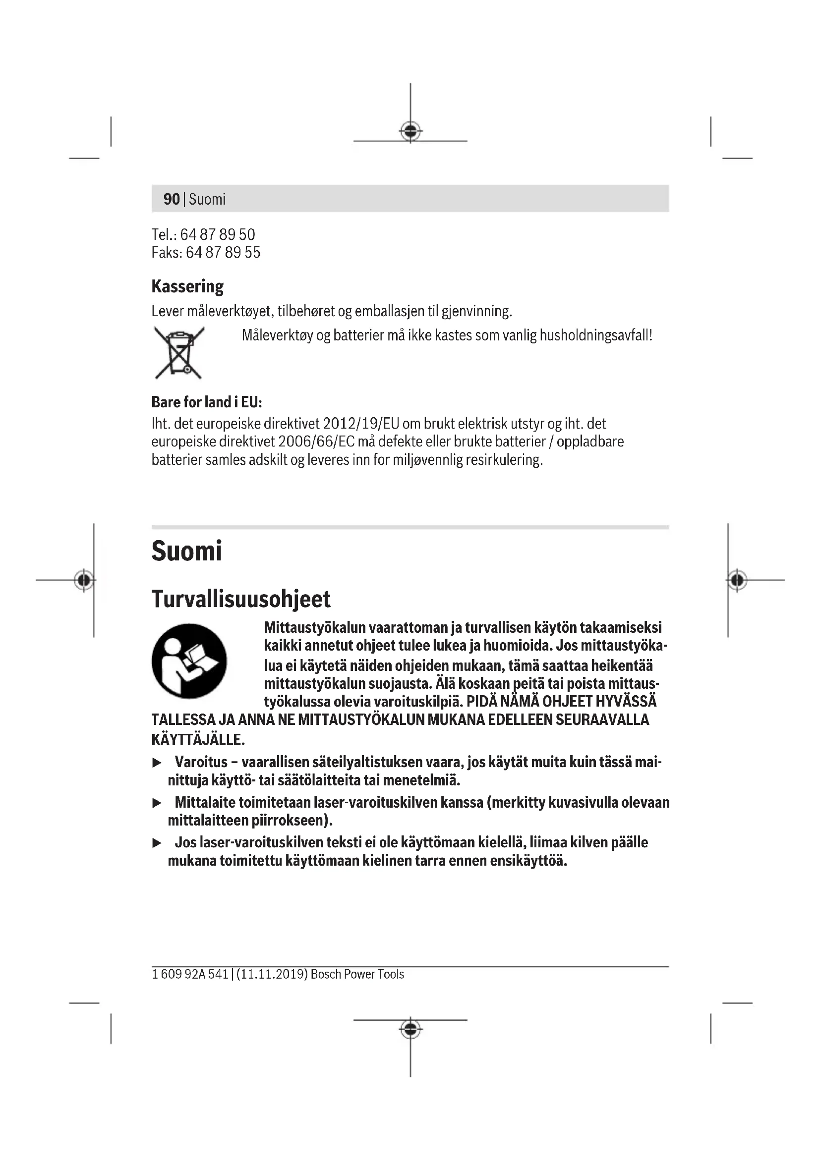 20–25°C lämpötilassa C) Koskee kahta risteyskohtaa ja niiden vastakkaisia puolia D) Ilmoitetut arvot edellyttävät normaaleja tai edullisia ympäristön olosuhteita (esim. ei tärinää, ei sumua, ei savua, ei suoraa auringonpaistetta). Voimakkaista lämpötilan vaihteluista voi seurata tarkkuuden poikkeamia. E) Kyseessä on vain johtamaton lika. Työkaluun voi kuitenkin syntyä joskus tilapäistä johtavuutta kasteen takia. Mittaustyökalun tyyppikilvessä on yksilöllinen sarjanumero (13) tunnistusta varten. Bosch Power Tools 1 609 92A 541 | (11.11.2019)94 | Suomi Asennus Paristojen asennus/vaihto Suosittelemme käyttämään mittaustyökalua alkali-mangaani-paristojen kanssa. Kun haluat avata paristokotelon kannen(11) paina lukitusta(10) ja poista paristokote- lon kansi. Asenna paristot kotelon sisään. Aseta paristot oikein päin paristokotelon sisäpuolelle merkityn kuvan mukaisesti. Jos paristot ovat tyhjiä, tilanäyttö(3) palaa punaisena ja lasersäteet sammuvat. Sam- muta mittalaite ja vaihda paristot. Vaihda aina kaikki paristot samanaikaisesti. Käytä vain saman valmistajan ja saman kapa- siteetin paristoja. u Ota paristot pois mittaustyökalusta, jos et käytä sitä pitkään aikaan. Paristot saattavat korrodoitua ja purkautua, jos niitä säilytetään pitkän aikaa mittaustyökalun sisällä. Käyttö Käyttöönotto u Suojaa mittaustyökalu kosteudelta ja suoralta auringonpaisteelta. u Älä altista mittaustyökalua erittäin korkeille/matalille lämpötiloille tai suurille lämpötilavaihteluille. Älä säilytä työkalua pitkiä aikoja esimerkiksi kuumassa au- tossa. Anna suurien lämpötilavaihteluiden jälkeen mittaustyökalun lämpötilan ensin tasaantua, ennen kuin otat sen käyttöön. Äärimmäiset lämpötilat tai lämpötilavaihtelut voivat vaikuttaa mittaustyökalun tarkkuuteen. u Älä altista mittaustyökalua voimakkaille iskuille tai putoamiselle. Mittaustyökalun vauriot voivat huonontaa tarkkuutta. Vertaa laserlinjaa tarkastusta varten ennestään tuntemaasi vaaka- tai pystysuoraan vertailulinjaan, jos työkaluun on kohdistunut voi- makas isku tai se on pudonnut lattialle. u Sammuta mittaustyökalu, kun kuljetat sitä. Sammutuksen yhteydessä kääntöyk- sikkö lukitaan, jotta se ei vahingoitu voimakkaiden liikkeiden takia. Käynnistys ja pysäytys Mittalaite käynnistyy, kun kytket käynnistyskytkimen(4) asentoon "ON". Kun käynnistät mittalaitteen, se heijastaa heti laserlinjat etuosan ja yläosan ulostuloaukosta(6). u Älä koskaan suuntaa lasersädettä ihmisiin tai eläimiin, älä myöskään itse katso lasersäteeseen edes kaukaa. 1 609 92A 541 | (11.11.2019) Bosch Power ToolsSuomi | 95 Sammuta mittalaite kytkemällä käynnistyskytkin (4) OFF-asentoon. Sammutuksen yh- teydessä kääntöyksikkö lukitaan. u Älä jätä mittaustyökalua päälle ilman valvontaa ja sammuta mittaustyökalu käy- tön lopussa. Muuten lasersäde saattaa häikäistä sivullisia. Käyttötavat Mittalaitteessa on useita käyttötapoja ja käyttötapaa voi vaihtaa koska tahansa: – Ristilinjakäyttö (katso kuvaA): heijastaa vaakasuoran lasertason (360°:n jatkuva la- serlinja) ja pystysuoran laserlinjan eteenpäin. – Ristilinja- ja luotipistekäyttö (katso kuvaB): heijastaa vaakasuoran lasertason (360°:n jatkuva laserlinja), kaksi pystysuoraa, suorakulmaista laserlinjaa sekä luotipisteen alaspäin. – Vaakasuuntainen käyttö (katso kuvaC): heijastaa vaakasuoran lasertason (360°:n jat- kuva laserlinja). Käynnistyksen jälkeen mittalaite on ristilinjakäytössä tasausautomatiikan kanssa. Kun ha- luat vaihtaa käyttötapaa, paina laserin käyttötavan painiketta Mode(1). Kaikkien käyttötapojen yhteydessä on mahdollista käyttää sekä tasausautomatiikkaa että kaltevuustoimintoa. Tasausautomatiikka Työskentely tasausautomatiikan kanssa (katsokuvatE−G) Tasausautomatiikan kanssa työskenneltäessä tilanäyttö(3) ei saa palaa. Kytke tarvit- taessa tasausautomatiikka uudelleen päälle painamalla kaltevuustoiminnon paini- ketta(2) , jotta tilanäyttö sammuu. Aseta mittalaite vaakasuoran, tukevan alustan päälle tai kiinnitä se jalustaan(7). Tasausautomatiikka kompensoi epätasaisuudet automaattisesti ±4° itsetasausalueen si- sällä.Tasaus on saatu päätökseen heti kun laserlinjat eivät enää liiku. Lasersäteet alkavat vilkkua, jos automaattinen tasaus ei ole mahdollista esimerkiksi mit- talaitteen alustan vinouden takia (mikäli poikkeama vaakalinjasta on yli 4°). Aseta tässä tapauksessa mittalaite vaakasuoraan asentoon ja odota, että itsetasaus saa- daan suoritettua. Heti kun mittalaite on ±4° itsetasausalueen rajoissa, lasersäteet palavat jatkuvasti. Tasausautomatiikan kanssa ei voi työskennellä ±4° itsetasausalueen ulkopuolella, koska tällöin lasersäteiden tasaustarkkuus ja lasersäteiden keskinäinen suorakulmaisuus ei ole taattua. Käytön aikana tapahtuvien tärähtelyjen tai asennon muutosten yhteydessä mittaustyö- kalu tasataan jälleen automaattisesti. Tarkasta uuden tasauksen jälkeen vaakasuoran tai Bosch Power Tools 1 609 92A 541 | (11.11.2019)96 | Suomi pystysuoran laserlinjan asento vertailupisteisiin nähden mittaustyökalun siirtymisestä johtuvien virheiden välttämiseksi. Kaltevuustoiminnon kanssa työskentely (katsokuvaH) Paina kaltevuustoiminnon painiketta(2), kun haluat työskennellä kaltevuustoiminnon kanssa. Kaltevuustoiminnon yhteydessä tilanäyttö(3) palaa vihreänä. Kaltevuustoimintoa käytettäessä tasausautomatiikka on kytketty pois päältä. Voit pitää mittalaitetta vapaasti kädessä tai asettaa sen kaltevalle alustalle. Laserlinjoja ei enää ta- sata, eivätkä ne ole välttämättä enää suorassa kulmassa toisiinsa nähden. Työskentelyohjeita u Käytä merkintään aina vain laserpisteen tai laserlinjan keskipistettä. Laserpis- teen koko ja laserlinjan leveys muuttuvat etäisyyden mukaan. Työskentely jalustan (lisätarvike) kanssa Jalusta tarjoaa tukevan mittausalustan, jon