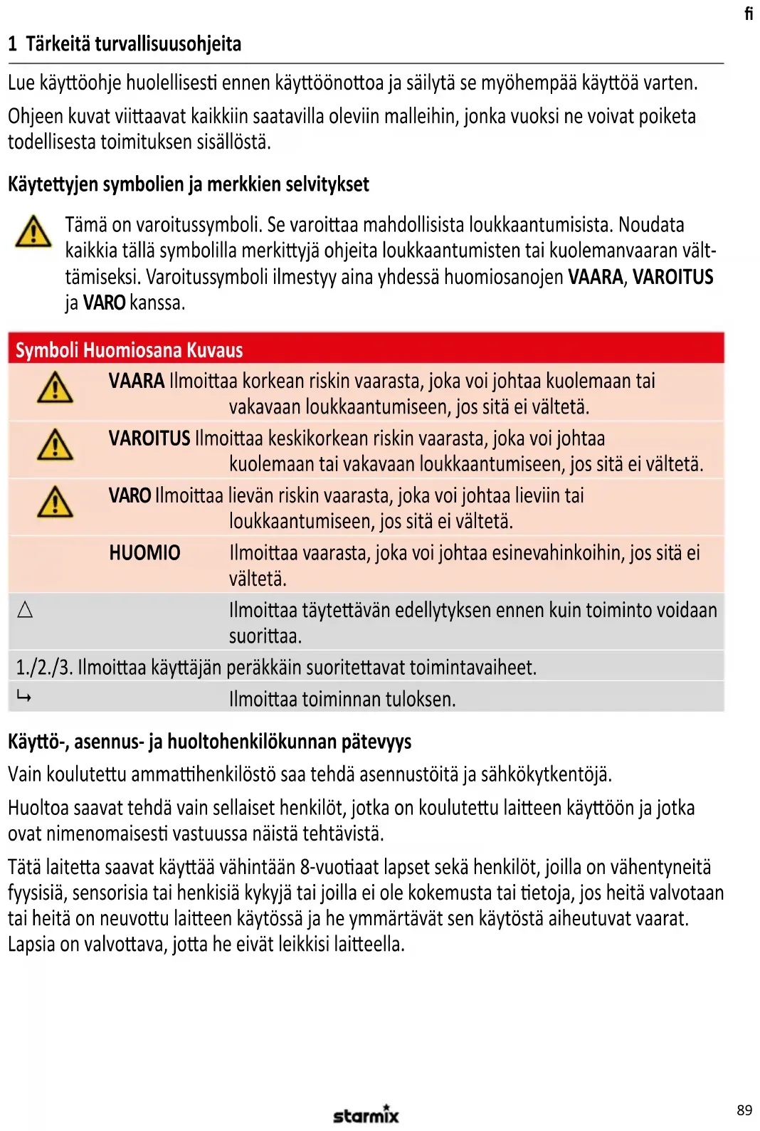 1 Tärkeitä turvallisuusohjeita Lue käyöohje huolellises ennen käyöönooa ja säilytä se myöhempää käyöä varten. Ohjeen kuvat viiaavat kaikkiin saatavilla oleviin malleihin, jonka vuoksi ne voivat poiketa todellisesta toimituksen sisällöstä. Käyteyjen symbolien ja merkkien selvitykset Tämä on varoitussymboli. Se varoiaa mahdollisista loukkaantumisista. Noudata kaikkia tällä symbolilla merkiyjä ohjeita loukkaantumisten tai kuolemanvaaran vält- tämiseksi. Varoitussymboli ilmestyy aina yhdessä huomiosanojen VAARA, VAROITUS ja VARO kanssa. Symboli Huomiosana Kuvaus VAARA Ilmoiaa korkean riskin vaarasta, joka voi johtaa kuolemaan tai vakavaan loukkaantumiseen, jos sitä ei vältetä. VAROITUS Ilmoiaa keskikorkean riskin vaarasta, joka voi johtaa kuolemaan tai vakavaan loukkaantumiseen, jos sitä ei vältetä. VARO Ilmoiaa lievän riskin vaarasta, joka voi johtaa lieviin tai loukkaantumiseen, jos sitä ei vältetä. HUOMIO Ilmoiaa vaarasta, joka voi johtaa esinevahinkoihin, jos sitä ei vältetä.