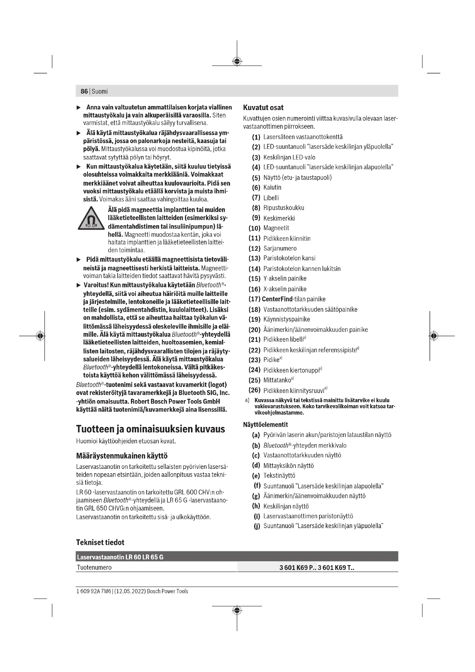 Kuvassa näkyvä tai tekstissä mainittu lisätarvike ei kuulu vakiovarustukseen. Koko tarvikevalikoiman voit katsoa tar- vikeohjelmastamme. Näyttöelementit (a) Pyörivän laserin akun/paristojen lataustilan näyttö (b) Bluetooth®-yhteyden merkkivalo (c) Vastaanottotarkkuuden näyttö (d) Mittayksikön näyttö (e) Tekstinäyttö (f) Suuntanuoli ”Lasersäde keskilinjan alapuolella” (g) Äänimerkin/äänenvoimakkuuden näyttö (h) Keskilinjan näyttö (i) Laservastaanottimen paristonäyttö (j) Suuntanuoli ”Lasersäde keskilinjan yläpuolella” Tekniset tiedot Laservastaanotin LR 60 LR 65G Tuotenumero 3601K69P.. 3601K69T.. 1 609 92A 7M6 | (12.05.2022) Bosch Power ToolsSuomi | 87 Laservastaanotin LR 60 LR 65G Vastaanotettavissa oleva aallonpituus 600−800nm 500−570nm Suurin kantama