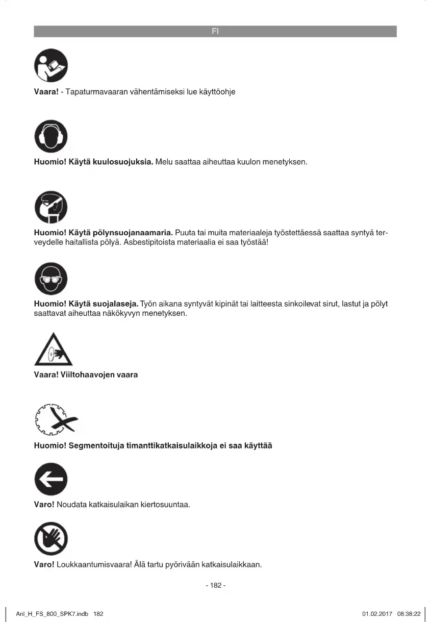 Vaara! Viiltohaavojen vaara Huomio! Segmentoituja timanttikatkaisulaikkoja ei saa käyttää Vaara! - Tapaturmavaaran vähentämiseksi lue käyttöohje Huomio! Käytä kuulosuojuksia. Melu saattaa aiheuttaa kuulon menetyksen. Huomio! Käytä suojalaseja. Työn aikana syntyvät kipinät tai laitteesta sinkoilevat sirut, lastut ja pölyt saattavat aiheuttaa näkökyvyn menetyksen. Huomio! Käytä pölynsuojanaamaria. Puuta tai muita materiaaleja työstettäessä saattaa syntyä ter- veydelle haitallista pölyä. Asbestipitoista materiaalia ei saa työstää! Varo! Loukkaantumisvaara! Älä tartu pyörivään katkaisulaikkaan. Varo! Noudata katkaisulaikan kiertosuuntaa. Anl_H_FS_800_SPK7.indb 182Anl_H_FS_800_SPK7.indb 182 01.02.2017 08:38:2201.02.2017 08:38:22FI