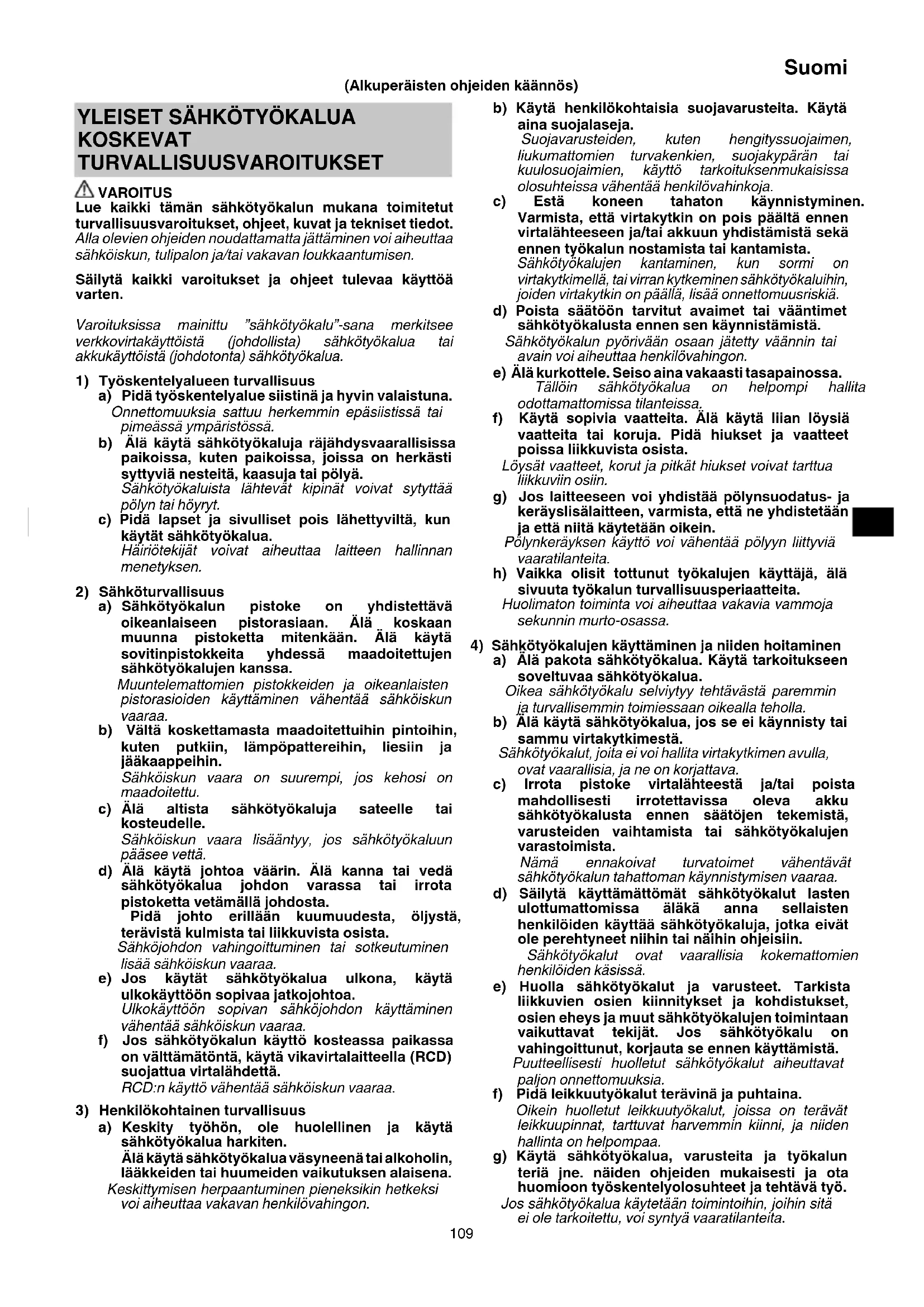 KOSKEVAT TURVALLISUUSVAROITUKSET VAROITUS Lue kaikki tämän sähkötyökalun mukana toimitetut turvallisuusvaroitukset, ohjeet, kuvat ja tekniset tiedot. Alla olevien ohjeiden noudattamatta jättäminen voi aiheuttaa sähköiskun, tulipalon ja/tai vakavan loukkaantumisen. Säilytä kaikki varoitukset ja ohjeet tulevaa käyttöä varten. Varoituksissa mainittu ”sähkötyökalu”-sana merkitsee verkkovirtakäyttöistä (johdollista) sähkötyökalua tai akkukäyttöistä (johdotonta) sähkötyökalua.