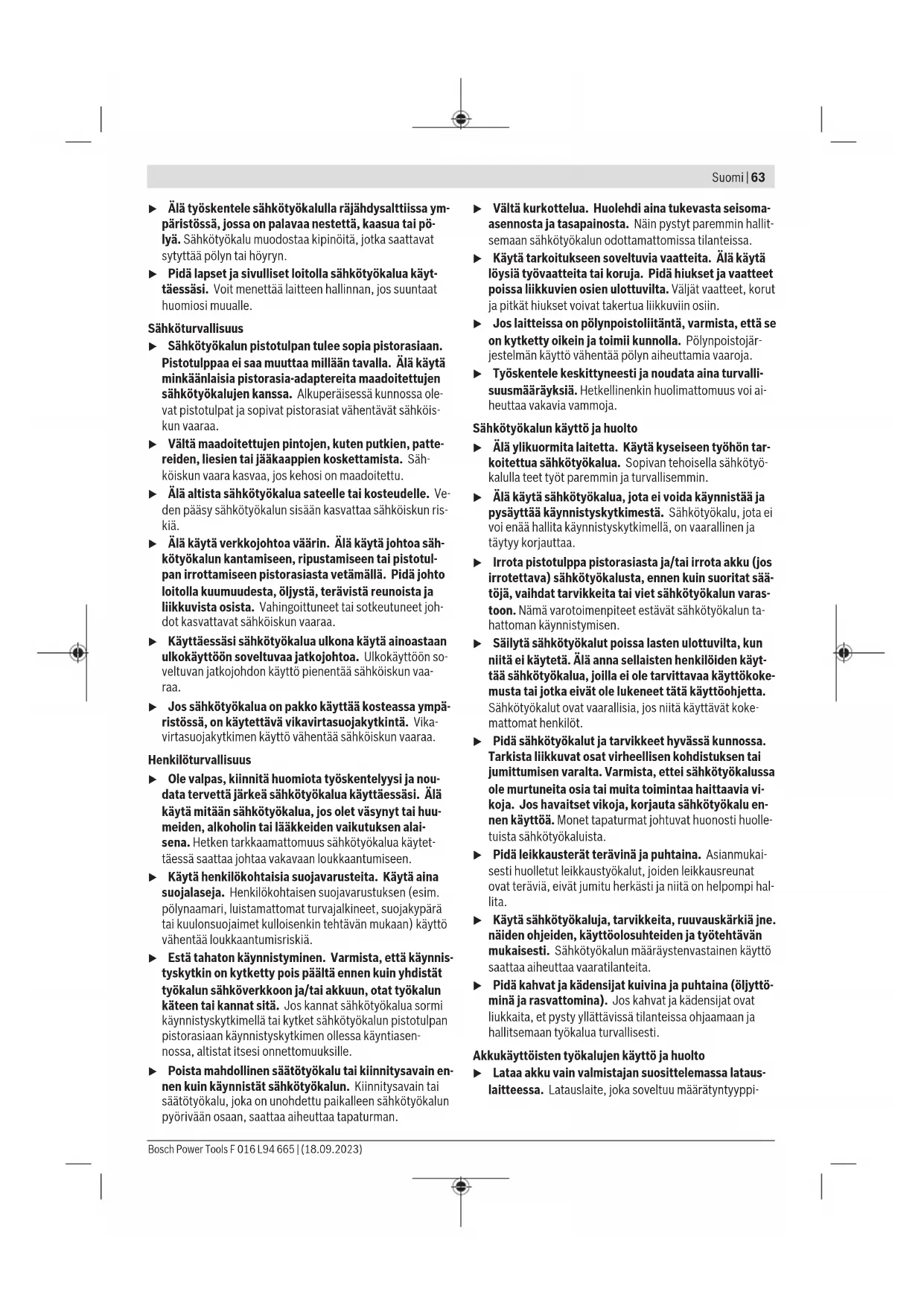 Symboler Nedenstående symboler er viktige for lesing og forståelse av driftsinstruksen. Legg merke til symbolene og deres betydning. En riktig tolkning av symbolene hjelper deg med å bruke produktet på en bedre og sikrere måte. Symbol Betydning Bevegelsesretning Innkobling Innkobling Utkobling CLICK! Hørbar støy Tilbehør Feilsøking Den følgende tabellen viser feilsymptomer og hvordan feilene kan utbedres, hvis maskinen en gang ikke skulle arbeide riktig. Hvis du ikke kan lokalisere og fjerne problemet med denne tabellen, må du henvende deg til et serviceverksted. OBS: Slå apparatet av før feilsøking. OBS: Stans maskinen øyeblikkelig og fjern batteriet i tilfelle ulykke eller verktøybrudd. Symptom Mulig årsak Avhjelp Hageredskapet går ikke Utladet batteri Lad opp batteriet Batteriet er ikke satt riktig inn Sett batteri riktig inn (se bilde C) For kaldt/for varmt batteri Varm opp/avkjøl batteriet. Start produktet alltid med et lavt turtall Defekt hageredskap Ta kontakt med kundeservice Hageredskapet går rykkvis På-/av-bryter defekt Ta kontakt med kundeservice Regulator for luftstrømhastighet defekt Ta kontakt med kundeservice Sterke vibrasjoner/ lyder Defekt hageredskap Ta kontakt med kundeservice Arbeidsvarigheten pr. batteriopplading er for liten Batteriet ble ikke brukt over lang tid eller kun i kort tid Lad batteriet helt opp Batteri i stykker eller defekt Skift ut batteriet Hageredskap blåser ikke Dysen er blokkert Frigjør dysen Redusert luftgjennomstrøm Luftinntak blokkert Frigjør luftinntak Batteri for kaldt Start produktet alltid med et lavt turtall Dysen kan ikke monteres Gal montering Monter dysen riktig (se bilde B) Service og vedlikehold Vedlikehold, rengjøring og lagring u Reparasjoner av produktene må kun utføres av kvalifiserte fagpersoner og kun med originale reservedeler. Det er din trygghet for at sikkerheten blir opprettholdt. u Ikke utfør vedlikehold på skadde batterier. Vedlikehold av batterier skal alltid utføres av produsenten eller godkjente forhandlere. Vedlikehold, rengjøring og lagring Rengjør produktet med en klut før du oppbevarer det. Motoren skal være slått av og batteriet fjernet når du rengjør og monterer dysen. Bruk aldri løsemidler. Sprøyt aldri vann på produktet. Dypp produktet aldri ned i vann. Kundeservice og kundeveiledning Kundeservice hjelper deg ved spørsmål om reparasjon og vedlikehold av produktet ditt og reservedelene. Du finner Bosch Power Tools F 016 L94 665 | (18.09.2023)62 | Suomi også sprengskisser og informasjon om reservedeler på www.bosch-pt.com Boschs kundeveilederteam hjelper deg gjerne hvis du har spørsmål om våre produkter og tilbehør. Ved alle forespørsler og reservedelsbestillinger må du oppgi det 10‑sifrede produktnummeret som er angitt på produktets typeskilt. Norsk Robert Bosch AS Postboks 350 1402 Ski Tel.: 64 87 89 50 Faks: 64 87 89 55 Du finner adresser til andre verksteder på: www.bosch-pt.com/serviceaddresses Transport De anbefalte li-ion-batteriene underligger kravene for farlig gods. Batteriene kan transporteres på veier av brukeren uten ytterligere krav. Ved forsendelse gjennom tredje personer (f.eks.: lufttransport eller spedisjon) må det oppfylles spesielle krav til emballasje og merking. Du må konsultere en ekspert for farlig gods ved forberedelse av forsendelsen. Send batterier kun hvis huset ikke er skadet. Lim igjen de åpne kontaktene og pakk batteriet slik at det ikke beveger seg i emballasjen. Ta også hensyn til videreførende nasjonale forskrifter. Deponering Produkter, batterier, tilbehør og emballasje må leveres inn til miljøvennlig gjenvinning. Produkter og batterier må ikke kastes som vanlig husholdningsavfall! Bare for land i EU: Iht. det europeiske direktivet 2012/19/EU om gamle redskap og iht. det europeiske direktivet 2006/66/EF må defekte eller oppbrukte batterier/oppladbare batterier samles inn adskilt og leveres inn til en miljøvennlig resirkulering. Ikke-forskriftsmessig håndtering av elektrisk og elektronisk avfall kan føre til miljø- og helseskader på grunn av eventuelle farlige stoffer. (Oppladbare) batterier: Li-ion: Se informasjonen i avsnittet Transport (se „Transport“, Side62). Suomi Turvallisuusohjeita Puutarhalaitteessa olevien tunnuskuvien selitykset Yleiset varoitusohjeet. Lue käyttöohje huolellisesti. Älä käytä sateella. VAROITUS: Varo pois sinkoutuvia osia. VAROITUS: Pidä ympäristössä olevia loitolla. Pidä kädet, jalat ja löysät vaatteet loitolla au- koista tuotteen käydessä. Pyörivä puhallin. Pidä kädet, jalat pitkät hiuk- set ja löysät vaatteet loitolla aukoista tuotteen käydessä. Käytä silmä- ja kuulonsuojaimia. VAROITUS: Irrota akku ennen huoltotöitä. Yleiset sähkötyökalujen turvaohjeet VAROITUS Lue kaikki tämän sähkötyökalun mukana toimitetut varoitukset, oh- jeet, kuvat ja tekniset tiedot. Alla mainittujen ohjeiden noudattamisen laiminlyönti saattaa aiheuttaa sähköiskun, tu- lipalon ja/tai vakavan loukkaantumisen. Säilytä kaikki turvallisuusohjeet ja muut ohjeet tulevai- suutta varten. Turvallisuusohjeissa käytetty käsite "sähkötyökalu" käsittää verkkokäyttöisiä sähkötyökaluja (verkkojohdolla) ja akku- käyttöisiä sähkötyökaluja (ilman verkkojohtoa). Työpaikan turvallisuus u Pidä työskentelyalue puhtaana ja hyvin valaistuna. Työpaikan epäjärjestys tai valaisemattomat työalueet voi- vat johtaa tapaturmiin. F 016 L94 665 | (18.09.2023) Bosch Power ToolsSuomi | 63 u Älä työskentele sähkötyökalulla räjähdysalttiissa ym- päristössä, jossa on palavaa nestettä, kaasua tai pö- lyä. Sähkötyökalu muodostaa kipinöitä, jotka saattavat sytyttää pölyn tai höyryn. u Pidä lapset ja sivulliset loitolla sähkötyökalua käyt- täessäsi. Voit menettää laitteen hallinnan, jos suuntaat huomiosi muualle. Sähköturvallisuus u Sähkötyökalun pistotulpan tulee sopia pistorasiaan. Pistotulppaa ei saa muuttaa millään tavalla. Älä k