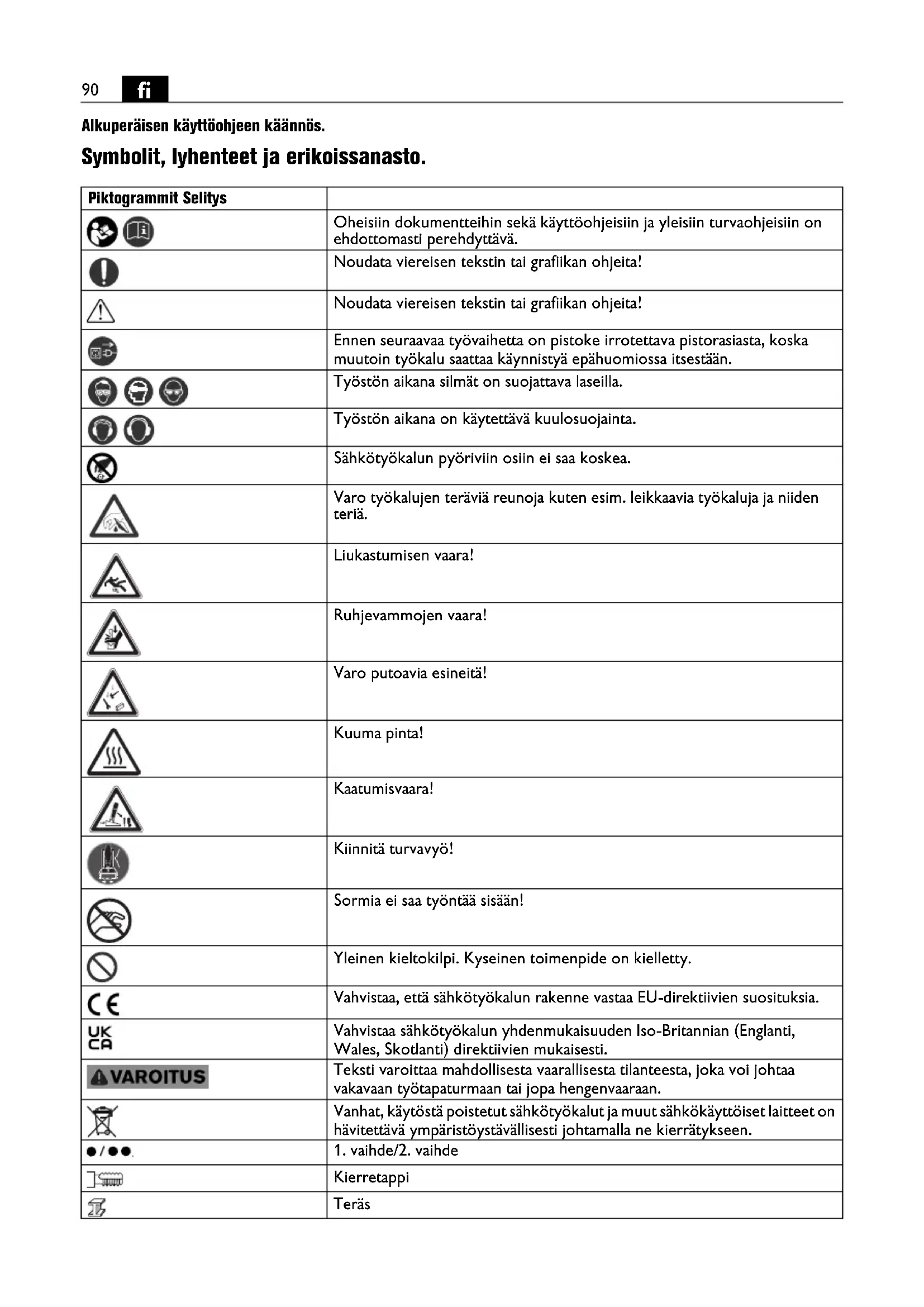 Alkuperäisen käyttöohjeen käännös. Symbolit, lyhenteet ja erikoissanasto. Piktogrammit Selitys Oheisiin dokumentteihin sekä käyttöohjeisiin ja yleisiin turvaohjeisiin on ehdottomasti perehdyttävä. Noudata viereisen tekstin tai grafiikan ohjeita! Noudata viereisen tekstin tai grafiikan ohjeita! Ennen seuraavaa työvaihetta on pistoke irrotettava pistorasiasta, koska muutoin työkalu saattaa käynnistyä epähuomiossa itsestään. Työstön aikana silmät on suojattava laseilla. Työstön aikana on käytettävä kuulosuojainta. Sähkötyökalun pyöriviin osiin ei saa koskea. Varo työkalujen teräviä reunoja kuten esim. leikkaavia työkaluja ja niiden teriä. Liukastumisen vaara! Ruhjevammojen vaara! Varo putoavia esineitä! Kuuma pinta! Kaatumisvaara! Kiinnitä turvavyö! Sormia ei saa työntää sisään! Yleinen kieltokilpi. Kyseinen toimenpide on kielletty. Vahvistaa, että sähkötyökalun rakenne vastaa EU-direktiivien suosituksia. Vahvistaa sähkötyökalun yhdenmukaisuuden Iso-Britannian (Englanti, Wales, Skotlanti) direktiivien mukaisesti. Teksti varoittaa mahdollisesta vaarallisesta tilanteesta, joka voi johtaa vakavaan työtapaturmaan tai jopa hengenvaaraan. Vanhat, käytöstä poistetut sähkötyökalut ja muut sähkökäyttöiset laitteet on hävitettävä ympäristöystävällisesti johtamalla ne kierrätykseen.