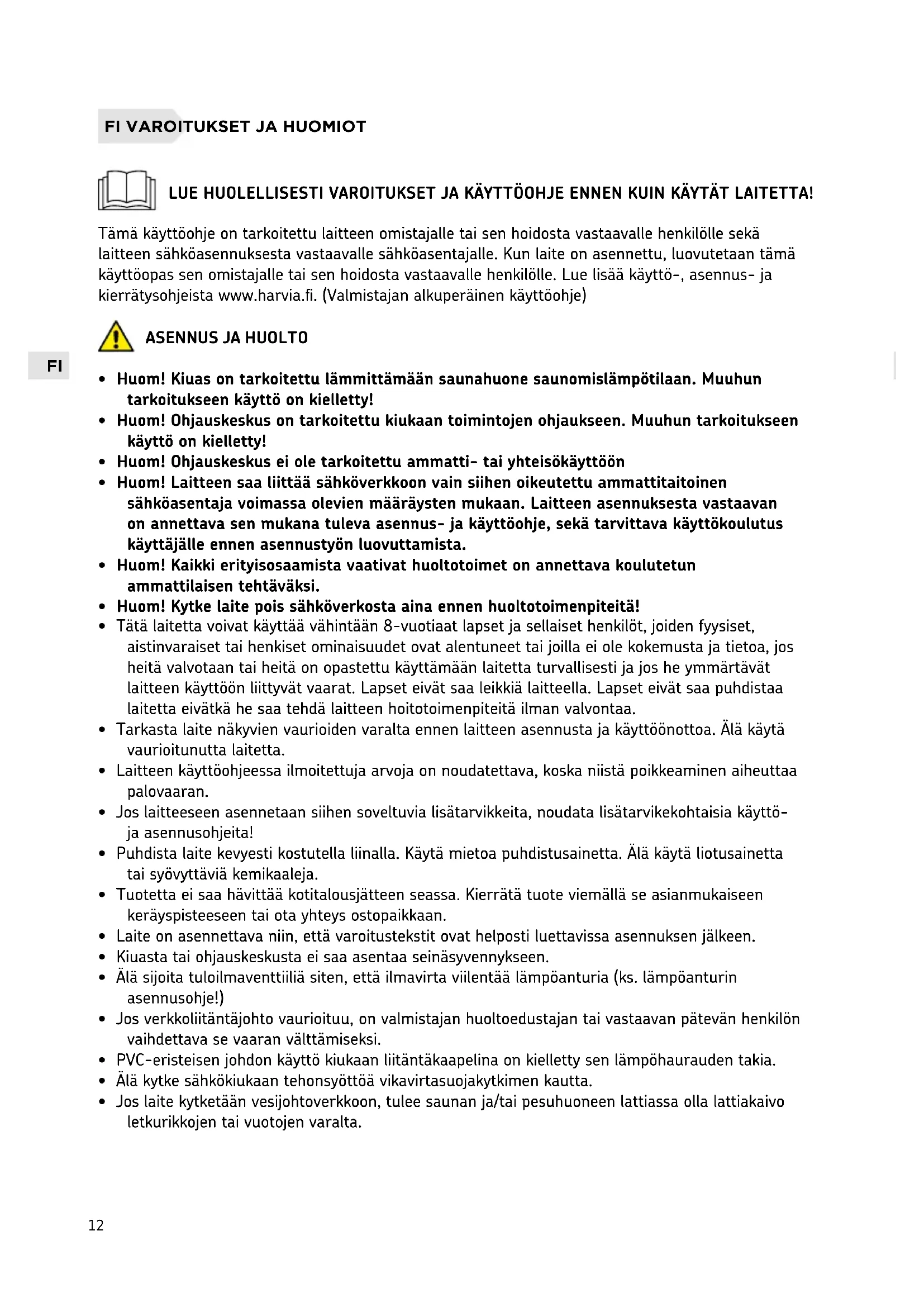LUE HUOLELLISESTI VAROITUKSET JA KÄYTTÖOHJE ENNEN KUIN KÄYTÄT LAITETTA! Tämä käyttöohje on tarkoitettu laitteen omistajalle tai sen hoidosta vastaavalle henkilölle sekä laitteen sähköasennuksesta vastaavalle sähköasentajalle. Kun laite on asennettu, luovutetaan tämä käyttöopas sen omistajalle tai sen hoidosta vastaavalle henkilölle. Lue lisää käyttö-, asennus- ja kierrätysohjeista www.harvia.fi. (Valmistajan alkuperäinen käyttöohje)