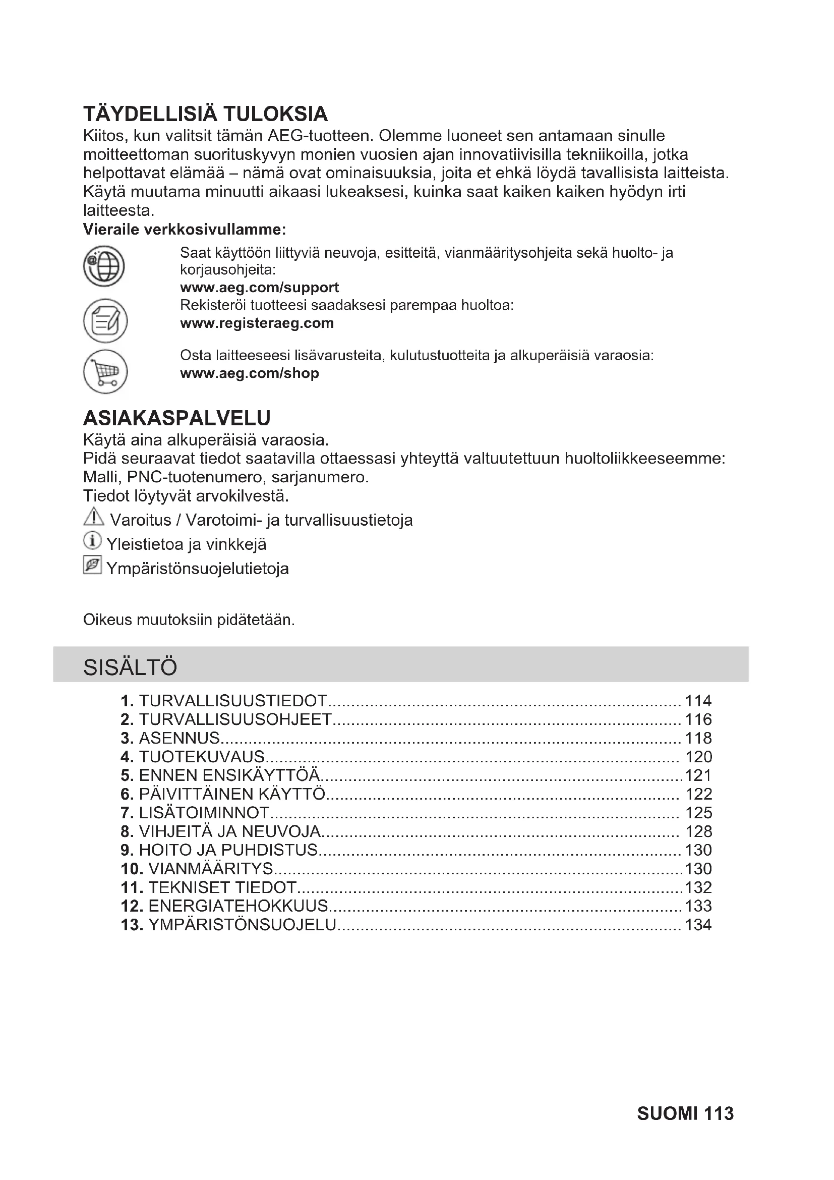 Kiitos, kun valitsit tämän AEG-tuotteen. Olemme luoneet sen antamaan sinulle moitteettoman suorituskyvyn monien vuosien ajan innovatiivisilla tekniikoilla, jotka helpottavat elämää – nämä ovat ominaisuuksia, joita et ehkä löydä tavallisista laitteista. Käytä muutama minuutti aikaasi lukeaksesi, kuinka saat kaiken kaiken hyödyn irti laitteesta. Vieraile verkkosivullamme: Saat käyttöön liittyviä neuvoja, esitteitä, vianmääritysohjeita sekä huolto- jakorjausohjeita:www.aeg.com/supportRekisteröi tuotteesi saadaksesi parempaa huoltoa:www.registeraeg.comOsta laitteeseesi lisävarusteita, kulutustuotteita ja alkuperäisiä varaosia:www.aeg.com/shop ASIAKASPALVELU Käytä aina alkuperäisiä varaosia. Pidä seuraavat tiedot saatavilla ottaessasi yhteyttä valtuutettuun huoltoliikkeeseemme: Malli, PNC-tuotenumero, sarjanumero. Tiedot löytyvät arvokilvestä. Varoitus / Varotoimi- ja turvallisuustietoja Yleistietoa ja vinkkejä Ympäristönsuojelutietoja Oikeus muutoksiin pidätetään. SISÄLTÖ