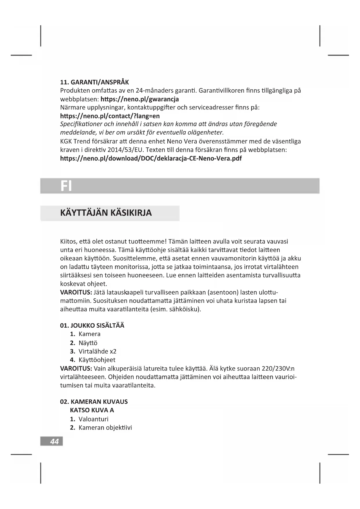 Produkten omfaas av en 24-månaders garan. Garanvillkoren nns llgängliga på webbplatsen: hps://neno.pl/gwarancja Närmare upplysningar, kontaktuppgier och serviceadresser nns på: hps://neno.pl/contact/?lang=en Specikaoner och innehåll i satsen kan komma a ändras utan föregående meddelande, vi ber om ursäkt för eventuella olägenheter. KGK Trend försäkrar a denna enhet Neno Vera överensstämmer med de väsentliga kraven i direkv 2014/53/EU. Texten ll denna försäkran nns på webbplatsen: hps://neno.pl/download/DOC/deklaracja-CE-Neno-Vera.pdf Kiitos, eä olet ostanut tuoeemme! Tämän laieen avulla voit seurata vauvasi unta eri huoneessa. Tämä käyöohje sisältää kaikki tarviavat edot laieen oikeaan käyöön. Suosielemme, eä asetat ennen vauvamonitorin käyöä ja akku on ladau täyteen monitorissa, joa se jatkaa toimintaansa, jos irrotat virtalähteen siirtääksesi sen toiseen huoneeseen. Lue ennen laieiden asentamista turvallisuua koskevat ohjeet. VAROITUS: Jätä latauskaapeli turvalliseen paikkaan (asentoon) lasten ulou- maomiin. Suosituksen noudaamaa jääminen voi uhata kuristaa lapsen tai aiheuaa muita vaaralanteita (esim. sähköisku).