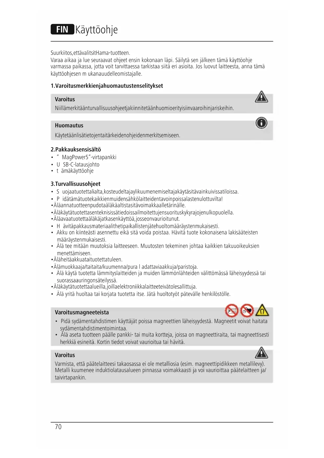 - Älä aseta tuotteen päälle pankki- tai muita kortteja, joissa on magneettiraita, tai magneettisesti herkkiä esineitä. Kortintiedot voivat vaurioitua taihävitä. Varoitus Varmista, että päätelaitteesi takaosassa ei ole metalliosia (esim.magneettipidikkeen metallilevy). Metallikuumenee induktiolatausalueen pinnassa voimakkaasti ja voi vaurioittaa päätelaitteen ja/ tai virtapankin. L Käyttöohje71