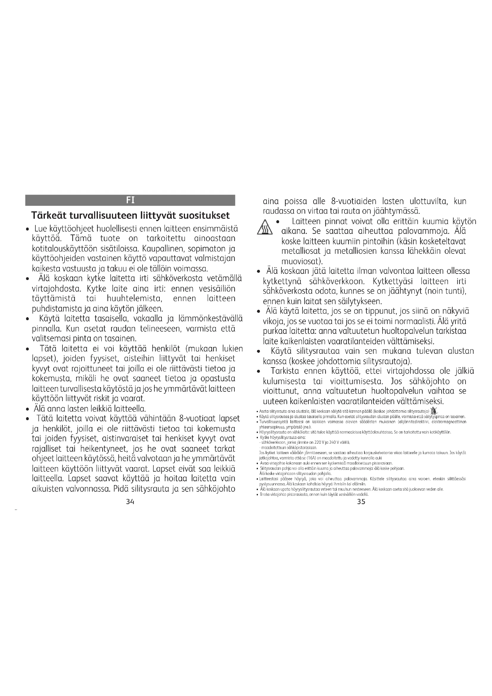- Tätä laitetta voivat käyttää vähintään 8-vuotiaat lapset ja henkilöt, joilla ei ole riittävästi tietoa tai kokemusta tai joiden fyysiset, aistinvaraiset tai henkiset kyvyt ovat rajalliset tai heikentyneet, jos he ovat saaneet tarkat ohjeet laitteen käytössä, heitä valvotaan ja he ymmärtävät laitteen käyttöön liittyvät vaarat. Lapset eivät saa leikkiä laitteella. Lapset saavat käyttää ja hoitaa laitetta vain aikuisten valvonnassa. Pidä silitysrauta ja sen sähköjohto