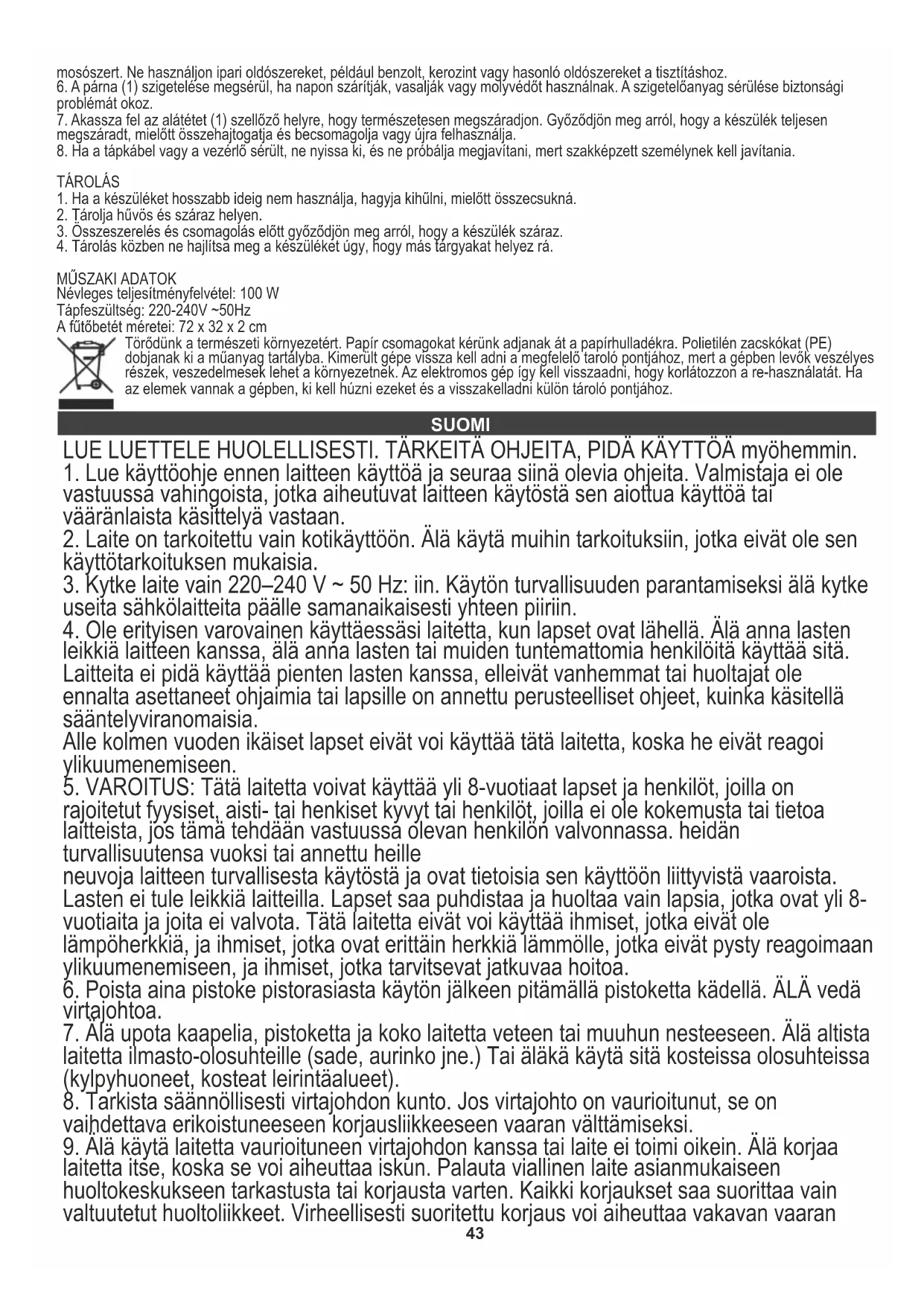 TEKNISET TIEDOT Nimellisvirrankulutus: 100W Syöttöjännite: 220-240V ~50Hz Lämmitystyynyn mitat: 72 x 32 x 2 cm NEDERLANDS Kantakaamme huolta ympäristöstä. Pahvipakkauksen pyydämme laittamaan paperikierrätykseen. Polyeteenipussit (PE) tulee laittaa muovien kierrätysastiaan. Loppuun käytetyt laitteet tulee toimittaa asianmukaiseen keräyspisteeseen, koska laitteen sisältämät vaaralliset aineosat voivat olla ympäristölle vahingollisia. Sähkölaite tulee toimittaa siten, että sen uudelleenkäyttö on estetty. Jos laitteessa on paristo, paristo tulee poistaa ja toimittaa erillisesti keräyspisteeseen. LEES DIT ZORGVULDIG DOOR. BELANGRIJKE INSTRUCTIES, BEWAREN VOOR LATER GEBRUIK.