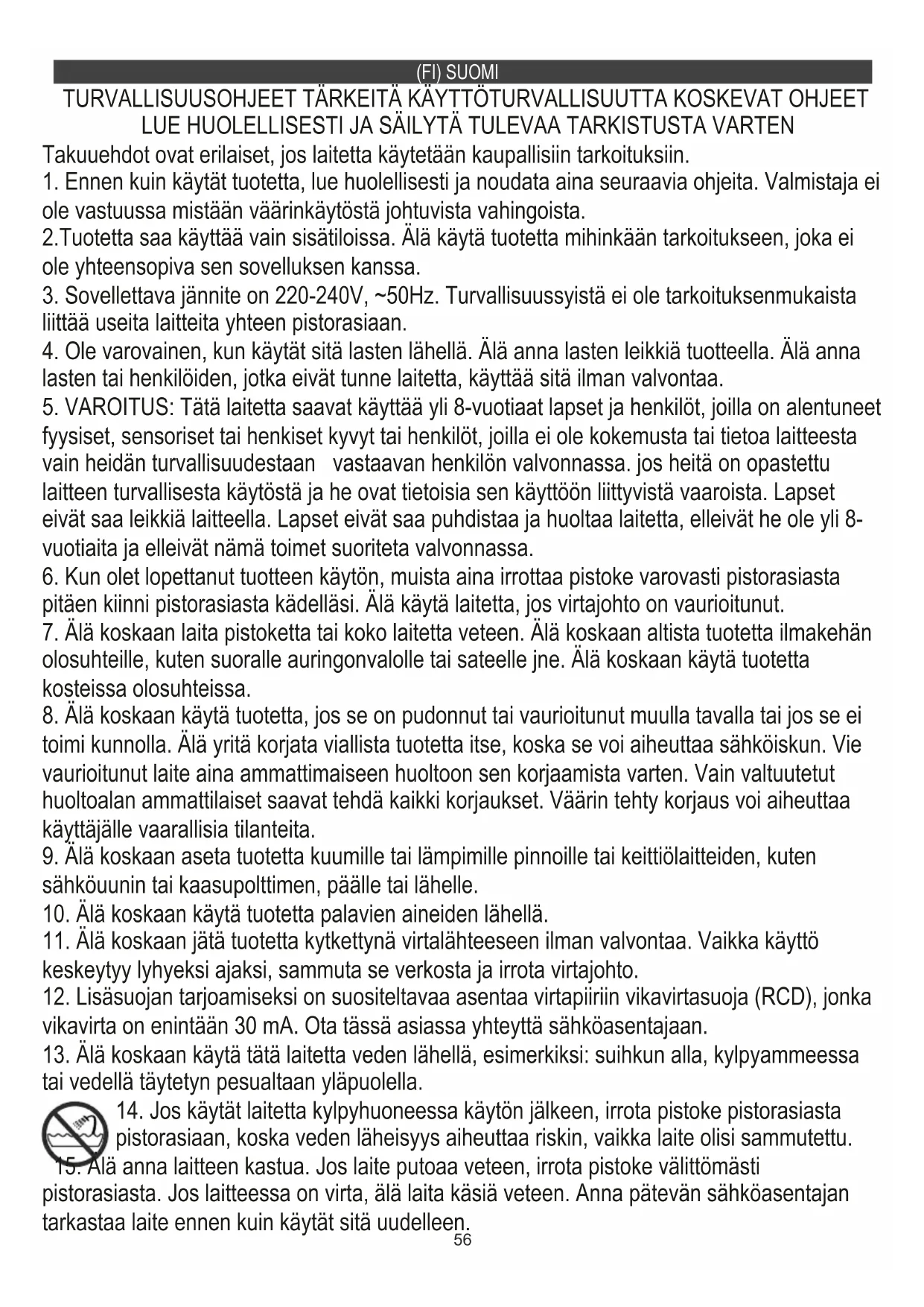 13. Älä koskaan käytä tätä laitetta veden lähellä, esimerkiksi: suihkun alla, kylpyammeessa