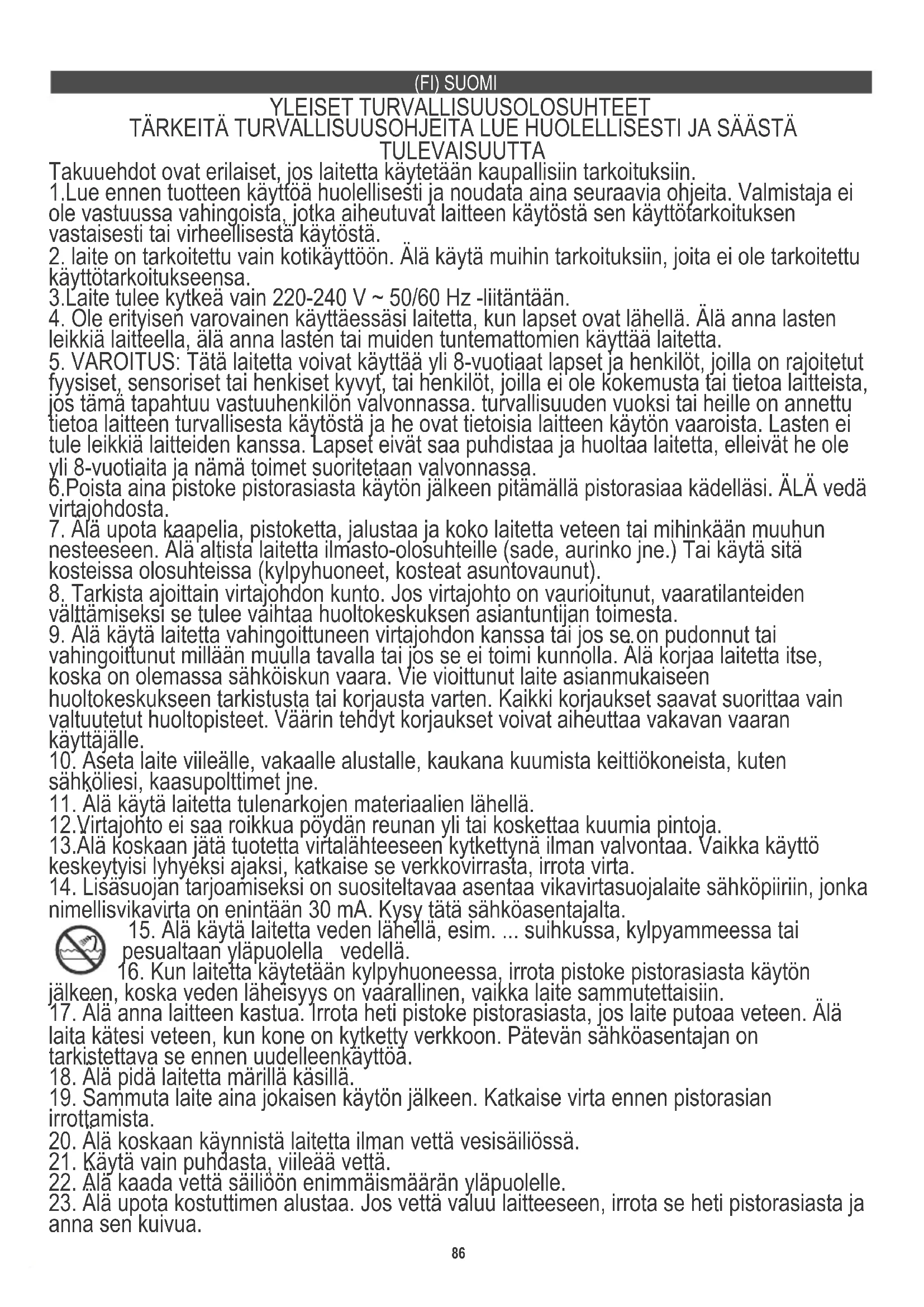 15. Älä käytä laitetta veden lähellä, esim. ... suihkussa, kylpyammeessa tai