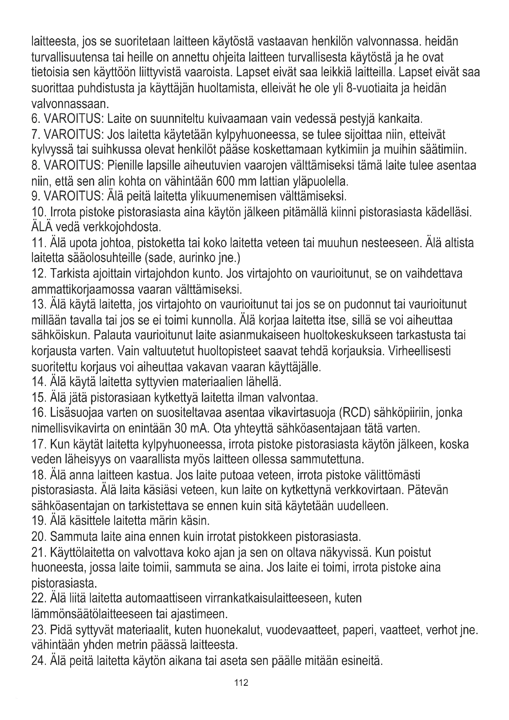 17. Kun käytät laitetta kylpyhuoneessa, irrota pistoke pistorasiasta käytön jälkeen, koska