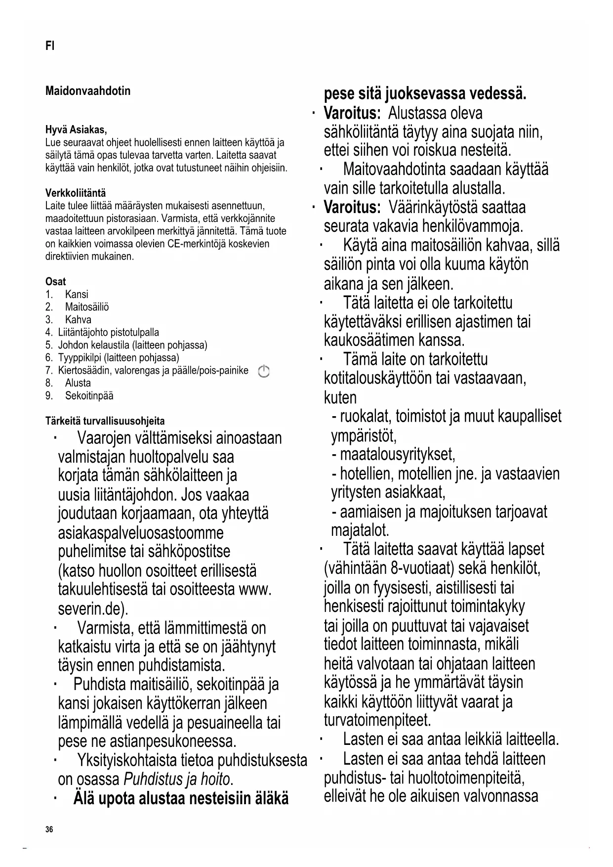 Tärkeitä turvallisuusohjeita ∙ Vaarojen välttämiseksi ainoastaan valmistajan huoltopalvelu saa korjata tämän sähkölaitteen ja uusia liitäntäjohdon. Jos vaakaa joudutaan korjaamaan, ota yhteyttä asiakaspalveluosastoomme puhelimitse tai sähköpostitse (katso huollon osoitteet erillisestä takuulehtisestä tai osoitteesta www. severin.de). ∙ Varmista, että lämmittimestä on katkaistu virta ja että se on jäähtynyt täysin ennen puhdistamista. ∙ Puhdista maitisäiliö, sekoitinpää ja kansi jokaisen käyttökerran jälkeen lämpimällä vedellä ja pesuaineella tai pese ne astianpesukoneessa. ∙ Yksityiskohtaista tietoa puhdistuksesta on osassa Puhdistus ja hoito. ∙ Älä upota alustaa nesteisiin äläkä pese sitä juoksevassa vedessä. ∙ Varoitus: Alustassa oleva sähköliitäntä täytyy aina suojata niin, ettei siihen voi roiskua nesteitä. ∙ Maitovaahdotinta saadaan käyttää vain sille tarkoitetulla alustalla. ∙ Varoitus: Väärinkäytöstä saattaa seurata vakavia henkilövammoja. ∙ Käytä aina maitosäiliön kahvaa, sillä säiliön pinta voi olla kuuma käytön aikana ja sen jälkeen. ∙ Tätä laitetta ei ole tarkoitettu käytettäväksi erillisen ajastimen tai kaukosäätimen kanssa. ∙ Tämä laite on tarkoitettu kotitalouskäyttöön tai vastaavaan, kuten - ruokalat, toimistot ja muut kaupalliset ympäristöt, - maatalousyritykset, - hotellien, motellien jne. ja vastaavien yritysten asiakkaat, - aamiaisen ja majoituksen tarjoavat majatalot. ∙ Tätä laitetta saavat käyttää lapset (vähintään 8-vuotiaat) sekä henkilöt, joilla on fyysisesti, aistillisesti tai henkisesti rajoittunut toimintakyky tai joilla on puuttuvat tai vajavaiset tiedot laitteen toiminnasta, mikäli heitä valvotaan tai ohjataan laitteen käytössä ja he ymmärtävät täysin kaikki käyttöön liittyvät vaarat ja turvatoimenpiteet. ∙ Lasten ei saa antaa leikkiä laitteella. ∙ Lasten ei saa antaa tehdä laitteen puhdistus- tai huoltotoimenpiteitä, elleivät he ole aikuisen valvonnassa FI37 142 x 208 mm sekä vähintään 8 vuotta vanhoja. ∙ Laite ja sen liitäntäjohto täytyy aina pitää alle 8-vuotiaiden ulottumattomissa. ∙ Varoitus: Pidä lapset poissa pakkausmateriaalien luota potentiaalisen vaaratilanteen esim. tukehtumisvaaran vuoksi. ∙ Tarkasta aina ennen laitteen käyttöä huolellisesti laitteen runko, liitäntäjohto ja mahdolliset asennetut lisäosat vaurioiden varalta. Jos laite on esimerkiksi pudonnut kovalle pinnalle tai liitäntäjohdon vetämiseen on käytetty liikaa voimaa, laitetta ei saa enää käyttää: näkymättömätkin vauriot voivat aiheuttaa laitetta käytettäessä vaaratilanteita. ∙ Älä jätä maitovaahdotinta ilman valvontaa käytön aikana. ∙ Huomioi aina säiliön sisällä olevat minimi- ja maksimitason merkit kaikenlaisessa käytössä. ∙ Maidon täytyy peittää säiliön alaosassa oleva kohouma (min.-tason merkki). Ellei maitoa ole riittävästi, laite saattaa ylikuumentua. ∙ Varoitus: Säiliön liiallinen täyttäminen voi aiheuttaa vaaran, jos vaahtoavaa maitoa purkautuu ulos. ∙ Varoitus: Kannen tulee olla aina paikallaan käytön aikana. ∙ Laitetta saadaan käyttää vain valmistajan toimittamien alkuperäisten lisävarusteiden kanssa. ∙ Laite on asetettava aina kiinteälle, tasaiselle pinnalle. ∙ Varo, ettei liitäntäjohto tai kannu kosketa avoliekkiä tai kuumia pintoja (esim. lieden keittolevyjä). ∙ Älä jätä liitäntäjohtoa roikkumaan äläkä anna sen koskettaa kuumia osia. ∙ Irrota pistotulppa pistorasiasta aina - jos laitteessa on käyttöhäiriö, - käytön jälkeen, - ennen laitteen puhdistamista. ∙ Kun irrotat pistotulpan pistorasiasta, älä vedä liitäntäjohdosta vaan tartu aina pistotulppaan. ∙ Älä tartu virtapistokkeeseen märin käsin. ∙ Jos laite vahingoittuu väärinkäytön seurauksena tai siksi, että annettuja ohjeita ei ole noudatettu, valmistaja ei vastaa aiheutuneista vahingoista. Määräystenmukainen käyttö ∙ Laite on tarkoitettu vain maidon, kuuman suklaan ja kaakaon lämmittämiseen/vaahdottamiseen. Mikään muu käyttö ei ole määräystenmukaista ja voi johtaa vakaviin vammoihin ja laitteen vahingoittumiseen. ∙ Älä täytä siihen muita nesteitä tai kiinteitä elintarvikkeita. Ennen ensimmäistä käyttöä ∙ Poista kaikki pakkausmateriaalit ja -tarrat ennen laitteen ensimmäistä käyttökertaa, ja tarkista, ettei mitään osia puutu. Älä poista tyyppikilpeä! ∙ Ennen kuin laitetta käytetään ensimmäistä kertaa tai jos sitä ei ole käytetty pitkään aikaan, se on puhdistettava huolellisesti jaksossa Puhdistus ja hoito kuvatulla tavalla. Johdon kelaustila ∙ Laitteen pohjassa on johdon kelaustila, johon tarpeeton osa johdosta voidaan kelata. Käyttö Kansi ∙ Kannen tulee olla aina paikallaan käytön aikana. ∙ Kannen saa ottaa pois vain suklaan täyttämistä varten. Kiertosäädin Seuraavat toiminnot ovat valittavissa: è kuuma suklaa/kaakao è paksu ja kiinteä maitovaahto è kermainen maitovaahto è vain kuumennus è kylmä vaahdotus Valorengas Punainen Lämmityksen sisältävä toiminto on valittu. Sininen Toiminto ilman lämmitystä on valittu. Tasaisesti palava valo Valmistelu on käynnissä. Hidas vilkkuminen Laite odottaa tietojen syöttämistä tai valmistus on päättynyt. Nopea vilkkuminen On esiintynyt virhe (katso kohta ‘Ohjeita ongelmatilanteisiin’ tämän ohjekirjan lopusta). Täyttömäärät ∙ MIN vähimmäismäärä 75 ml – kohouman täytyy peittyä ∙ MAX vaahdotus maidon enimmäismäärä 150 ml (alempi max-merkki) ∙ MAX sekoitus ja kuumennus enimmäismäärä 300 ml (ylempi max-merkki)38 142 x 208 mm Laitteen valmistelu ∙ Poista maitosäiliöstä kansi. ∙ Aseta sekoitinpää maitosäiliöön, paina alas ja varmista, että se on asettunut tuen alapäähän. ∙ Laita säiliöön tarpeellinen määrä maitoa. ∙ Aseta kansi säiliön päälle. ∙ Kiinnitä pistoke pistorasiaan. ∙ Si