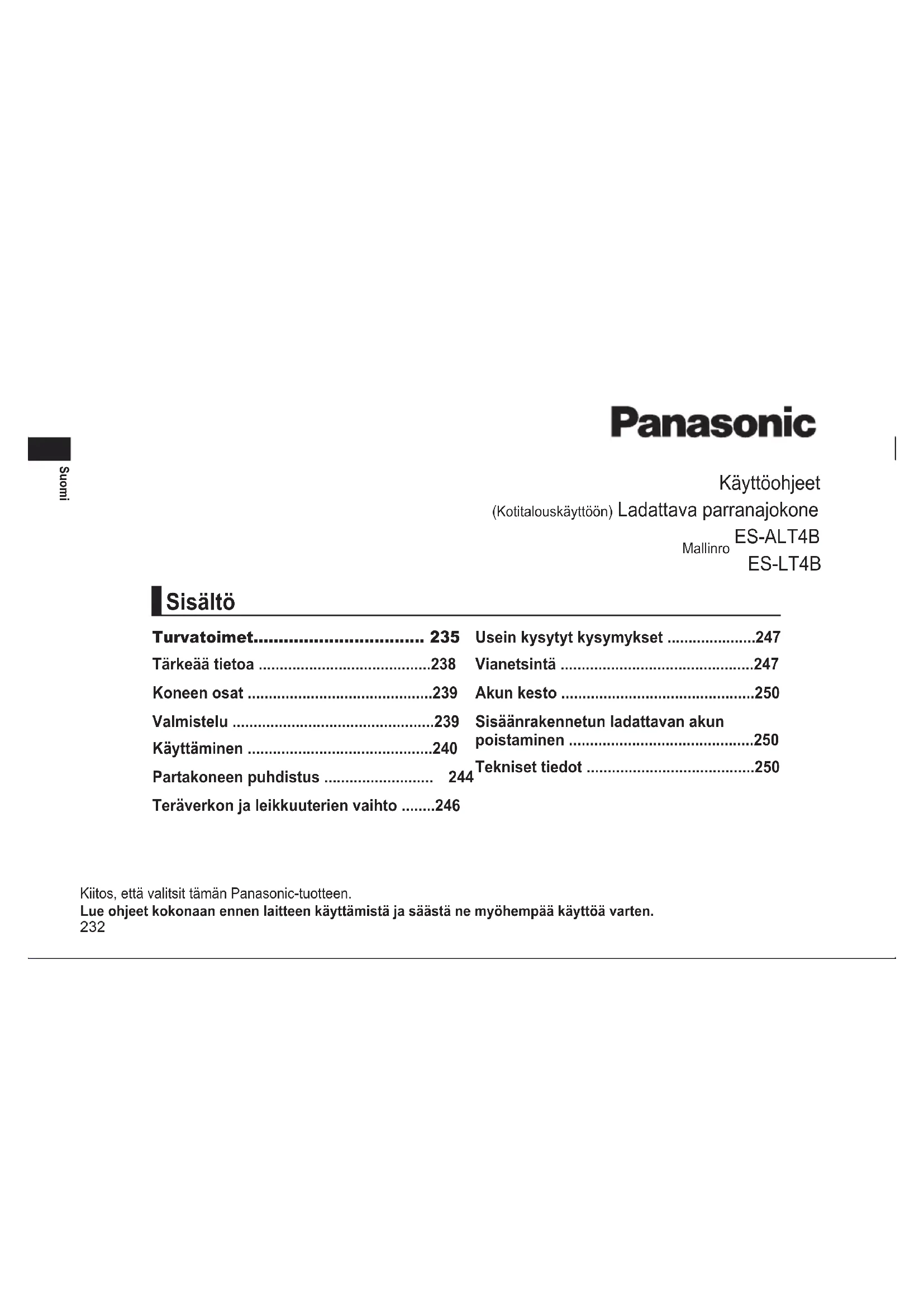 - ES‑LT4B Kiitos, että valitsit tämän Panasonic‑tuotteen. Lueohjeetkokonaanennenlaitteenkäyttämistäjasäästänemyöhempääkäyttöävarten. Turvatoimet p. 235