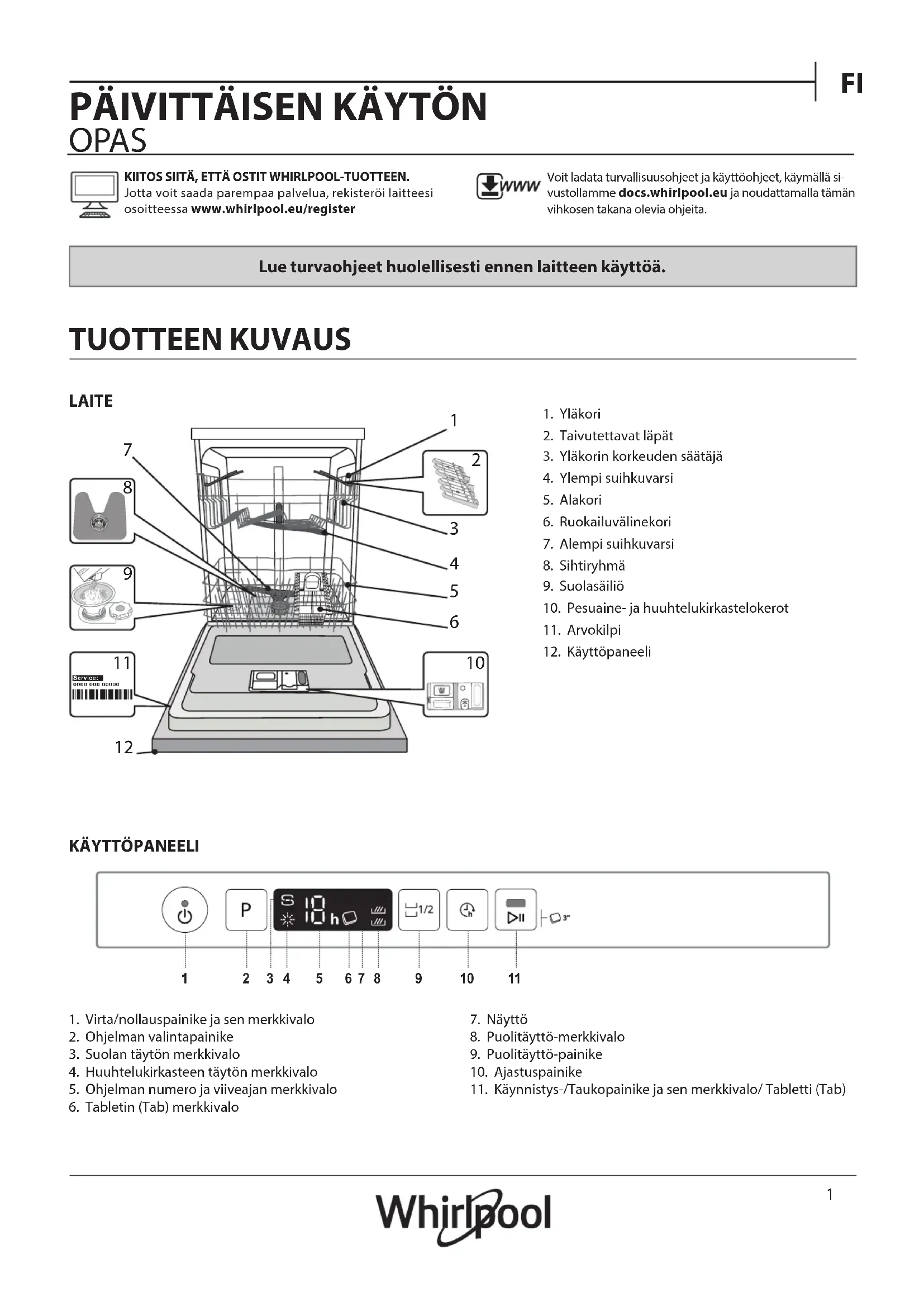 OPAS KIITOS SIITÄ, ETTÄ OSTIT WHIRLPOOL-TUOTTEEN.Jotta voit saada parempaa palvelua, rekisteröi laitteesi osoitteessa www.whirlpool.eu/registerLAITELue turvaohjeet huolellisesti ennen laitteen käyttöä. TUOTTEEN KUVAUS KÄYTTÖPANEELI1. Yläkori2. Taivutettavat läpät3. Yläkorin korkeuden säätäjä4. Ylempi suihkuvarsi5. Alakori6. Ruokailuvälinekori7. Alempi suihkuvarsi8. Sihtiryhmä9. Suolasäiliö10. Pesuaine- ja huuhtelukirkastelokerot11. Arvokilpi12. KäyttöpaneeliVoit ladata turvallisuusohjeet ja käyttöohjeet, käymällä si-vustollamme docs.whirlpool.eu ja noudattamalla tämän vihkosen takana olevia ohjeita. 0000 000 00000 Service: