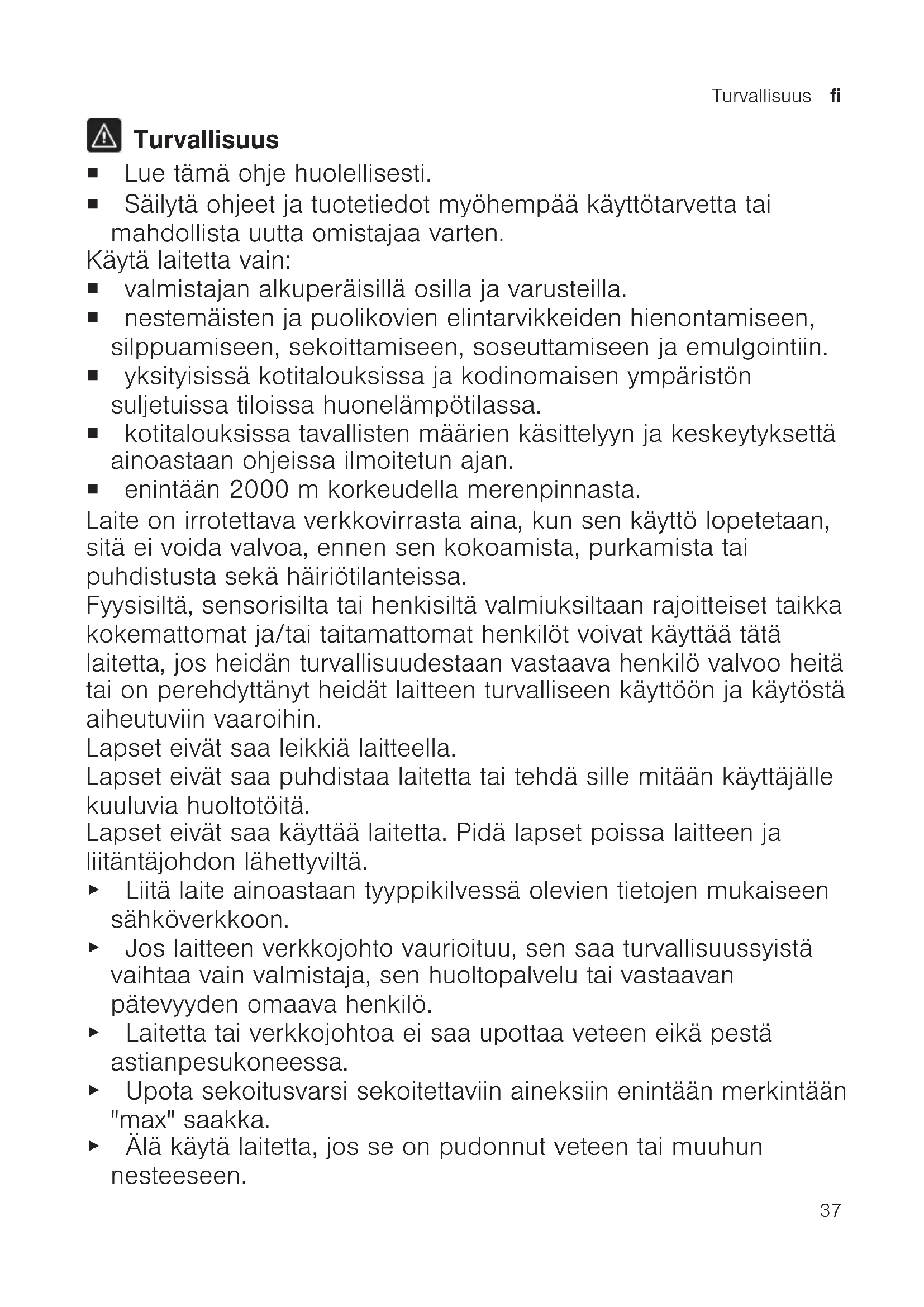 Turvallisuus ¡ Lue tämä ohje huolellisesti. ¡ Säilytä ohjeet ja tuotetiedot myöhempää käyttötarvetta tai mahdollista uutta omistajaa varten. Käytä laitetta vain: ¡ valmistajan alkuperäisillä osilla ja varusteilla. ¡ nestemäisten ja puolikovien elintarvikkeiden hienontamiseen, silppuamiseen, sekoittamiseen, soseuttamiseen ja emulgointiin. ¡ yksityisissä kotitalouksissa ja kodinomaisen ympäristön suljetuissa tiloissa huonelämpötilassa. ¡ kotitalouksissa tavallisten määrien käsittelyyn ja keskeytyksettä ainoastaan ohjeissa ilmoitetun ajan. ¡ enintään 2000m korkeudella merenpinnasta. Laite on irrotettava verkkovirrasta aina, kun sen käyttö lopetetaan, sitä ei voida valvoa, ennen sen kokoamista, purkamista tai puhdistusta sekä häiriötilanteissa. Fyysisiltä, sensorisilta tai henkisiltä valmiuksiltaan rajoitteiset taikka kokemattomat ja/tai taitamattomat henkilöt voivat käyttää tätä laitetta, jos heidän turvallisuudestaan vastaava henkilö valvoo heitä tai on perehdyttänyt heidät laitteen turvalliseen käyttöön ja käytöstä aiheutuviin vaaroihin. Lapset eivät saa leikkiä laitteella. Lapset eivät saa puhdistaa laitetta tai tehdä sille mitään käyttäjälle kuuluvia huoltotöitä. Lapset eivät saa käyttää laitetta. Pidä lapset poissa laitteen ja liitäntäjohdon lähettyviltä. ▶ Liitä laite ainoastaan tyyppikilvessä olevien tietojen mukaiseen sähköverkkoon. ▶ Jos laitteen verkkojohto vaurioituu, sen saa turvallisuussyistä vaihtaa vain valmistaja, sen huoltopalvelu tai vastaavan pätevyyden omaava henkilö. ▶ Laitetta tai verkkojohtoa ei saa upottaa veteen eikä pestä astianpesukoneessa. ▶ Upota sekoitusvarsi sekoitettaviin aineksiin enintään merkintään "max" saakka. ▶ Älä käytä laitetta, jos se on pudonnut veteen tai muuhun nesteeseen.fi Esinevahinkojen välttäminen