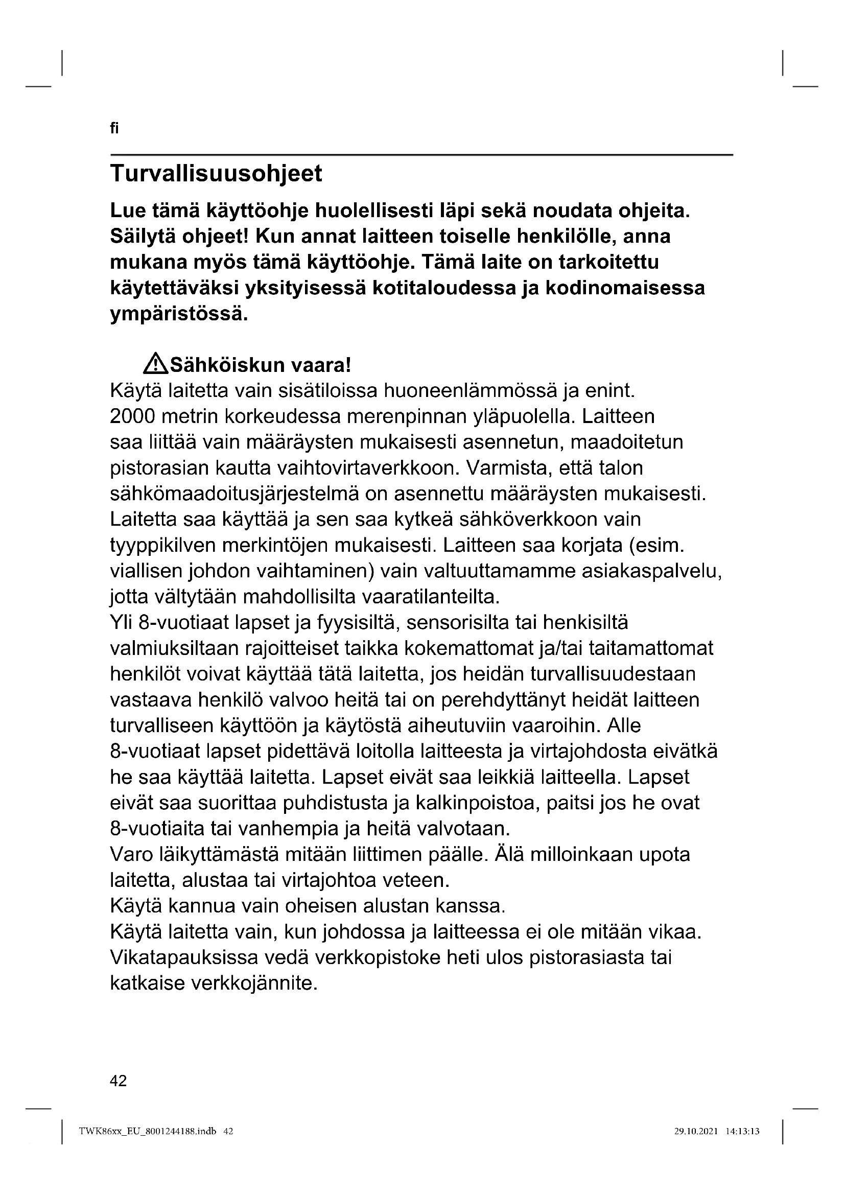 VAROITUS: Tätä laitetta ei saa käyttää kylpyammeiden, suihkujen, pesualtaiden tai muiden vettä sisältävien astioiden läheisyydessä. WTukehtumisvaara! Älä anna lasten leikkiä pakkausmateriaalilla. WLoukkaantumisvaara! Laitteen väärinkäyttö voi johtaa loukkaantumisiin. WHuomio! Elintarvikkeiden kanssa kosketuksissa olevien pintojen puhdistus! Käyttöoppaassa annettuja erityisiä puhdistusohjeita on noudatettava. TWK86xx_EU_8001244188.indb 42TWK86xx_EU_8001244188.indb 42 29.10.2021 14:13:1329.10.2021 14:13:1343