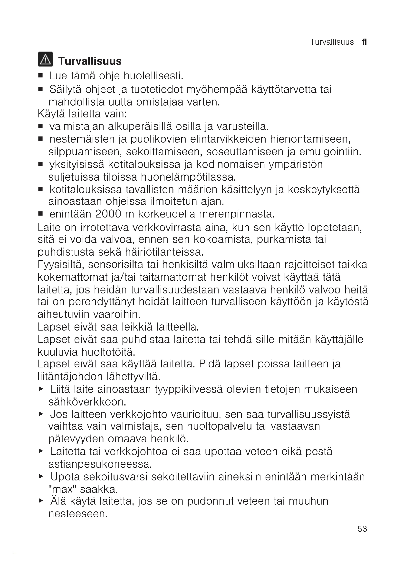 Turvallisuus ¡ Lue tämä ohje huolellisesti. ¡ Säilytä ohjeet ja tuotetiedot myöhempää käyttötarvetta tai mahdollista uutta omistajaa varten. Käytä laitetta vain: ¡ valmistajan alkuperäisillä osilla ja varusteilla. ¡ nestemäisten ja puolikovien elintarvikkeiden hienontamiseen, silppuamiseen, sekoittamiseen, soseuttamiseen ja emulgointiin. ¡ yksityisissä kotitalouksissa ja kodinomaisen ympäristön suljetuissa tiloissa huonelämpötilassa. ¡ kotitalouksissa tavallisten määrien käsittelyyn ja keskeytyksettä ainoastaan ohjeissa ilmoitetun ajan. ¡ enintään 2000m korkeudella merenpinnasta. Laite on irrotettava verkkovirrasta aina, kun sen käyttö lopetetaan, sitä ei voida valvoa, ennen sen kokoamista, purkamista tai puhdistusta sekä häiriötilanteissa. Fyysisiltä, sensorisilta tai henkisiltä valmiuksiltaan rajoitteiset taikka kokemattomat ja/tai taitamattomat henkilöt voivat käyttää tätä laitetta, jos heidän turvallisuudestaan vastaava henkilö valvoo heitä tai on perehdyttänyt heidät laitteen turvalliseen käyttöön ja käytöstä aiheutuviin vaaroihin. Lapset eivät saa leikkiä laitteella. Lapset eivät saa puhdistaa laitetta tai tehdä sille mitään käyttäjälle kuuluvia huoltotöitä. Lapset eivät saa käyttää laitetta. Pidä lapset poissa laitteen ja liitäntäjohdon lähettyviltä. ▶ Liitä laite ainoastaan tyyppikilvessä olevien tietojen mukaiseen sähköverkkoon. ▶ Jos laitteen verkkojohto vaurioituu, sen saa turvallisuussyistä vaihtaa vain valmistaja, sen huoltopalvelu tai vastaavan pätevyyden omaava henkilö. ▶ Laitetta tai verkkojohtoa ei saa upottaa veteen eikä pestä astianpesukoneessa. ▶ Upota sekoitusvarsi sekoitettaviin aineksiin enintään merkintään "max" saakka. ▶ Älä käytä laitetta, jos se on pudonnut veteen tai muuhun nesteeseen.fi Esinevahinkojen välttäminen