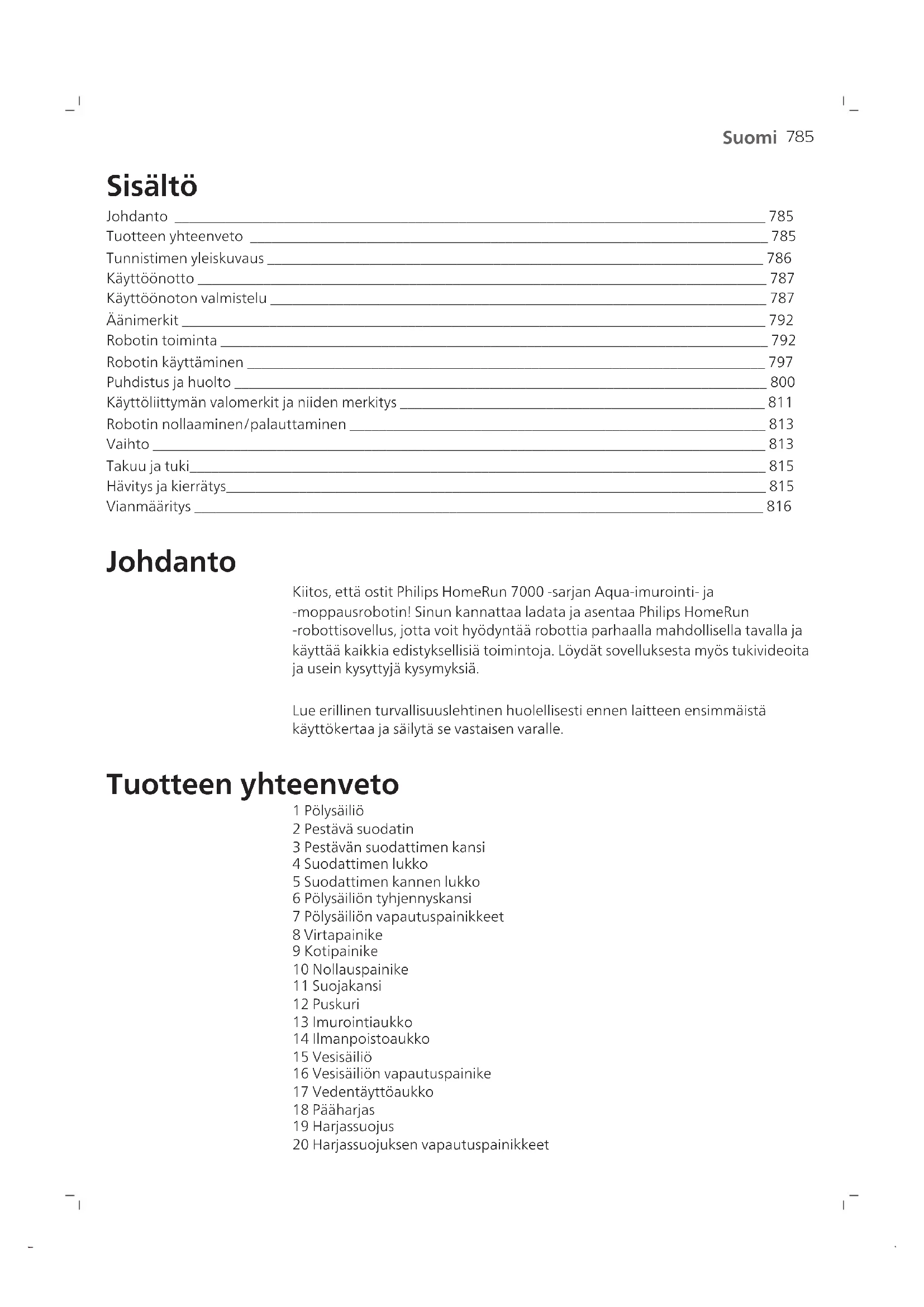 Suomi Sisältö Johdanto _________________________________________________________________________________ 785 Tuotteen yhteenveto _______________________________________________________________________ 785 Tunnistimen yleiskuvaus ____________________________________________________________________ 786 Käyttöönotto ______________________________________________________________________________ 787 Käyttöönoton valmistelu ____________________________________________________________________ 787 Äänimerkit ________________________________________________________________________________ 792 Robotin toiminta ___________________________________________________________________________ 792 Robotin käyttäminen _______________________________________________________________________ 797 Puhdistus ja huolto _________________________________________________________________________ 800 Käyttöliittymän valomerkit ja niiden merkitys __________________________________________________ 811 Robotin nollaaminen/palauttaminen _________________________________________________________ 813 Vaihto ____________________________________________________________________________________ 813 Takuu ja tuki_______________________________________________________________________________ 815 Hävitys ja kierrätys__________________________________________________________________________ 815 Vianmääritys ______________________________________________________________________________ 816 Johdanto Kiitos, että ostit Philips HomeRun 7000 ‑sarjan Aqua-imurointi- ja ‑moppausrobotin! Sinun kannattaa ladata ja asentaa Philips HomeRun ‑robottisovellus, jotta voit hyödyntää robottia parhaalla mahdollisella tavalla ja käyttää kaikkia edistyksellisiä toimintoja. Löydät sovelluksesta myös tukivideoita ja usein kysyttyjä kysymyksiä. Lue erillinen turvallisuuslehtinen huolellisesti ennen laitteen ensimmäistä käyttökertaa ja säilytä se vastaisen varalle. Tuotteen yhteenveto 1 Pölysäiliö 2 Pestävä suodatin 3 Pestävän suodattimen kansi 4 Suodattimen lukko 5 Suodattimen kannen lukko 6 Pölysäiliön tyhjennyskansi 7 Pölysäiliön vapautuspainikkeet 8 Virtapainike 9 Kotipainike 10 Nollauspainike 11 Suojakansi 12 Puskuri 13 Imurointiaukko 14 Ilmanpoistoaukko 15 Vesisäiliö 16 Vesisäiliön vapautuspainike 17 Vedentäyttöaukko 18 Pääharjas 19 Harjassuojus 20 Harjassuojuksen vapautuspainikkeet786 Suomi 21 Pääpyörät 22 Etupyörä 23 Latauspistokkeet (robotti) 24 Sivuharjas 25 Moppityynyteline 26 Pestävä moppityyny (2 kpl) 27 Virtajohto (XU7000) 28 (Lataus)teline (XU7000) 29 IR-signaalin kantama (XU7000) 30 Latauspistokkeet (teline) 31 Virtajohdon liitäntä 32 Matto (XU7000) 33 Pölypussi (2 kpl) (XU7100) 34 Säiliön kansi 35 Pölypussin lokero 36 Automaattinen tyhjennysasema (XU7100) 37 Merkkivalo 38 IR-signaalin kantama 39 Ramppi 40 Automaattisen tyhjennyksen sisäänottoaukko 41 Automaattisen tyhjennyksen ilmanpoistoaukko 42 Latauspistokkeet (teline) 43 Ilmanpoistoventtiili 44 Harjan puhdistustyökalu 45 Virtajohdon liitäntä 46 Virtajohto (XU7100) Tunnistimen yleiskuvaus
