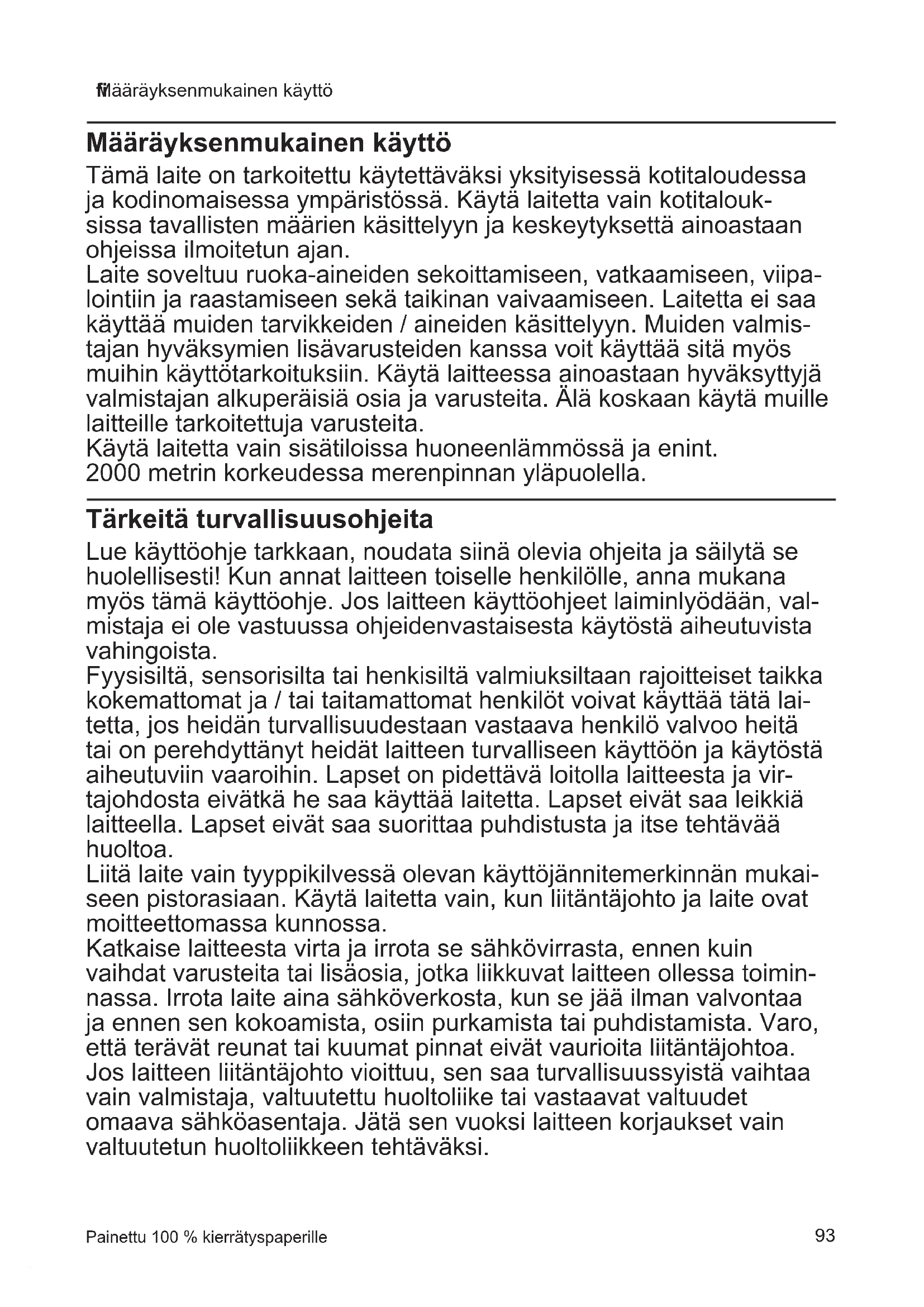 Määräyksenmukainen käyttö Tämä laite on tarkoitettu käytettäväksi yksityisessä kotitaloudessa ja kodinomaisessa ympäristössä. Käytä laitetta vain kotitalouk- sissa tavallisten määrien käsittelyyn ja keskeytyksettä ainoastaan ohjeissa ilmoitetun ajan. Laite soveltuu ruoka-aineiden sekoittamiseen, vatkaamiseen, viipa- lointiin ja raastamiseen sekä taikinan vaivaamiseen. Laitetta ei saa käyttää muiden tarvikkeiden / aineiden käsittelyyn. Muiden valmis- tajan hyväksymien lisävarusteiden kanssa voit käyttää sitä myös muihin käyttötarkoituksiin. Käytä laitteessa ainoastaan hyväksyttyjä valmistajan alkuperäisiä osia ja varusteita. Älä koskaan käytä muille laitteille tarkoitettuja varusteita. Käytä laitetta vain sisätiloissa huoneenlämmössä ja enint. 2000 metrin korkeudessa merenpinnan yläpuolella. Tärkeitä turvallisuusohjeita Lue käyttöohje tarkkaan, noudata siinä olevia ohjeita ja säilytä se huolellisesti! Kun annat laitteen toiselle henkilölle, anna mukana myös tämä käyttöohje. Jos laitteen käyttöohjeet laiminlyödään, val- mistaja ei ole vastuussa ohjeidenvastaisesta käytöstä aiheutuvista vahingoista. Fyysisiltä, sensorisilta tai henkisiltä valmiuksiltaan rajoitteiset taikka kokemattomat ja / tai taitamattomat henkilöt voivat käyttää tätä lai- tetta, jos heidän turvallisuudestaan vastaava henkilö valvoo heitä tai on perehdyttänyt heidät laitteen turvalliseen käyttöön ja käytöstä aiheutuviin vaaroihin. Lapset on pidettävä loitolla laitteesta ja vir- tajohdosta eivätkä he saa käyttää laitetta. Lapset eivät saa leikkiä laitteella. Lapset eivät saa suorittaa puhdistusta ja itse tehtävää huoltoa. Liitä laite vain tyyppikilvessä olevan käyttöjännitemerkinnän mukai- seen pistorasiaan. Käytä laitetta vain, kun liitäntäjohto ja laite ovat moitteettomassa kunnossa. Katkaise laitteesta virta ja irrota se sähkövirrasta, ennen kuin vaihdat varusteita tai lisäosia, jotka liikkuvat laitteen ollessa toimin- nassa. Irrota laite aina sähköverkosta, kun se jää ilman valvontaa ja ennen sen kokoamista, osiin purkamista tai puhdistamista. Varo, että terävät reunat tai kuumat pinnat eivät vaurioita liitäntäjohtoa. Jos laitteen liitäntäjohto vioittuu, sen saa turvallisuussyistä vaihtaa vain valmistaja, valtuutettu huoltoliike tai vastaavat valtuudet omaava sähköasentaja. Jätä sen vuoksi laitteen korjaukset vain valtuutetun huoltoliikkeen tehtäväksi. Painettu 100 % kierrätyspaperille Määräyksenmukainen käyttö94