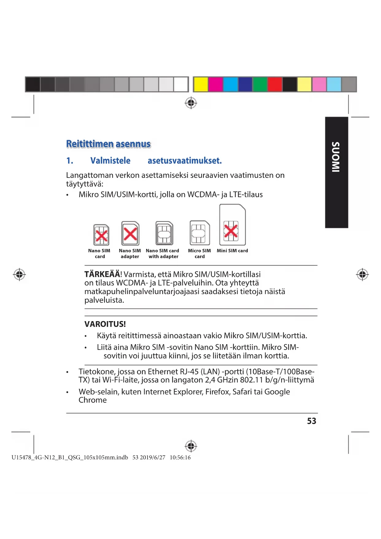 Langattoman verkon asettamiseksi seuraavien vaatimusten on täytyttävä: t Mikro SIM/USIM-kortti, jolla on WCDMA- ja LTE-tilaus TÄRKEÄÄ! Varmista, että Mikro SIM/USIM-kortillasi on tilaus WCDMA- ja LTE-palveluihin. Ota yhteyttä matkapuhelinpalveluntarjoajaasi saadaksesi tietoja näistä palveluista. VAROITUS! t Käytä reitittimessä ainoastaan vakio Mikro SIM/USIM-korttia. t Liitä aina Mikro SIM -sovitin Nano SIM -korttiin. Mikro SIM- sovitin voi juuttua kiinni, jos se liitetään ilman korttia. t 5JFUPLPOFKPTTBPO&UIFSOFU3+-"/QPSUUJ#BTF5#BTF TX) tai Wi-Fi-laite, jossa on langaton 2,4 GHzin 802.11 b/g/n-liittymä t 8FCTFMBJOLVUFO*OUFSOFU&YQMPSFS'JSFGPY4BGBSJUBJ(PPHMF Chrome Mini SIM card Micro SIM card Nano SIM card Nano SIM adapter Nano SIM card with adapter U15478_4G-N12_B1_QSG_105x105mm.indb 53 2019/6/27 10:56:16SUOMI