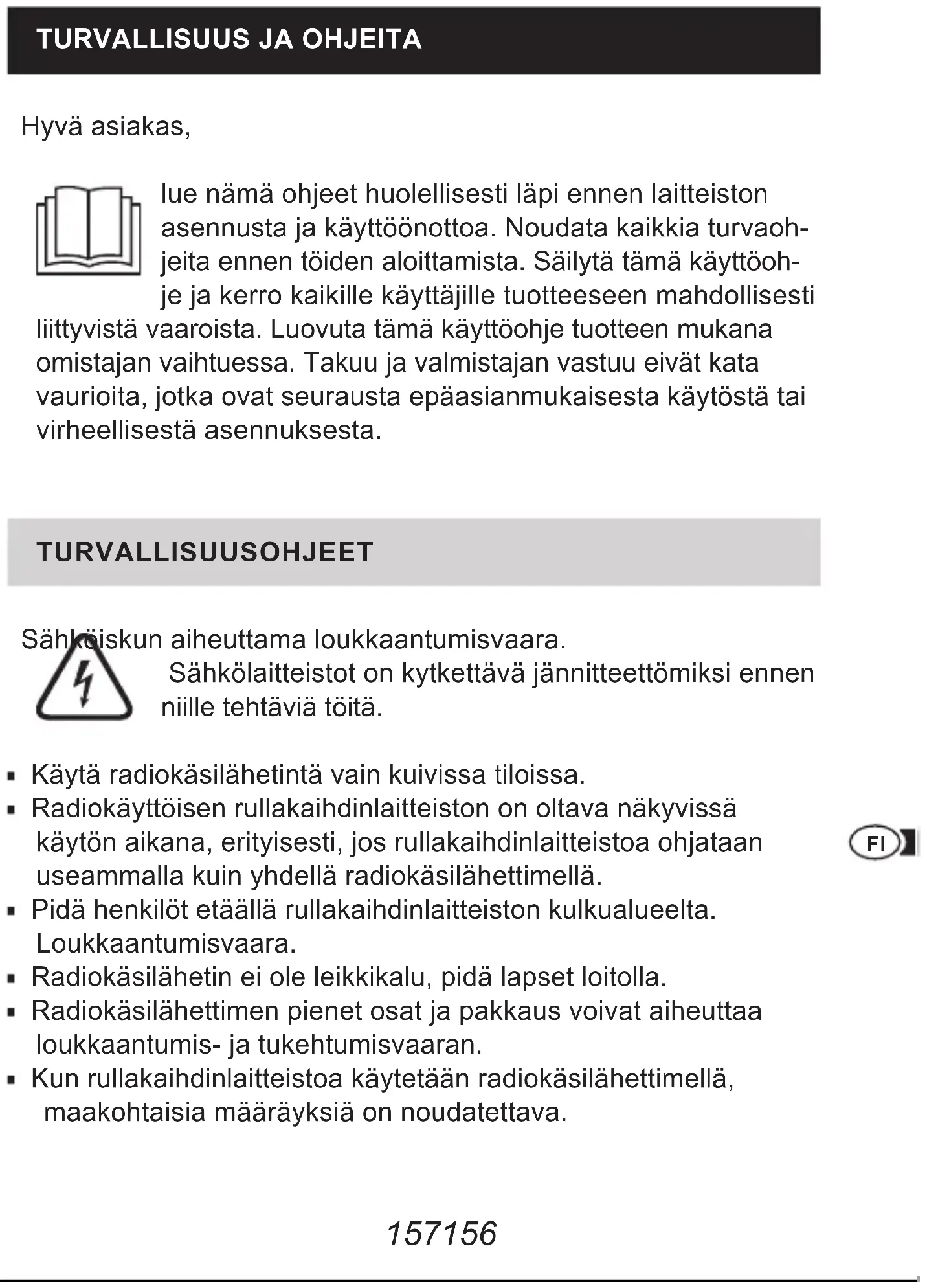 Hyvä asiakas, lue nämä ohjeet huolellisesti läpi ennen laitteiston asennusta ja käyttöönottoa Noudata kaikkia turvaoh- jeita ennen töiden aloittamista Säilytä tämä käyttöoh- je ja kerro kaikille käyttäjille tuotteeseen mahdollisesti liittyvistä vaaroista Luovuta tämä käyttöohje tuotteen mukana omistajan vaihtuessa Takuu ja valmistajan vastuu eivät kata vaurioita, jotka ovat seurausta epäasianmukaisesta käytöstä tai virheellisestä asennuksesta TURVALLISUUSOHJEET Sähköiskun aiheuttama loukkaantumisvaara Sähkölaitteistot on kytkettävä jännitteettömiksi ennen niille tehtäviä töitä Käytä radiokäsilähetintä vain kuivissa tiloissa Radiokäyttöisen rullakaihdinlaitteiston on oltava näkyvissä käytön aikana, erityisesti, jos rullakaihdinlaitteistoa ohjataan useammalla kuin yhdellä radiokäsilähettimellä Pidä henkilöt etäällä rullakaihdinlaitteiston kulkualueelta Loukkaantumisvaara Radiokäsilähetin ei ole leikkikalu, pidä lapset loitolla Radiokäsilähettimen pienet osat ja pakkaus voivat aiheuttaa loukkaantumis- ja tukehtumisvaaran Kun rullakaihdinlaitteistoa käytetään radiokäsilähettimellä, maakohtaisia määräyksiä on noudatettava158 Käytä saman tyypin paristoja, LR03 / AAA Älä aja putkimoottoria pääteasentojen yli Loukkaantumisvaara!
