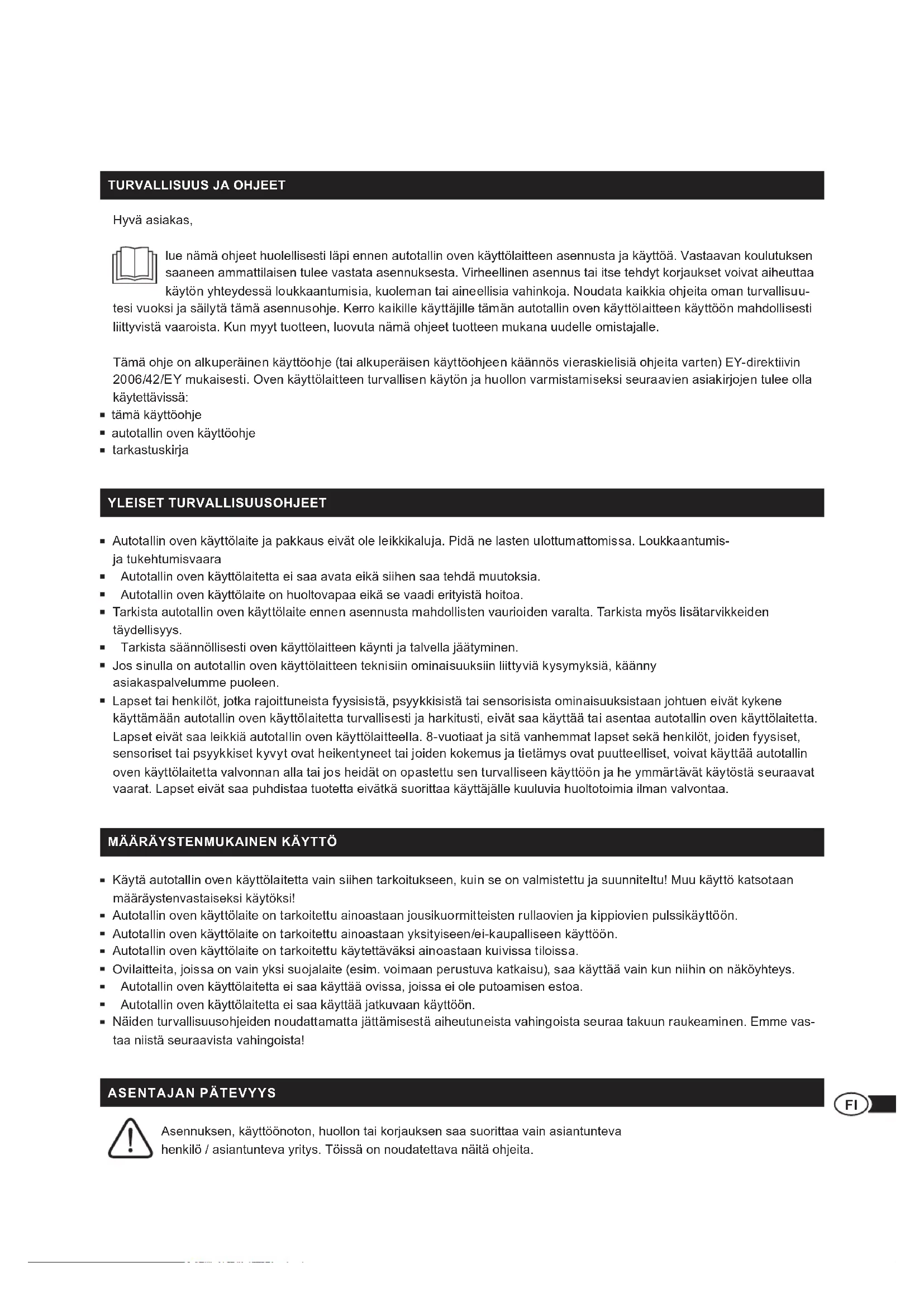 Hyvä asiakas, lue nämä ohjeet huolellisesti läpi ennen autotallin oven käyttölaitteen asennusta ja käyttöä. Vastaavan koulutuksen saaneen ammattilaisen tulee vastata asennuksesta Virheellinen asennus tai itse tehdyt korjaukset voivat aiheuttaa käytön yhteydessä loukkaantumisia, kuoleman tai aineellisia vahinkoja. Noudata kaikkia ohjeita oman turvallisuu- tesi vuoksi ja säilytä tämä asennusohje. Kerro kaikille käyttäjille tämän autotallin oven käyttölaitteen käyttöön mahdollisesti liittyvistä vaaroista. Kun myyt tuotteen, luovuta nämä ohjeet tuotteen mukana uudelle omistajalle. Tämä ohje on alkuperäinen käyttöohje (tai alkuperäisen käyttöohjeen käännös vieraskielisiä ohjeita varten) EY-direktiivin 2006/42/EY mukaisesti. Oven käyttölaitteen turvallisen käytön ja huollon varmistamiseksi seuraavien asiakirjojen tulee olla käytettävissä: tämä käyttöohje autotallin oven käyttöohje tarkastuskirja YLEISET TURVALLISUUSOHJEET Autotallin oven käyttölaite ja pakkaus eivät ole leikkikaluja. Pidä ne lasten ulottumattomissa. Loukkaantumis- ja tukehtumisvaara Autotallin oven käyttölaitetta ei saa avata eikä siihen saa tehdä muutoksia. Autotallin oven käyttölaite on huoltovapaa eikä se vaadi erityistä hoitoa. Tarkista autotallin oven käyttölaite ennen asennusta mahdollisten vaurioiden varalta. Tarkista myös lisätarvikkeiden täydellisyys Tarkista säännöllisesti oven käyttölaitteen käynti ja talvella jäätyminen. Jos sinulla on autotallin oven käyttölaitteen teknisiin ominaisuuksiin liittyviä kysymyksiä, käänny asiakaspalvelumme puoleen Lapset tai henkilöt, jotka rajoittuneista fyysisistä, psyykkisistä tai sensorisista ominaisuuksistaan johtuen eivät kykene käyttämään autotallin oven käyttölaitetta turvallisesti ja harkitusti, eivät saa käyttää tai asentaa autotallin oven käyttölaitetta. Lapset eivät saa leikkiä autotallin oven käyttölaitteella. 8-vuotiaat ja sitä vanhemmat lapset sekä henkilöt, joiden fyysiset, sensoriset tai psyykkiset kyvyt ovat heikentyneet tai joiden kokemus ja tietämys ovat puutteelliset, voivat käyttää autotallin oven käyttölaitetta valvonnan alla tai jos heidät on opastettu sen turvalliseen käyttöön ja he ymmärtävät käytöstä seuraavat vaarat Lapset eivät saa puhdistaa tuotetta eivätkä suorittaa käyttäjälle kuuluvia huoltotoimia ilman valvontaa