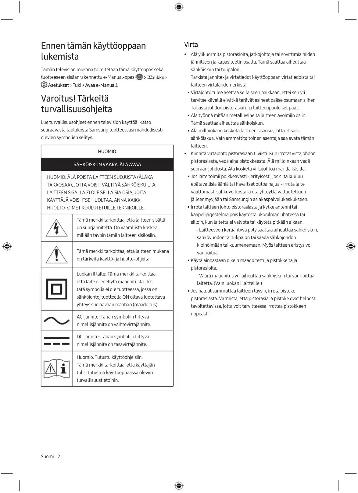 - Batteritypen kan variere avhengig av modellen. Norsk - 9 NorskEnnen tämän käyttöoppaan lukemista Tämän television mukana toimitetaan tämä käyttöopas sekä tuotteeseen sisäänrakennettu e-Manual-opas ( > Valikko > Asetukset > Tuki > Avaa e-Manual). Varoitus! Tärkeitä turvallisuusohjeita Lue turvallisuusohjeet ennen television käyttöä. Katso seuraavasta taulukosta Samsung tuotteessasi mahdollisesti olevien symbolien selitys. HUOMIO SÄHKÖISKUN VAARA. ÄLÄ AVAA. HUOMIO: ÄLÄ POISTA LAITTEEN SUOJUSTA (ÄLÄKÄ TAKAOSAA), JOTTA VOISIT VÄLTTYÄ SÄHKÖISKUILTA. LAITTEEN SISÄLLÄ EI OLE SELLAISIA OSIA, JOITA KÄYTTÄJÄ VOISI ITSE HUOLTAA. ANNA KAIKKI HUOLTOTOIMET KOULUTETUILLE TEKNIKOILLE. Tämä merkki tarkoittaa, että laitteen sisällä on suurjännitettä. On vaarallista koskea millään tavoin tämän laitteen sisäosiin. Tämä merkki tarkoittaa, että laitteen mukana on tärkeitä käyttö- ja huolto-ohjeita. LuokanII laite: Tämä merkki tarkoittaa, että laite ei edellytä maadoitusta. Jos tätä symbolia ei ole tuotteessa, jossa on sähköjohto, tuotteella ON oltava luotettava yhteys suojaavaan maahan (maadoitus). AC-jännite: Tähän symboliin liittyvä nimellisjännite on vaihtovirtajännite. DC-jännite: Tähän symboliin liittyvä nimellisjännite on tasavirtajännite. Huomio. Tutustu käyttöohjeisiin: Tämä merkki tarkoittaa, että käyttäjän tulisi tutustua käyttöoppaassa oleviin turvallisuustietoihin. Virta