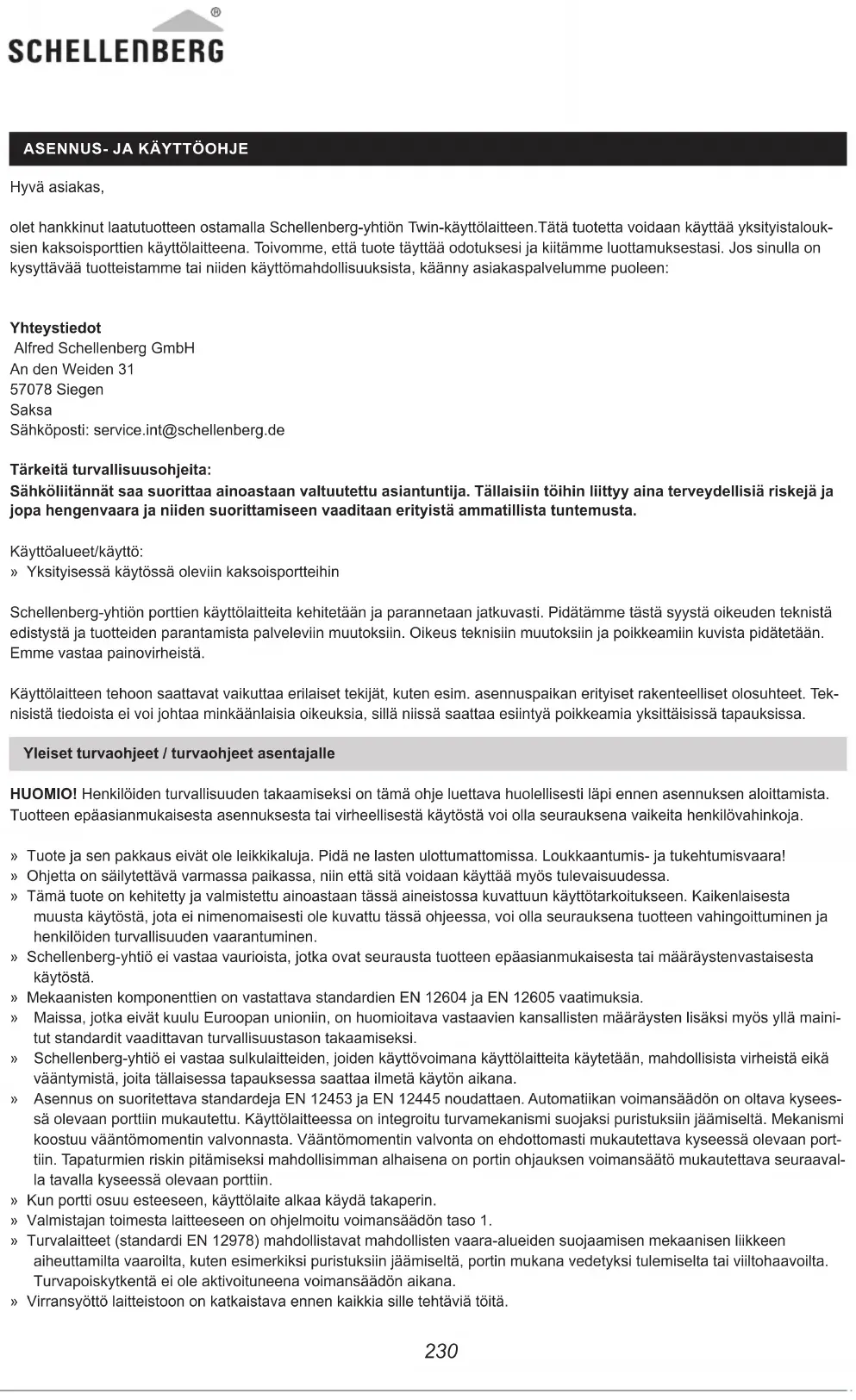 » Suosittelemme asentamaan vähintään yhden varoitusvalon jokaista laitteistoa kohden sekä yhden varoituskilven, joka kiinnitetään asianmukaisesti portin rakenteeseen. » Schellenberg ei ota vastuuta käyttölaitteen turvallisesta ja toimivasta käytöstä, mikäli laitteistossa käytetään muita kuin Schellenbergin toimittamia komponentteja. » Kunnossapitoon saa käyttää ainoastaan Schellenbergin alkuperäisiä varaosia. » Komponentteihin, jotka ovat osa käyttökoneistoa, ei saa tehdä minkäänlaisia muutoksia. » Laitteiston asentajan on toimitettava kaikki järjestelmän manuaaliseen käyttöön hätätilanteissa liittyvät tiedot laitteiston haltijalle sekä luovutettava hänelle tämä asennusohje, joka sisältyy tuotteen toimitukseen. » Porttijärjestelmän läheisyydessä ei saa oleskella lapsia eikä aikuisia sen ollessa käynnissä. » Kauko-ohjaimet ja muut impulssilaitteet on pidettävä lasten ulottumattomissa portin käyttölaitteen tahattoman aktivoinnin välttämiseksi. » Portin läpi saa mennä tai ajaa vasta sen ollessa täysin auki. » Laitteiston haltijan ei tulisi itse tehdä käyttölaitteelle minkäänlaisia korjaustöitä tai muita toimenpiteitä. Käänny aina päte- vän ammattihenkilöstön puoleen. » Älä hävitä käytettyjä paristoja kotitalousjätteen mukana! Alan liikkeissä on tätä varten vastaavia keräyslaatikoita. » Kaikki toimintatavat, joita ei erityisesti ole mainittu tässä käyttöohjeessa, ovat kiellettyjä. » Porttilaitteistoa ei saa ottaa käyttöön, ennen kuin on todettu, että porttilaitteisto yhdessä tämän käyttölaitteen kanssa vastaa kaikkien asiaankuuluvien määräysten ja EY-direktiivien vaatimuksia. Asennuksen tarkastus Käyttölaitteen vaadittavan turvallisuuden ja häiriöttömän käytön takaamiseksi on tarkastettava seuraavat seikat: » Sähköisten ohjauslaitteiden kotelot on asennettava sellaiselle etäisyydelle käyttölaitteista, että moottorin kaapelia ei mis- sään tapauksessa tarvitse pidentää. » Asennettaessa komponentteja muurattuihin pylväisiin tai betonipylväisiin suosittelemme käyttämään työstössä liima-ank- kureita (kemialliset ankkurit), jotka takaavat jännityksettömän kiinnityksen. » Portin on sovelluttava käyttölaitteen kanssa käytettäväksi. Erityisen tärkeää on varmistaa, että se on riittävän tukeva ja jäykkä. Metalliporttien yhteydessä suosittelemme asentamaan ruuviliitoksen portin läpi. Puuporttien yhteydessä kiinnitys- ruuvien alle on asennettava sisä- ja ulkopuolelle metallilevyt, koska ruuviliitos löystyy muuten aikaa myöten. » Mittojen ja painojen on oltava teknisten ominaisuuksien mukaisia. » Porttien sujuva ja tasainen liike on tarkastettava. Portin koko liikkuma-alueen on oltava vapaa hankauksesta ja esteistä. » Varmista, että saranat ovat moitteettomassa kunnossa. » Asennon ”Portti suljettu” mekaanisten päätevasteiden on oltava paikoillaan. » Poista mahdolliset lukot ja salvat. Suosittelemme suorittamaan mahdolliset taontatyöt ennen käyttölaitteen asentamista. » Huomaa, että portin liikealueella on oltava riittävästi tilaa, avautumiskulmasta riippuen. Asennuksen jälkeen » Porttien läpi ei saa kulkea niiden ollessa vielä liikkeessä.Ennen portin läpi kulkemista on odotettava, että se on täysin avautunut. » Henkilöiden oleskelu porttien välissä on ehdottomasti kiellettyä. » Porttijärjestelmän välittömässä läheisyydessä ei saa oleskella, eikä siellä saa säilyttää esineitä. Se on erityisesti kiellettyä käytön aikana. » Porttien liikettä ei saa yrittää hidastaa tahallaan. » Oksat ja pensaat eivät saa rajoittaa automaattisen porttilaitteiston toimintaa. » Porttia saa liikuttaa manuaalisesti vasta sen jälkeen, kun sen hätävapautus on aktivoitu (lukitus vapautettu). » Jännitteensyöttö laitteistoon on katkaistava ennen kaikkia sille tehtäviä töitä. » Järjestelmän toimintahäiriön yhteydessä porttien lukitus on vapautettava niiden läpi ajamisen mahdollistamiseksi. Tämän jälkeen on annettava pätevän ammattihenkilöstön korjata tilanne. » Suosittelemme tarkastamaan porttilaitteiston, turvalaitteiden ja lisävarusteiden toiminnan vähintään puolen vuoden välein pätevän ammattihenkilöstön toimesta. » Talvikäyttö (sivu 235) takaa moitteettoman käytön talvikuukausien aikana.232 Takuuehdot Hyvä asiakas, kiitämme sinua luottamuksesta, jota olet osoittanut SCHELLENBERG-yhtiötä kohtaan ostamalla valmistamamme tuotteen. Kaikki SCHELLENBERG-tuotteet ovat testattuja ja niiden valmistus tapahtuu tiukan SCHELLENBERG-laadunvalvonnan alaisena. Takaamme tästä syystä, että tuotteissamme ei esiinny materiaali- tai valmistusvirheitä. Takuu ei kata vaurioita, jotka ovat seurausta: » normaalista käytöstä johtuvasta kulumisesta » epäasianmukaisesta asennuksesta, liittämisestä, käytöstä tai käsittelystä » luonnonvoimista tai muista ulkoisista vaikutuksista » epäasianmukaisista huolto- tai korjaustoimenpiteistä kolmansien osapuolten toimesta » teknisistä muutoksista kolmansien osapuolten toimesta Takuutapauksessa joko korjaamme tuotteen tai vaihdamme sen uuteen vastaavaan SCHELLENBERG-tuotteeseen valin- tamme mukaan. Takuuaika ei pitene tuotteen vaihdon tai korjauksen seurauksena. Tämä valmistajan myöntämä takuu ei koske lainmukaisia takuuvaatimuksia, joita sinulla kuluttajana voi olla myyjälle voimassa olevan lain ja erityisten kuluttajaa koskevien suojamääräysten mukaisesti. Valmistajan takuu ei sulje pois eikä rajoita lainmukaista takuuta. Takuutapauksessa on aina esitettävä alkuperäisen ostotositteen kopio. Lähettäessäsi tuotteen meille takuutapauksessa liitä toimitukseen aina alkuperäisen ostotositteen kopio ja vian kuvaus. Twin 300 -käyttölaitteen takuu on voimassa 24 kuukautta ostopäivästä alkaen. Käänny asiakaspalvelumme puoleen kaikissa takuu- ja varaosa-asioissa, ja jos sinulla on muuta tuotteen asianmu- kaiseen asennukseen
