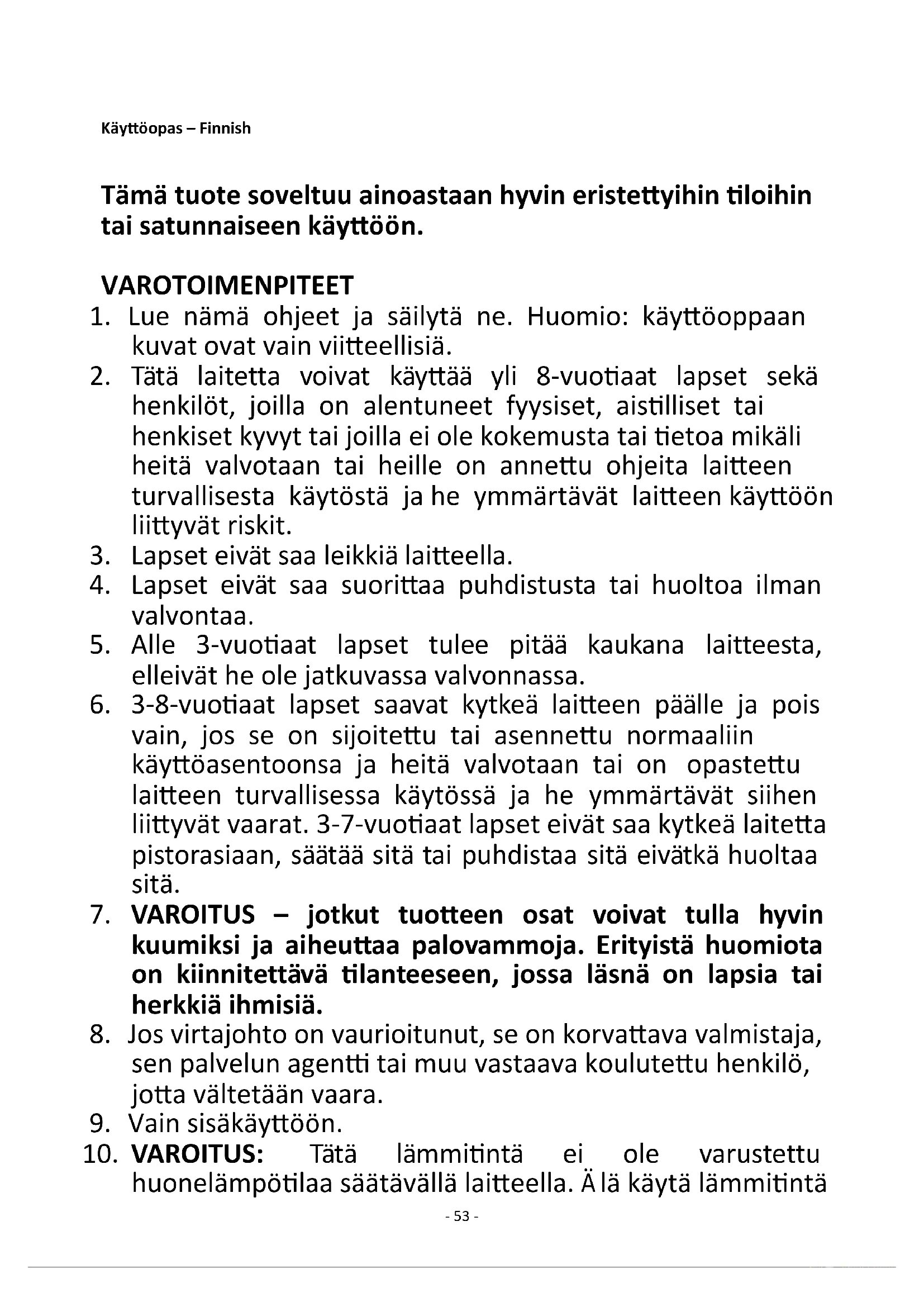 10. VAROITUS: Tätä lämmitintä ei ole varustettu