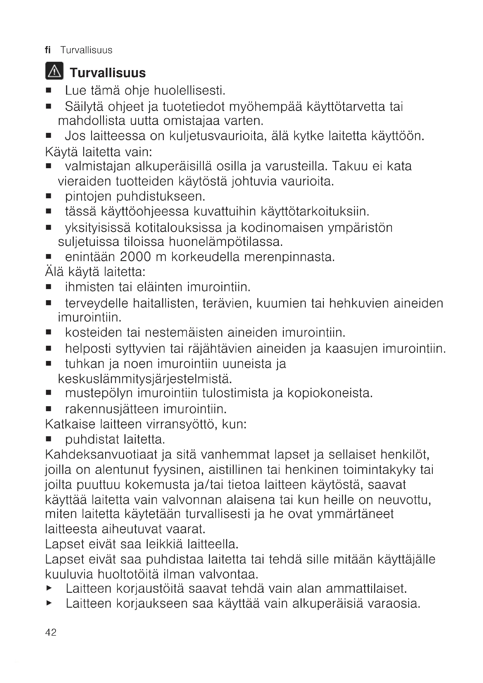 ▶ Jos laitteen verkkojohto vaurioituu, sen saa turvallisuussyistä vaihtaa vain valmistaja, sen huoltopalvelu tai vastaavan pätevyyden omaava henkilö. ▶ Älä käytä viallista laitetta. ▶ Jos laitteen pinta on haljennut tai murtunut, sitä ei saa missään tapauksessa käyttää. ▶ Älä vedä verkkojohdosta, kun irrotat laitteen sähköverkosta. Vedä aina verkkojohdon pistokkeesta. ▶ Älä vedä tai kanna laitetta verkkojohdosta. ▶ Jos laite tai verkkojohto on rikki, irrota heti verkkojohdon pistoke tai kytke sulake sulakerasiassa pois päältä. ▶ Soita huoltopalveluun. →Sivu 45 ▶ Käytä laitetta vain suljetuissa tiloissa. ▶ Älä altista laitetta voimakkaalle kuumuudelle tai kosteudelle. ▶ Älä käytä laitteen puhdistukseen höyry- tai painepesuria. ▶ Varmista, että verkkojohto ei koske laitteen kuumiin osiin tai lämmönlähteisiin. ▶ Varmista, että verkkojohto ei koske teräviin ulokkeisiin tai reunoihin. ▶ Verkkojohtoa ei saa taittaa, jättää puristuksiin eikä muuttaa. ▶ Liitä laite ainoastaan tyyppikilvessä olevien tietojen mukaiseen sähköverkkoon. ▶ Älä päästä palavia tai alkoholipitoisia aineita pölypussiin ja suodattimiin. ▶ Älä käytä laitteen puhdistuksen yhteydessä palavia tai alkoholipitoisia aineita. ▶ Vedä verkkoliitäntäjohto kokonaan ulos. ▶ Pidä vaatteet, hiukset, sormet ja muut kehon osat poissa laitteen aukkojen ja liikkuvien osien läheltä. ▶ Älä suuntaa putkea tai suulakkeita silmiin, hiuksiin, korviin tai suuhun. ▶ Varmista, että laitteen alapuolella ei ole henkilöitä, kun imuroit portaita. ▶ Kytke laite imurointitaukojen ajaksi pois päältä ja irrota pistoke pistorasiasta. ▶ Anna verkkoliitäntäjohdon kelautua laitteen sisään.fi Esinevahinkojen välttäminen