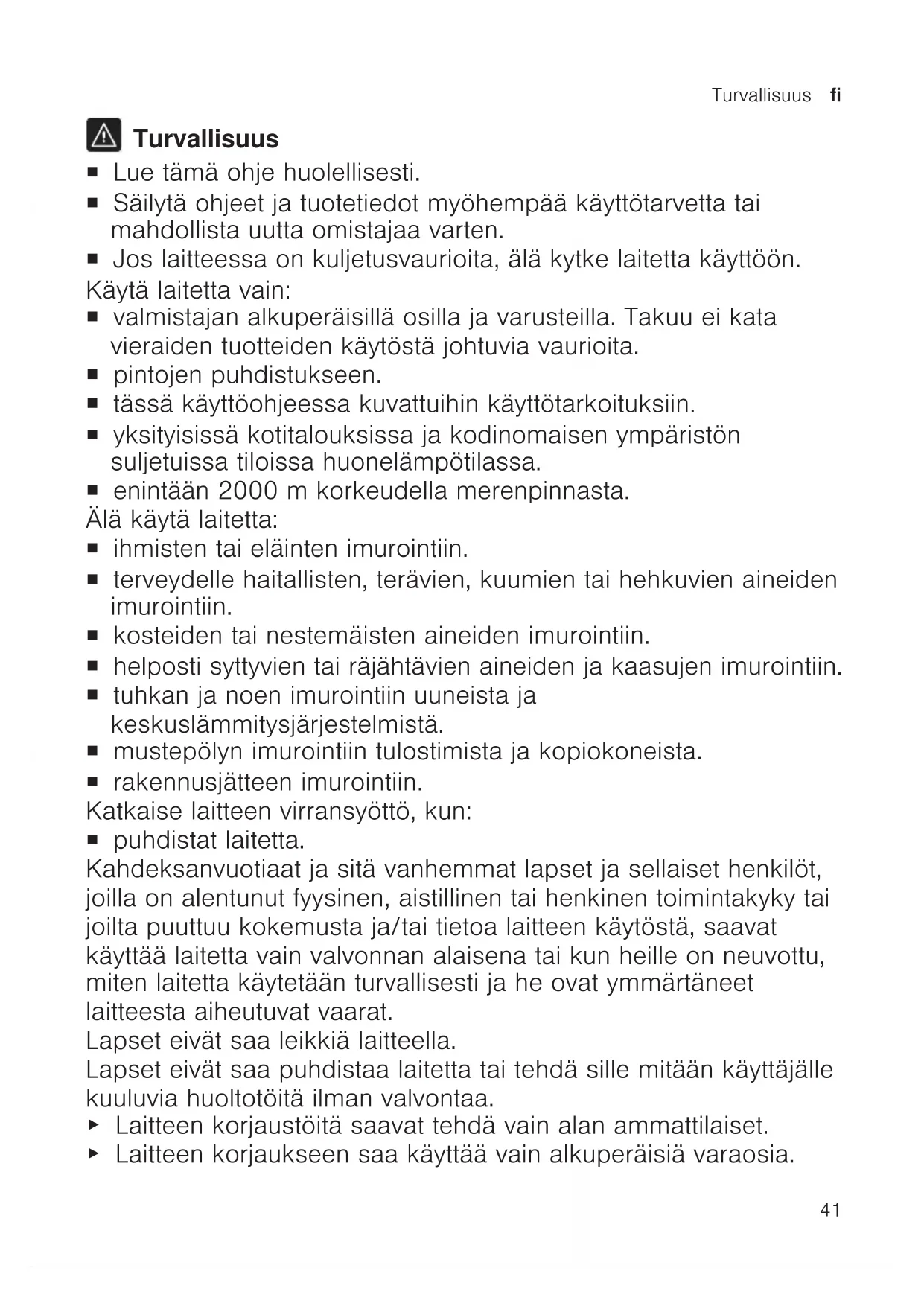 Turvallisuus ¡ Lue tämä ohje huolellisesti. ¡ Säilytä ohjeet ja tuotetiedot myöhempää käyttötarvetta tai mahdollista uutta omistajaa varten. ¡ Jos laitteessa on kuljetusvaurioita, älä kytke laitetta käyttöön. Käytä laitetta vain: ¡ valmistajan alkuperäisillä osilla ja varusteilla. Takuu ei kata vieraiden tuotteiden käytöstä johtuvia vaurioita. ¡ pintojen puhdistukseen. ¡ tässä käyttöohjeessa kuvattuihin käyttötarkoituksiin. ¡ yksityisissä kotitalouksissa ja kodinomaisen ympäristön suljetuissa tiloissa huonelämpötilassa. ¡ enintään 2000m korkeudella merenpinnasta. Älä käytä laitetta: ¡ ihmisten tai eläinten imurointiin. ¡ terveydelle haitallisten, terävien, kuumien tai hehkuvien aineiden imurointiin. ¡ kosteiden tai nestemäisten aineiden imurointiin. ¡ helposti syttyvien tai räjähtävien aineiden ja kaasujen imurointiin. ¡ tuhkan ja noen imurointiin uuneista ja keskuslämmitysjärjestelmistä. ¡ mustepölyn imurointiin tulostimista ja kopiokoneista. ¡ rakennusjätteen imurointiin. Katkaise laitteen virransyöttö, kun: ¡ puhdistat laitetta. Kahdeksanvuotiaat ja sitä vanhemmat lapset ja sellaiset henkilöt, joilla on alentunut fyysinen, aistillinen tai henkinen toimintakyky tai joilta puuttuu kokemusta ja/tai tietoa laitteen käytöstä, saavat käyttää laitetta vain valvonnan alaisena tai kun heille on neuvottu, miten laitetta käytetään turvallisesti ja he ovat ymmärtäneet laitteesta aiheutuvat vaarat. Lapset eivät saa leikkiä laitteella. Lapset eivät saa puhdistaa laitetta tai tehdä sille mitään käyttäjälle kuuluvia huoltotöitä ilman valvontaa. ▶ Laitteen korjaustöitä saavat tehdä vain alan ammattilaiset. ▶ Laitteen korjaukseen saa käyttää vain alkuperäisiä varaosia.fi Turvallisuus