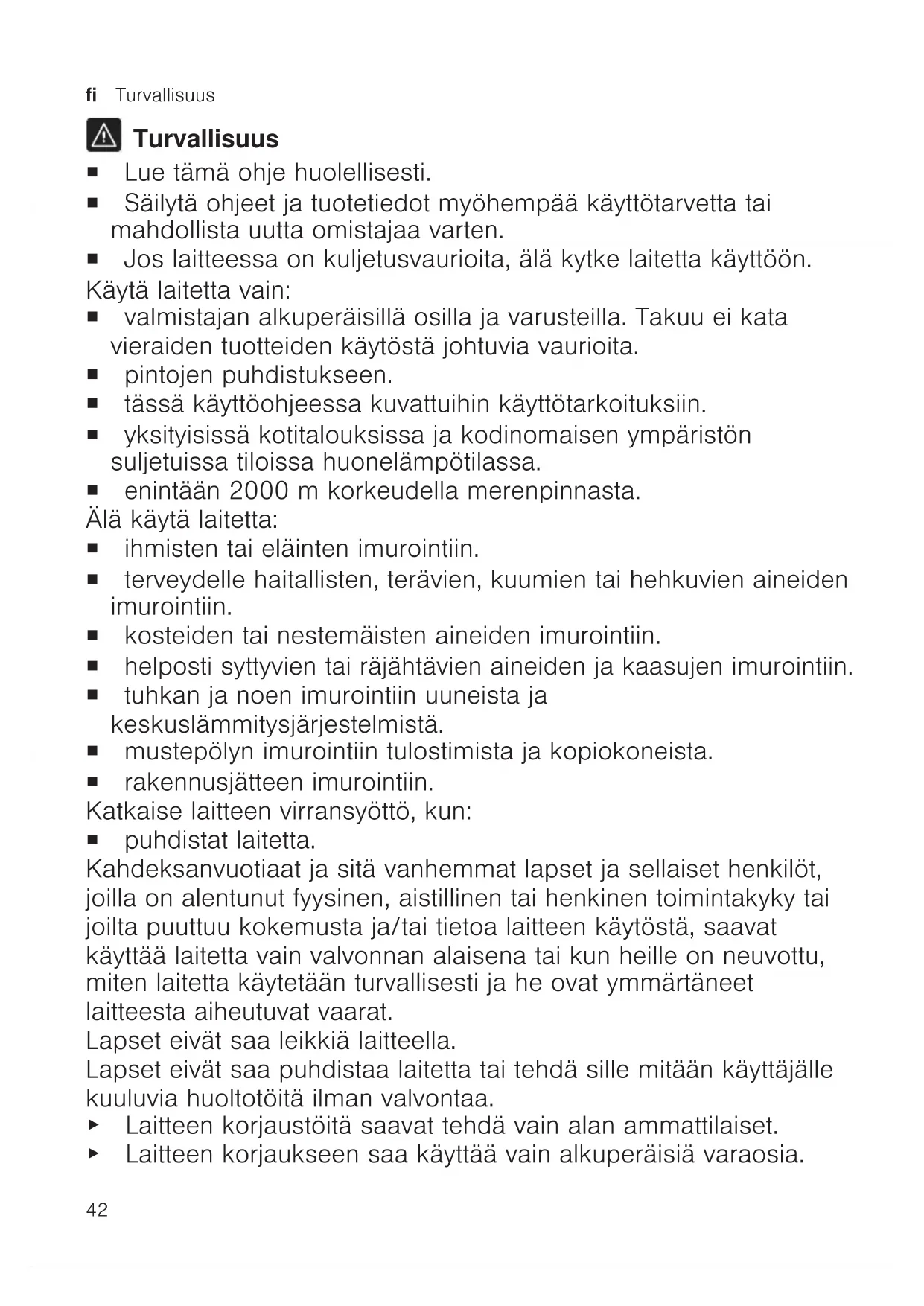 Turvallisuus ¡ Lue tämä ohje huolellisesti. ¡ Säilytä ohjeet ja tuotetiedot myöhempää käyttötarvetta tai mahdollista uutta omistajaa varten. ¡ Jos laitteessa on kuljetusvaurioita, älä kytke laitetta käyttöön. Käytä laitetta vain: ¡ valmistajan alkuperäisillä osilla ja varusteilla. Takuu ei kata vieraiden tuotteiden käytöstä johtuvia vaurioita. ¡ pintojen puhdistukseen. ¡ tässä käyttöohjeessa kuvattuihin käyttötarkoituksiin. ¡ yksityisissä kotitalouksissa ja kodinomaisen ympäristön suljetuissa tiloissa huonelämpötilassa. ¡ enintään 2000m korkeudella merenpinnasta. Älä käytä laitetta: ¡ ihmisten tai eläinten imurointiin. ¡ terveydelle haitallisten, terävien, kuumien tai hehkuvien aineiden imurointiin. ¡ kosteiden tai nestemäisten aineiden imurointiin. ¡ helposti syttyvien tai räjähtävien aineiden ja kaasujen imurointiin. ¡ tuhkan ja noen imurointiin uuneista ja keskuslämmitysjärjestelmistä. ¡ mustepölyn imurointiin tulostimista ja kopiokoneista. ¡ rakennusjätteen imurointiin. Katkaise laitteen virransyöttö, kun: ¡ puhdistat laitetta. Kahdeksanvuotiaat ja sitä vanhemmat lapset ja sellaiset henkilöt, joilla on alentunut fyysinen, aistillinen tai henkinen toimintakyky tai joilta puuttuu kokemusta ja/tai tietoa laitteen käytöstä, saavat käyttää laitetta vain valvonnan alaisena tai kun heille on neuvottu, miten laitetta käytetään turvallisesti ja he ovat ymmärtäneet laitteesta aiheutuvat vaarat. Lapset eivät saa leikkiä laitteella. Lapset eivät saa puhdistaa laitetta tai tehdä sille mitään käyttäjälle kuuluvia huoltotöitä ilman valvontaa. ▶ Laitteen korjaustöitä saavat tehdä vain alan ammattilaiset. ▶ Laitteen korjaukseen saa käyttää vain alkuperäisiä varaosia.Turvallisuus fi