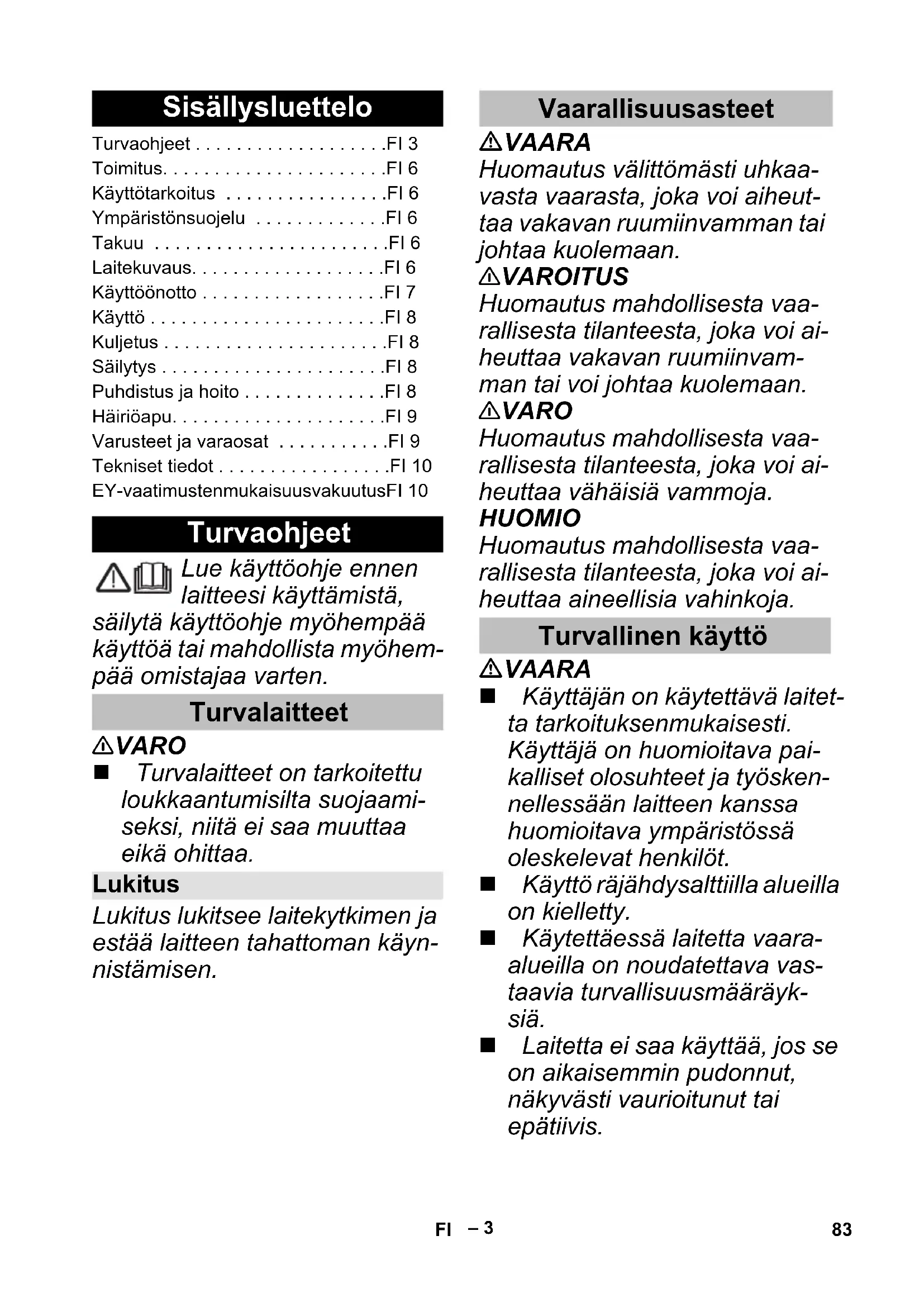 84 dB(A) Battery Power 18/25 Typ av uppladdningsbart batteri Li-Ion Märkspänning batteripaket 18 V = Nominell kapacitet (enligt IEC/EN 61690) 2,4 Ah Märkkapacitet (enligt batteritillverkaren) 2,5 Ah Nominell energi (enligt UN 3480) 43,2 Wh Laddström max. 4 A Drifttemperatur -20...40 °C Laddningstemperatur 0...40 °C Lagringstemperatur -20...60 °C Vikt 0,5 kg Mått (L x B x H) 133 x 88 x 50 mm Standardladdare BC 18 V Märkspänning 100-240 V Frekvens 50-60 Hz Strömförbrukning (max.) 0,3 A Skyddsklass II Märkspänning batteripaket 18 V = Laddström (max.) 0,5 A Laddtid (vid tomt batteripaket) ca 4 h Vikt (utan batteripaket) 0,16 kg EU-försäkran om överensstämmelse Produkt: Trycktvätt (batteridriven) Typ: 1.328-000 1.328-1xx Tillämpliga EU-direktiv 2014/35/EU 2014/35/EU 2014/30/EU 2014/30/EU 2011/65/EU 2011/65/EU 2000/14/EG – Tillämpade harmoniserade normer EN 60335–1 EN 60335–1 – EN 60335-2-29 EN 60335–2–54 EN 60335–2–54 EN 62233: 2008 EN 62233: 2008 EN 55014–1:2017 EN 55014–1:2017 EN 55014–2: 2015 EN 55014–2: 2015 – EN 61000–3–2: 2014 – EN 61000–3–3: 2013 EN 50581 EN 50581 Tillämpad metod för överensstämmelsevärdering 2000/14/EG: Bilaga V Ljudeffektsnivå dB(A) Upmätt: 82 Garanterad: 84 Chairman of the Board of Management Director Regulatory Affairs & Certification 82 SV– 3 Lue käyttöohje ennen laitteesi käyttämistä, säilytä käyttöohje myöhempää käyttöä tai mahdollista myöhem- pää omistajaa varten. 몇 VARO Turvalaitteet on tarkoitettu loukkaantumisilta suojaami- seksi, niitä ei saa muuttaa eikä ohittaa. Lukitus lukitsee laitekytkimen ja estää laitteen tahattoman käyn- nistämisen. VAARA Huomautus välittömästi uhkaa- vasta vaarasta, joka voi aiheut- taa vakavan ruumiinvamman tai johtaa kuolemaan. 몇 VAROITUS Huomautus mahdollisesta vaa- rallisesta tilanteesta, joka voi ai- heuttaa vakavan ruumiinvam- man tai voi johtaa kuolemaan. 몇 VARO Huomautus mahdollisesta vaa- rallisesta tilanteesta, joka voi ai- heuttaa vähäisiä vammoja. HUOMIO Huomautus mahdollisesta vaa- rallisesta tilanteesta, joka voi ai- heuttaa aineellisia vahinkoja. VAARA Käyttäjän on käytettävä laitet- ta tarkoituksenmukaisesti. Käyttäjä on huomioitava pai- kalliset olosuhteet ja työsken- nellessään laitteen kanssa huomioitava ympäristössä oleskelevat henkilöt. Käyttö räjähdysalttiilla alueilla on kielletty. Käytettäessä laitetta vaara- alueilla on noudatettava vas- taavia turvallisuusmääräyk- siä. Laitetta ei saa käyttää, jos se on aikaisemmin pudonnut, näkyvästi vaurioitunut tai epätiivis. Sisällysluettelo Turvaohjeet . . . . . . . . . . . . . . . . . . .FI 3 Toimitus. . . . . . . . . . . . . . . . . . . . . .FI 6 Käyttötarkoitus . . . . . . . . . . . . . . . .FI 6 Ympäristönsuojelu . . . . . . . . . . . . .FI 6 Takuu . . . . . . . . . . . . . . . . . . . . . . .FI 6 Laitekuvaus. . . . . . . . . . . . . . . . . . .FI 6 Käyttöönotto . . . . . . . . . . . . . . . . . .FI 7 Käyttö . . . . . . . . . . . . . . . . . . . . . . .FI 8 Kuljetus . . . . . . . . . . . . . . . . . . . . . .FI 8 Säilytys . . . . . . . . . . . . . . . . . . . . . .FI 8 Puhdistus ja hoito . . . . . . . . . . . . . .FI 8 Häiriöapu. . . . . . . . . . . . . . . . . . . . .FI 9 Varusteet ja varaosat . . . . . . . . . . .FI 9 Tekniset tiedot . . . . . . . . . . . . . . . . .FI 10 EY-vaatimustenmukaisuusvakuutusFI 10 Turvaohjeet Turvalaitteet Lukitus Vaarallisuusasteet Turvallinen käyttö 83FI– 4 Vesisuihkua ei saa kohdistaa suoraan sähkölaitteisiin, jois- sa on sähköisiä rakenneosia. Älä ruiskuta esineitä, jotka si- sältävät terveydelle haitallisia aineita (esim. asbesti). 몇 VAROITUS Lapset tai henkilöt, jotka eivät ole saaneet opastusta asi- aan, eivät saa käyttää laitetta. Laitetta eivät saa käyttää sel- laiset henkilöt, joilla on rajoit- tuneet fyysiset, aistimukselli- set tai henkiset kyvyt tai, joilta puuttuu laitteen käyttämiseen tarvittavaa kokemusta ja/tai tietoa, paitsi jos heidän turval- lisuudestaan vastaava henki- lö valvoo heitä tai on antanut heille laitteen käyttämiseen tarvittavat ohjeet. Lapset eivät saa leikkiä lait- teen kanssa. Lapsia on valvottava sen var- mistamiseksi, että he eivät leiki laitteella. Käytä ja säilytä laitetta vain kuvausten tai kuvien mukai- sesti! Älä koskaan kohdista suihkua ihmisiin, eläimiin tai irtoesi- neisiin! Laitteessa on sähköisiä ra- kenneosia - älä puhdista sitä juoksevassa vedessä. Sovellettavien määräysten mukaisesti laitetta ei saa kos- kaan käyttää ilman järjestel- mäerotinta juomavesiverkos- sa. Varmista, että se talon ve- silaitteisto, jossa laitteistoa käytetään, on varustettu jär- jestelmäerottimella normin EN 12729 tyypin BA mukaan. Vesi, joka on valunut järjes- telmäerottimen lävitse, ei ole enää juomakelpoista. 몇 VARO Laite voi vaurioitua kuiva- käynnissä. Älä koskaan jätä laitetta val- vomatta niin kauan, kun se on käytössä. HUOMIO Laitetta ei saa käyttää alle 0 °C lämpötiloissa. Laitteessa olevat symbolit Laitetta ei saa välittömästi liittää julkiseen juomave- siverkkoon. 84 FI– 5 VAARA Tarkasta ennen käyttöä, että verkkopistoke, yhdysjohto, akkuadapteri ja akku ovat kunnossa. Vaurioituneita lait- teita ei saa käyttää eikä vaih- taa. Latauslaitetta ei saa avata. Latauslaite on vaihdettava, jos se vaurioituu tai siihen tu- kee vika. Älä käytä latauslaitetta räjäh- dysalttiissa tiloissa. Älä koskaan tartu märillä kä- sillä virtapistokkeeseen ja pistorasiaan. Älä käytä latauslaitetta, jos se on likainen tai märkä. Älä lataa paristoja (ensiöpa- reja) räjähdysvaaran vuoksi. 몇 VARO Tyyppikilvessä ilmoitetun jän- nitteen on oltava sama kuin pistorasian jännite. Käytä latauslaitetta vain hy- väksyttyjen akkupakkausten lataamiseen. Lataa akkupaketti vain muka- na toimitetulla alkuperäisellä latauslaitteella tai jollakin KÄRCHERin hyvä