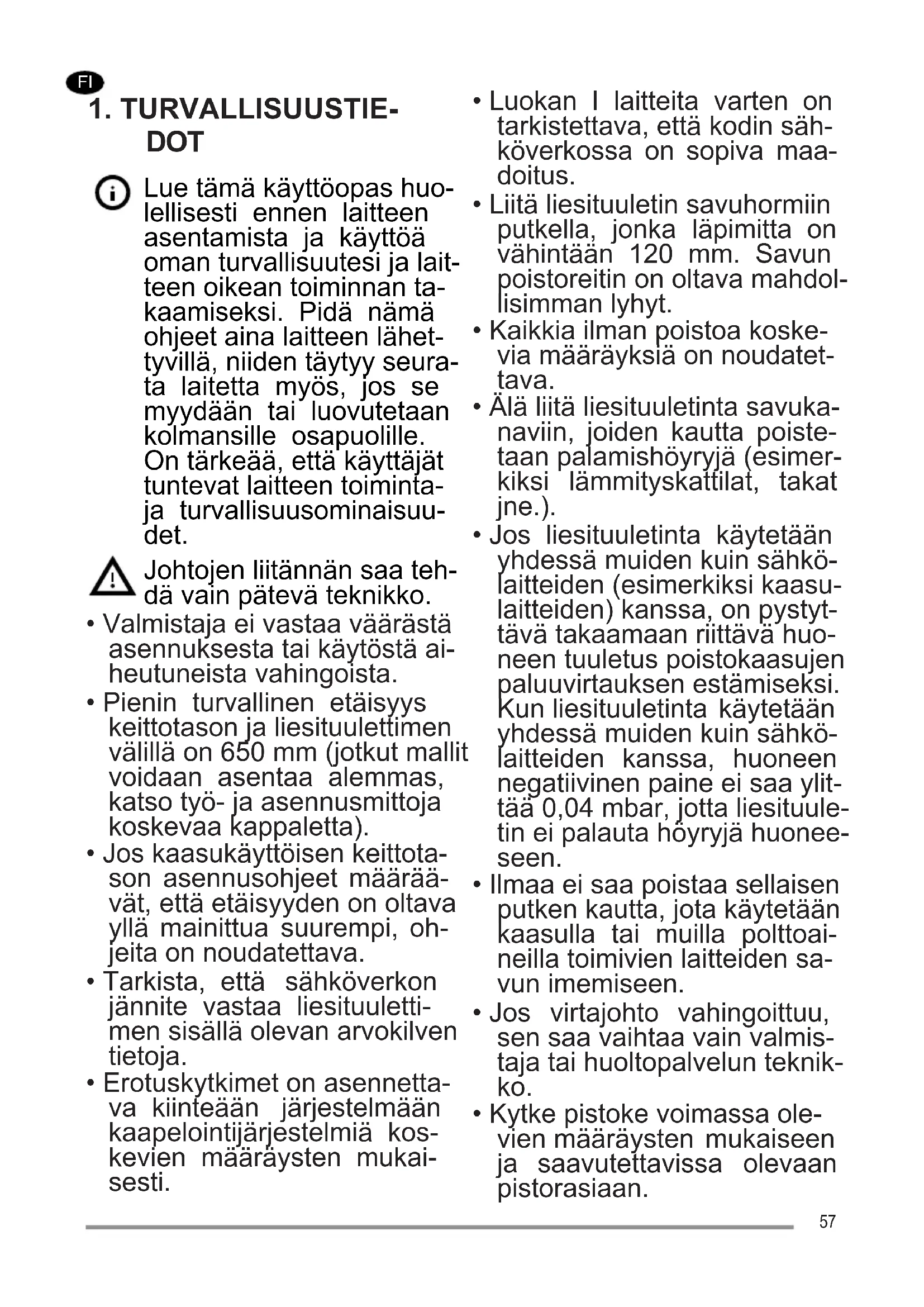 - Jos liesituuletinta käytetään yhdessä muiden kuin sähkö- laitteiden (esimerkiksi kaasu- laitteiden) kanssa, on pystyt- tävä takaamaan riittävä huo- neen tuuletus poistokaasujen paluuvirtauksen estämiseksi. Kun liesituuletinta käytetään yhdessä muiden kuin sähkö- laitteiden kanssa, huoneen negatiivinen paine ei saa ylit- tää 0,04 mbar, jotta liesituule- tin ei palauta höyryjä huonee- seen.