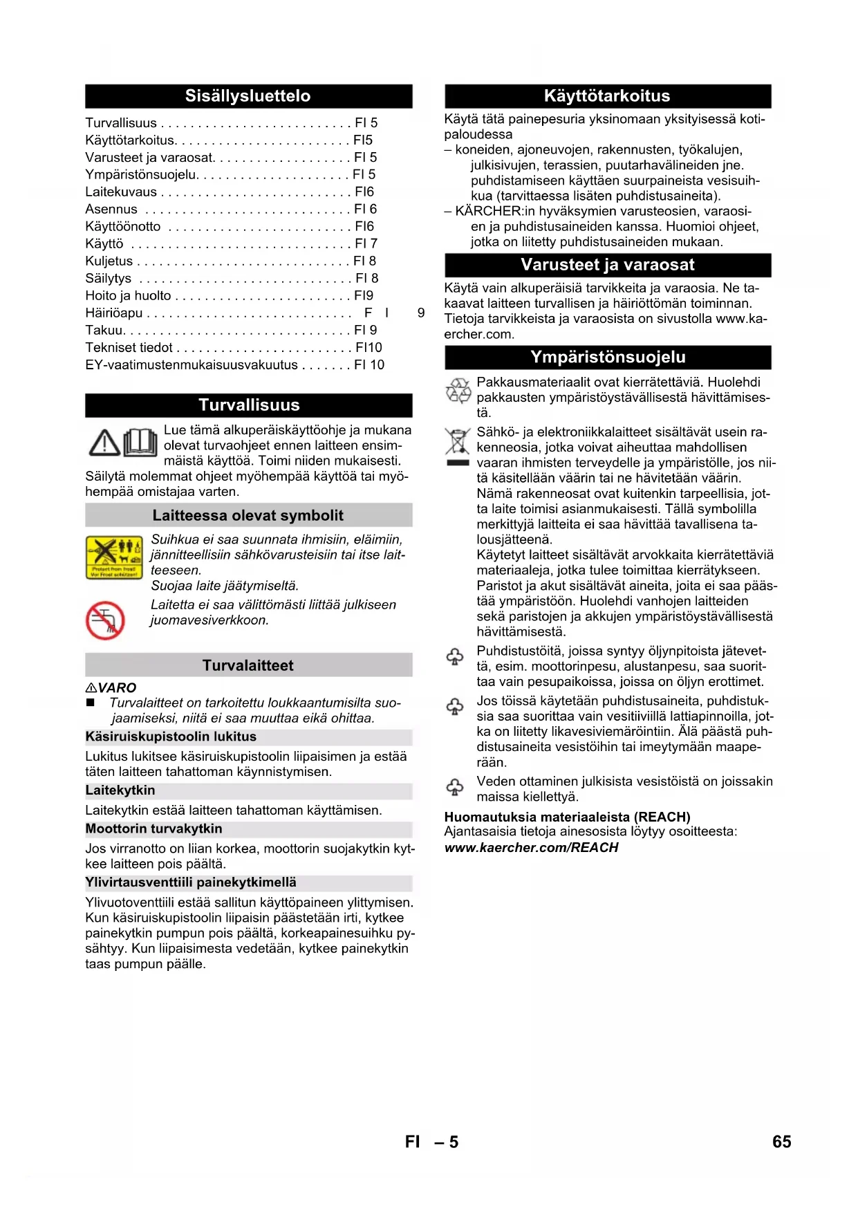 95 dB(A) Orsak till undantag enligt förordning (EU) 2019/1781 bilaga I avsnitt 2 (12): j) Tekniska ändringar förbehålls. EU-försäkran om överensstämmelse Produkt: Högtryckstvätt Typ: K 6 Special Tillämpliga EU-direktiv 2006/42/EG (+2009/127/EG) 2014/30/EU 2011/65/EU 2000/14/EG 2009/125/EG Tillämpade förordningar (EU) 2019/1781 Tillämpade harmoniserade normer EN 60335–1 EN 60335–2–79 EN 62233: 2008 EN 55014–1: 2017 + A11: 2020 EN 55014–2: 2015 EN 61000–3–2: 2014 EN 61000–3–11: 2000 EN IEC 63000: 2018 Tillämpad metod för överensstämmelsevärdering 2000/14/EG: Bilaga V Ljudeffektsnivå dB(A) Upmätt: 92 Garanterad: 95 Winnenden, 2021/06/01 Chairman of the Board of Management Director Regulatory Affairs & Certification 64 SV– 5 Lue tämä alkuperäiskäyttöohje ja mukana olevat turvaohjeet ennen laitteen ensim- mäistä käyttöä. Toimi niiden mukaisesti. Säilytä molemmat ohjeet myöhempää käyttöä tai myö- hempää omistajaa varten. 몇 VARO Turvalaitteet on tarkoitettu loukkaantumisilta suo- jaamiseksi, niitä ei saa muuttaa eikä ohittaa. Lukitus lukitsee käsiruiskupistoolin liipaisimen ja estää täten laitteen tahattoman käynnistymisen. Laitekytkin estää laitteen tahattoman käyttämisen. Jos virranotto on liian korkea, moottorin suojakytkin kyt- kee laitteen pois päältä. Ylivuotoventtiili estää sallitun käyttöpaineen ylittymisen. Kun käsiruiskupistoolin liipaisin päästetään irti, kytkee painekytkin pumpun pois päältä, korkeapainesuihku py- sähtyy. Kun liipaisimesta vedetään, kytkee painekytkin taas pumpun päälle. Käytä tätä painepesuria yksinomaan yksityisessä koti- paloudessa – koneiden, ajoneuvojen, rakennusten, työkalujen, julkisivujen, terassien, puutarhavälineiden jne. puhdistamiseen käyttäen suurpaineista vesisuih- kua (tarvittaessa lisäten puhdistusaineita). – KÄRCHER:in hyväksymien varusteosien, varaosi- en ja puhdistusaineiden kanssa. Huomioi ohjeet, jotka on liitetty puhdistusaineiden mukaan. Käytä vain alkuperäisiä tarvikkeita ja varaosia. Ne ta- kaavat laitteen turvallisen ja häiriöttömän toiminnan. Tietoja tarvikkeista ja varaosista on sivustolla www.ka- ercher.com. Huomautuksia materiaaleista (REACH) Ajantasaisia tietoja ainesosista löytyy osoitteesta: www.kaercher.com/REACH Sisällysluettelo Turvallisuus . . . . . . . . . . . . . . . . . . . . . . . . . . FI 5 Käyttötarkoitus. . . . . . . . . . . . . . . . . . . . . . . . FI5 Varusteet ja varaosat. . . . . . . . . . . . . . . . . . . FI 5 Ympäristönsuojelu. . . . . . . . . . . . . . . . . . . . . FI 5 Laitekuvaus . . . . . . . . . . . . . . . . . . . . . . . . . . FI6 Asennus . . . . . . . . . . . . . . . . . . . . . . . . . . . . FI 6 Käyttöönotto . . . . . . . . . . . . . . . . . . . . . . . . . FI6 Käyttö . . . . . . . . . . . . . . . . . . . . . . . . . . . . . . FI 7 Kuljetus . . . . . . . . . . . . . . . . . . . . . . . . . . . . . FI 8 Säilytys . . . . . . . . . . . . . . . . . . . . . . . . . . . . . FI 8 Hoito ja huolto . . . . . . . . . . . . . . . . . . . . . . . . FI9 Häiriöapu . . . . . . . . . . . . . . . . . . . . . . . . . . . .FI 9 Takuu. . . . . . . . . . . . . . . . . . . . . . . . . . . . . . . FI 9 Tekniset tiedot . . . . . . . . . . . . . . . . . . . . . . . . FI10 EY-vaatimustenmukaisuusvakuutus . . . . . . . FI 10 Turvallisuus Laitteessa olevat symbolit Suihkua ei saa suunnata ihmisiin, eläimiin, jännitteellisiin sähkövarusteisiin tai itse lait- teeseen. Suojaa laite jäätymiseltä. Laitetta ei saa välittömästi liittää julkiseen juomavesiverkkoon. Turvalaitteet Käsiruiskupistoolin lukitus Laitekytkin Moottorin turvakytkin Ylivirtausventtiili painekytkimellä Käyttötarkoitus Varusteet ja varaosat Ympäristönsuojelu Pakkausmateriaalit ovat kierrätettäviä. Huolehdi pakkausten ympäristöystävällisestä hävittämises- tä. Sähkö- ja elektroniikkalaitteet sisältävät usein ra- kenneosia, jotka voivat aiheuttaa mahdollisen vaaran ihmisten terveydelle ja ympäristölle, jos nii- tä käsitellään väärin tai ne hävitetään väärin. Nämä rakenneosat ovat kuitenkin tarpeellisia, jot- ta laite toimisi asianmukaisesti. Tällä symbolilla merkittyjä laitteita ei saa hävittää tavallisena ta- lousjätteenä. Käytetyt laitteet sisältävät arvokkaita kierrätettäviä materiaaleja, jotka tulee toimittaa kierrätykseen. Paristot ja akut sisältävät aineita, joita ei saa pääs- tää ympäristöön. Huolehdi vanhojen laitteiden sekä paristojen ja akkujen ympäristöystävällisestä hävittämisestä. Puhdistustöitä, joissa syntyy öljynpitoista jätevet- tä, esim. moottorinpesu, alustanpesu, saa suorit- taa vain pesupaikoissa, joissa on öljyn erottimet. Jos töissä käytetään puhdistusaineita, puhdistuk- sia saa suorittaa vain vesitiiviillä lattiapinnoilla, jot- ka on liitetty likavesiviemäröintiin. Älä päästä puh- distusaineita vesistöihin tai imeytymään maape- rään. Veden ottaminen julkisista vesistöistä on joissakin maissa kiellettyä. 65FI– 6 Laitteen toimituslaajuus on kuvattu pakkauksessa. Tar- kasta purkaessasi laitetta pakkauksesta pakkauksen si- sällön täydellisyys. Ota yhteys jälleenmyyjään, jos varusteita puuttuu tai ha- vaitset kuljetusvahinkoja. Kuvat, katso sivu 2 1 Suodattimella varustettu vesiliitäntä 2 Tulovesiliitäntä 3 Korkeapaineletkun pikaliitin 4 Pesukahvan säilytyspaikka 5 Laitekytkin „0/OFF“ / „I/ON“ 6 Puhdistusaineen annostelusäädin 7 Pesukahvan säilytyspaikka 8 Kuljetuskahva 9 Plug 'n' Clean -puhdistusainepullo sulkutulpalla 10 Plug 'n' Clean -puhdistusainepullon säilytyspaikka puhdistusaineliitännällä 11 Pidike korkeapaineletkulle 12 Pidike suihkuputkelle 13 Verkkoliitäntäjohdon säilytyskoukku 14 Verkkojohto, jossa on verkkopistoke 15 Kuljetuspyörä 16 Pesukahva 17 Käsiruiskupistoolin lukitus 18 Painike korkeapaineletkun irroittamiseksi käsiruis- kupistoolista 19 Korkeapaineletku 20 S