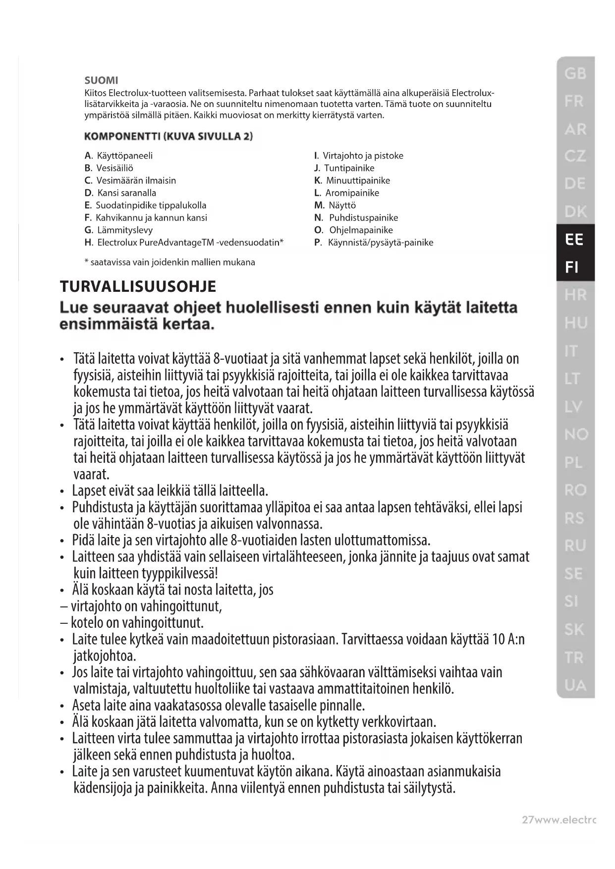 Sümboliga tähistatud materjalid võib ringlusse suunata. Selleks viige pakendid vastavatesse konteineritesse. Aidake hoida keskkonda ja inimeste tervist ja suunake elektri- ja elektroonilised jäätmed ringlusse. Ärge visake sümboliga tähistatud seadmeid muude majapidamisjäätmete hulka. Viige seade kohalikku ringluspunkti või pöörduge abi saamiseks kohalikku omavalitsusse.SUOMI Kiitos Electrolux-tuotteen valitsemisesta. Parhaat tulokset saat käyttämällä aina alkuperäisiä Electrolux- lisätarvikkeita ja -varaosia. Ne on suunniteltu nimenomaan tuotetta varten. Tämä tuote on suunniteltu ympäristöä silmällä pitäen. Kaikki muoviosat on merkitty kierrätystä varten. A. Käyttöpaneeli B. Vesisäiliö C. Vesimäärän ilmaisin D. Kansi saranalla E. Suodatinpidike tippalukolla F. Kahvikannu ja kannun kansi G. Lämmityslevy H. Electrolux PureAdvantageTM -vedensuodatin*