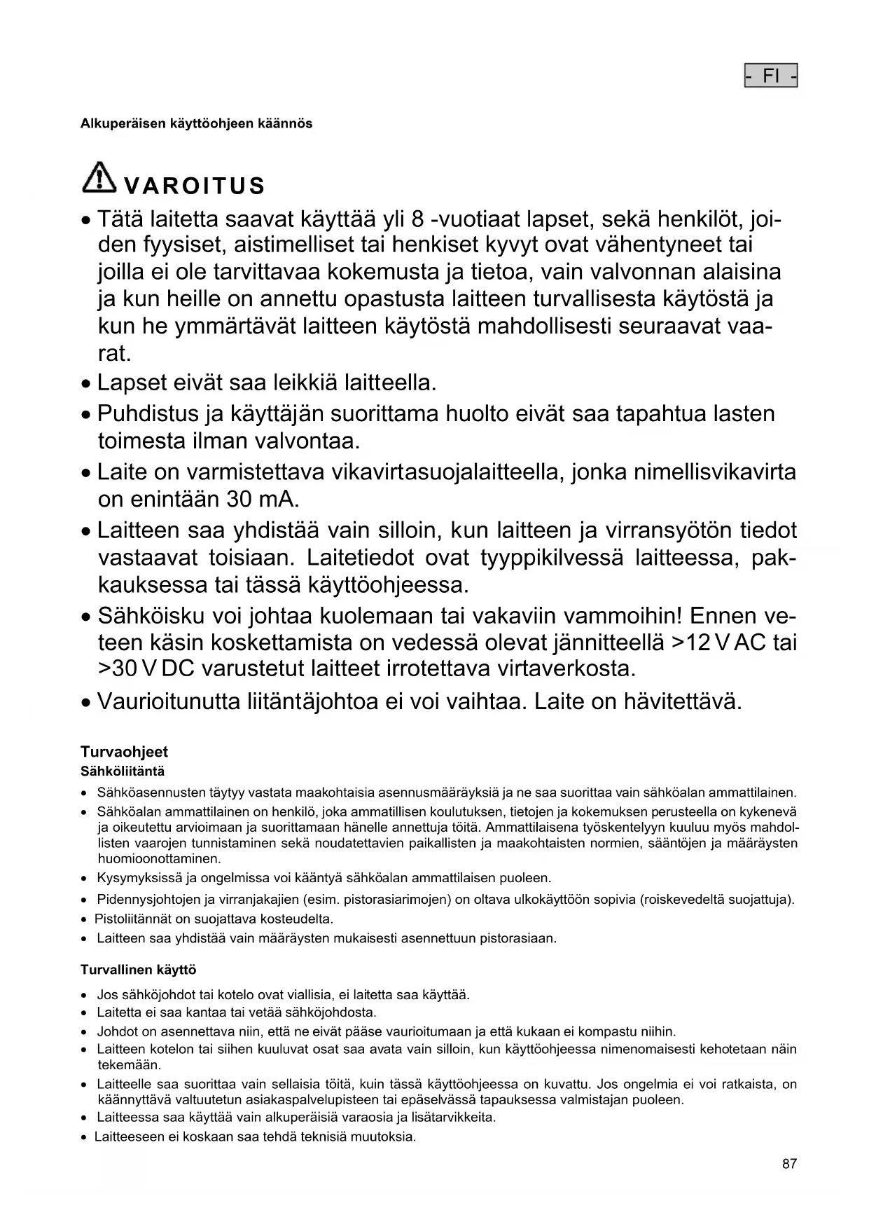 - Laite on varmistettava vikavirtasuojalaitteella, jonka nimellisvikavirta on enintään 30 mA.
