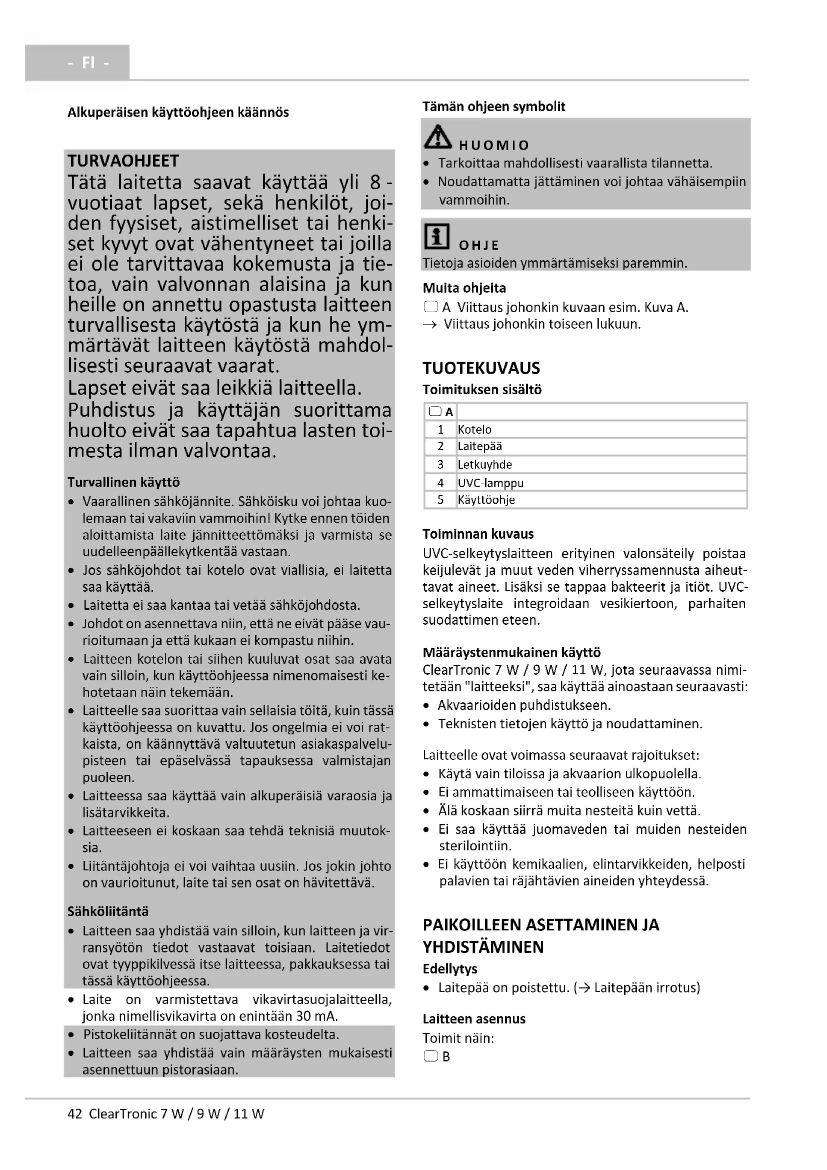 Toiminnan kuvaus UVC-selkeytyslaitteen erityinen valonsäteily poistaa keijulevät ja muut veden viherryssamennusta aiheut- tavat aineet. Lisäksi se tappaa bakteerit ja itiöt. UVC- selkeytyslaite integroidaan vesikiertoon, parhaiten suodattimen eteen. Määräystenmukainen käyttö ClearTronic 7 W / 9 W / 11 W, jota seuraavassa nimi- tetään "laitteeksi", saa käyttää ainoastaan seuraavasti: