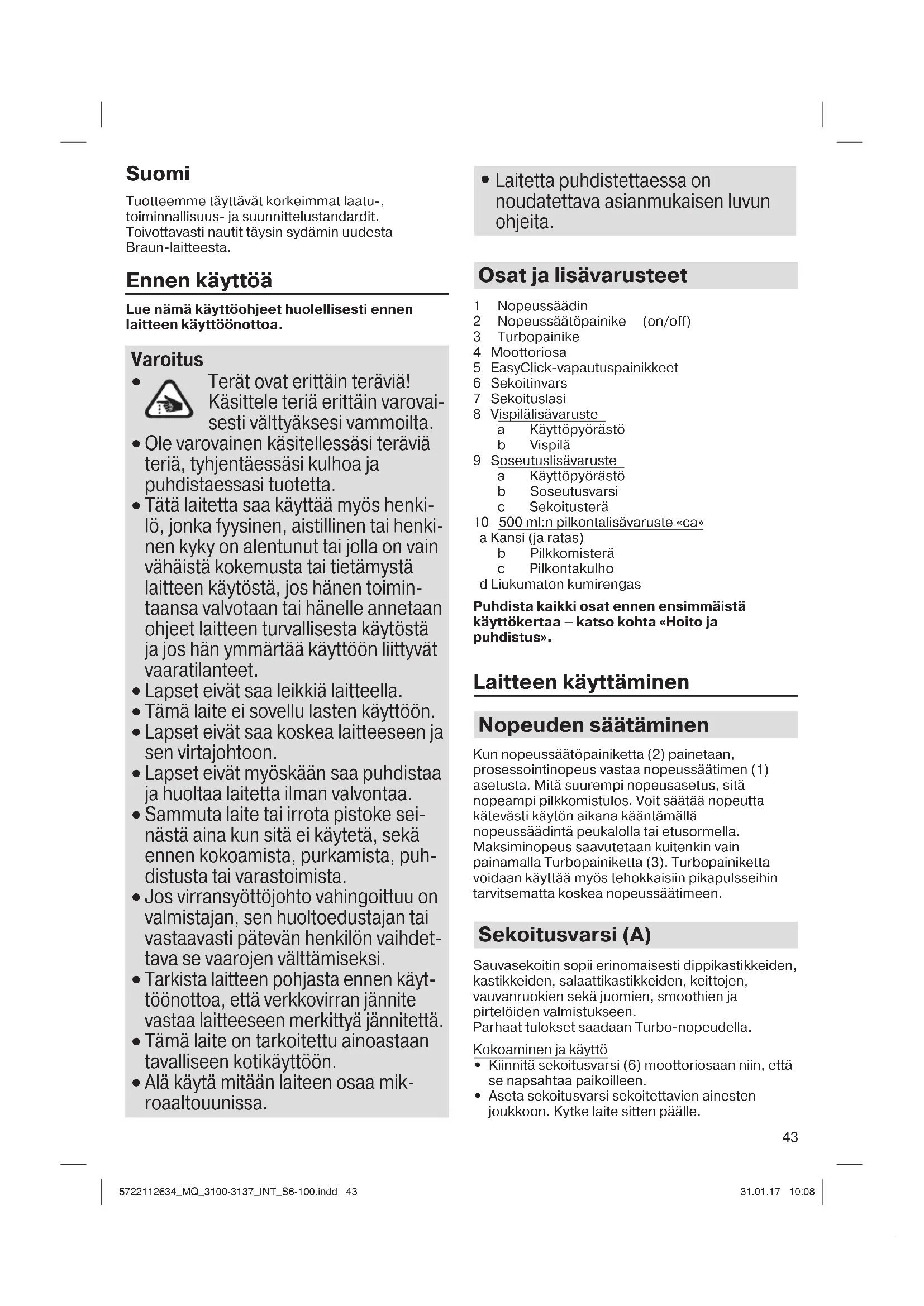 - Aseta sekoitusvarsi sekoitettavien ainesten joukkoon. Kytke laite sitten päälle. 5722112634_MQ_3100-3137_INT_S6-100.indd 435722112634_MQ_3100-3137_INT_S6-100.indd 43 31.01.17 10:0831.01.17 10:0844