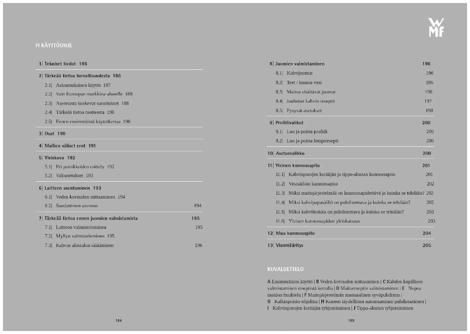 8|Juomien valmistaminen 196 8.1|Kahvijuomat 196 8.2|Teet / kuuma vesi 196 8.3|Maitoa sisältävät juomat 196 8.4|Jauhetun kahvin reseptit 197 8.5|Pysyvät asetukset 198 9|Profiilivalikot 200 9.1|Luo ja poista profiili 200 9.2|Luo ja poista lempiresepti 200 10|Asetusvalikko 200 11|Yleinen kunnossapito 201 11.1|Kahvinporojen kerääjän ja tippa-alustan kunnossapito 201 11.2|Vesisäiliön kunnossapito 202 11.3|Miksi maitojärjestelmää on kunnossapidettävä ja kuinka se tehdään? 202 11.4|Miksi kahvipapusäiliö on puhdistettava ja kuinka se tehdään? 202 11.5|Miksi kahviluukku on puhdistettava ja kuinka se tehdään? 203 11.6|Yleisen kunnossapidon yleiskatsaus 203 12|Muu kunnossapito 204 13|Vianmääritys 205 KUVALUETTELO A Ensimmäinen käyttö | B Veden kovuuden mittaaminen | C Kahden kupillisen valmistaminen reseptistä kerralla | D Maitoreseptin valmistaminen | ENopea maidon huuhtelu | F Maitojärjestelmän manuaalinen syväpuhdistus | GKalkinpoisto-ohjelma | H Koneen täydellinen automaattinen puhdistaminen | IKahvinporojen kerääjän tyhjentäminen | J Tippa-alustan tyhjentäminen
