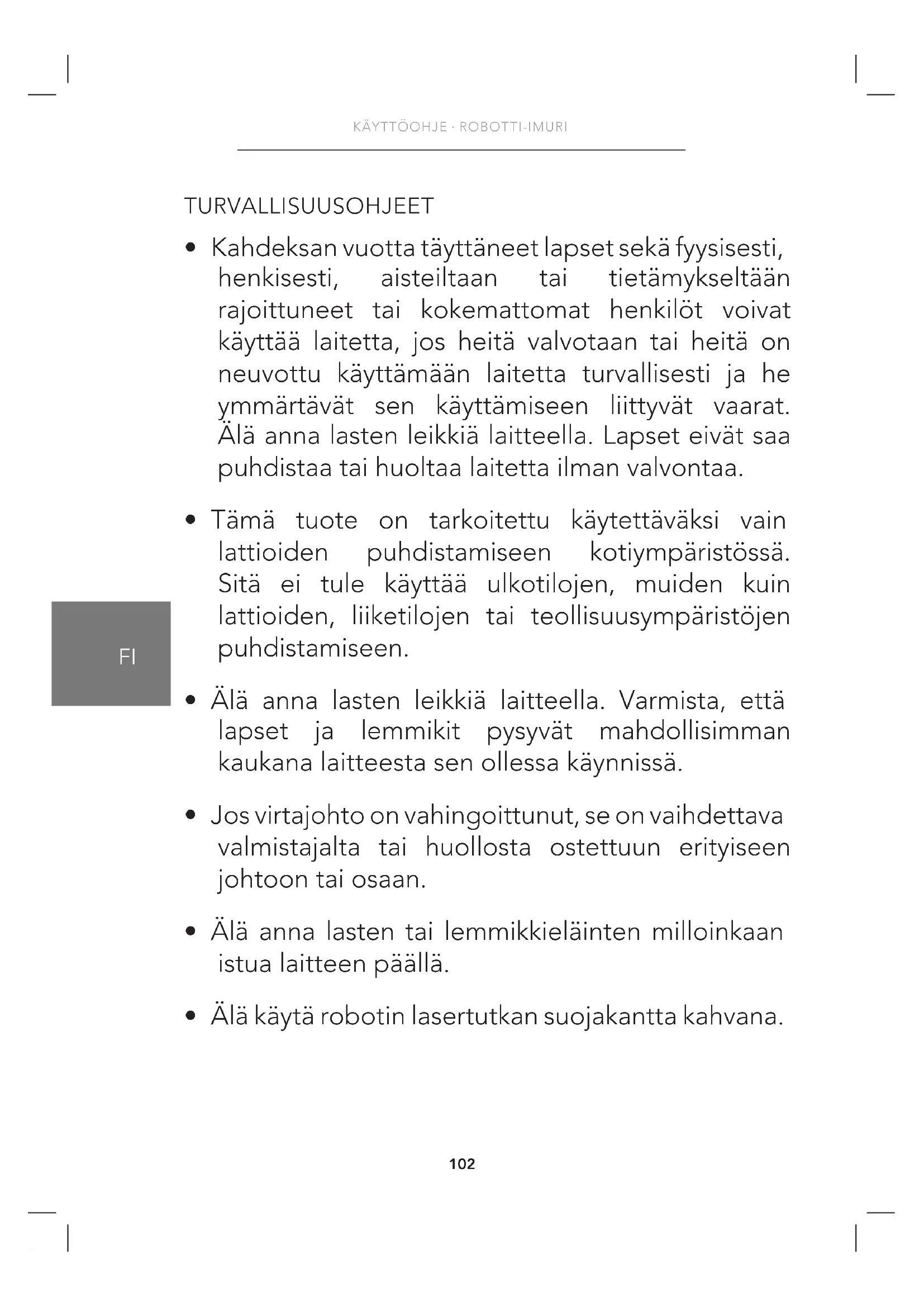 Puhdista robotin etuosan ja ala-anturin pinnat pölyn poistamiseksi. Etuanturissa, reuna-IR-anturissa tai pudotusanturissa on pölyä. Puhdista se. Pudotusanturi ei toimi. Puhdista se ja siirrä uuteen paikkaan. Pudotusanturissa voi olla likaa. Puhdista se ja siirrä uuteen paikkaan. Lasertutkan edessä on jotakin. Tarkasta lasertutka Ylätornin tutkan edessä on jotakin ja reititys epäonnistuu. Poista este. Pölysäiliötä ei ole puhdistettu pitkään aikaan. Puhdista se välittömästi. Pölysäiliö on täynnä. Tyhjennä se. Virtuaalinen seinä tai kielletty alue havaittu. Siirrä robotti pois kyseiseltä alueelta. Robotti on kohdannut virtuaalisen seinän tai kielletyn alueen. Siirrä se pois alueelta. Laite on jumissa. Poista mahdolliset esteet laitteen ympäriltä ja yritä uudelleen. Aseta laite takaisin asemaan. Robotti on jumissa jonkin sen ympärillä olevan esteen vuoksi. Poista mahdolliset esteet. Robotti ei löydä asemaa. Aseta se manuaalisesti takaisin asemaan. Uusi ympäristö on havaittu. Aloita puhdistustehtävä uudelleen. Robotti on uudessa ympäristössä, eikä karttoja ole vielä luotu. Aloita imurointi uudelleen.121