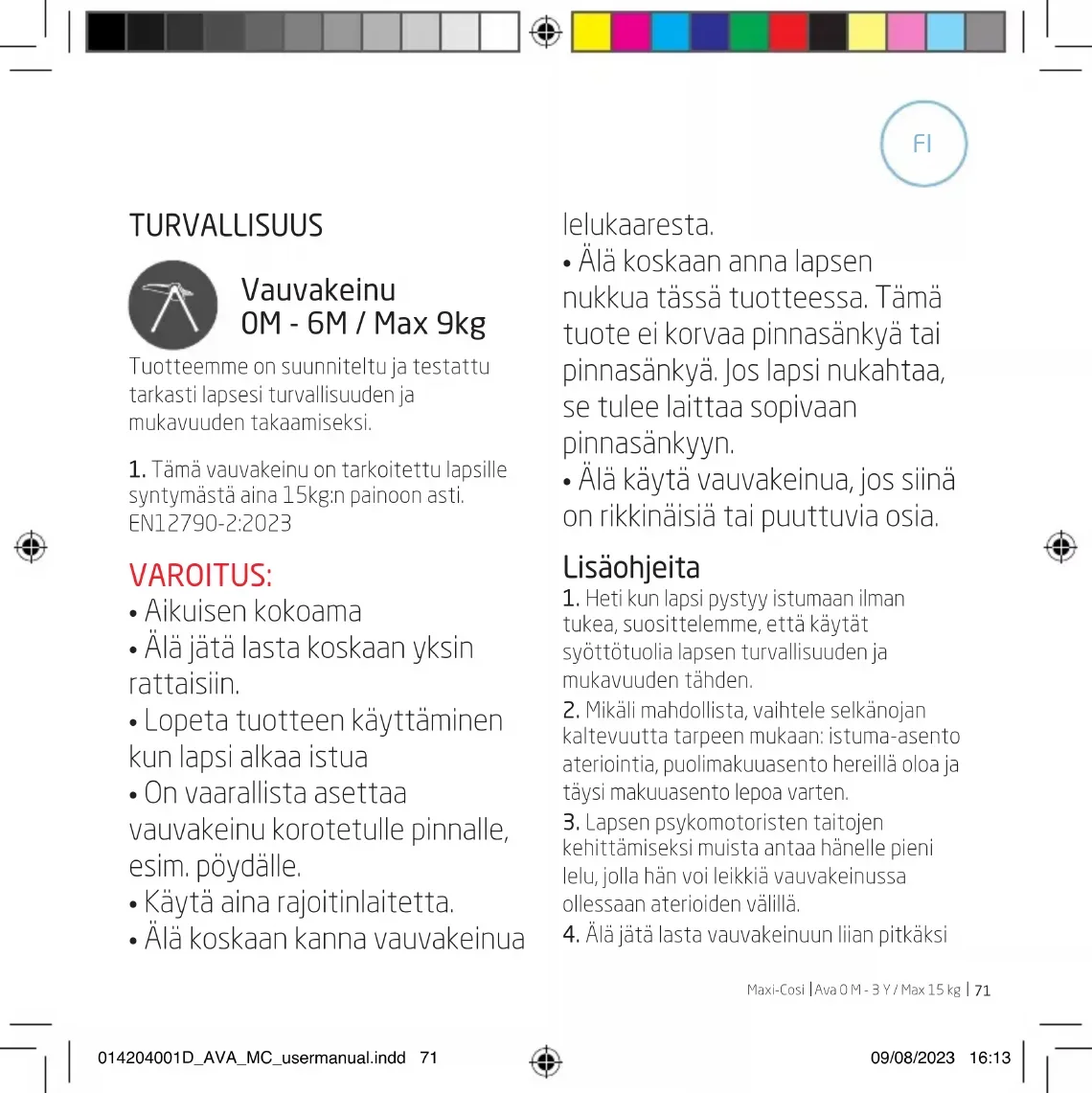 - Päällyskankaan pesua varten katso siinä olevaa ohjemerkintää. Ympäristö Ympäristönsuojelun kannalta on tärkeää, että kun et enää käytä tätä tuotetta, hävität sen asianmukaisesti paikallisten määräysten mukaisesti. Kysyttävää Ota yhteys paikalliseen valtuutettuun jälleenmyyjään tai vieraile kotisivuillamme. Kun teet niin, pidä seuraavat tiedot saatavilla: - Sarjanumero - Lapsen ikä, pituus ja paino. 014204001D_AVA_MC_usermanual.indd 73014204001D_AVA_MC_usermanual.indd 73 09/08/2023 16:1309/08/2023 16:1374 Ava 0 M -3 Y / Max 15 kg